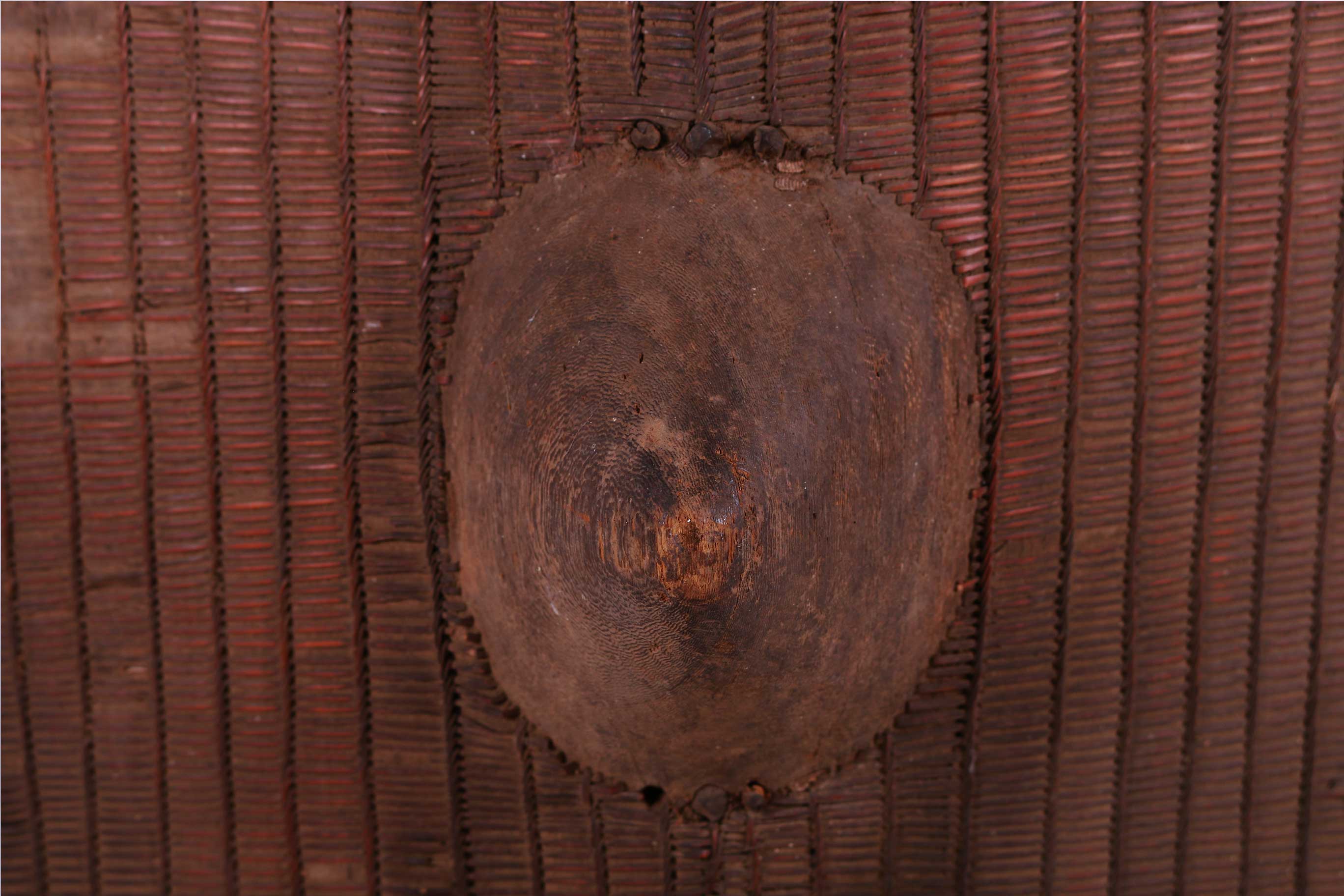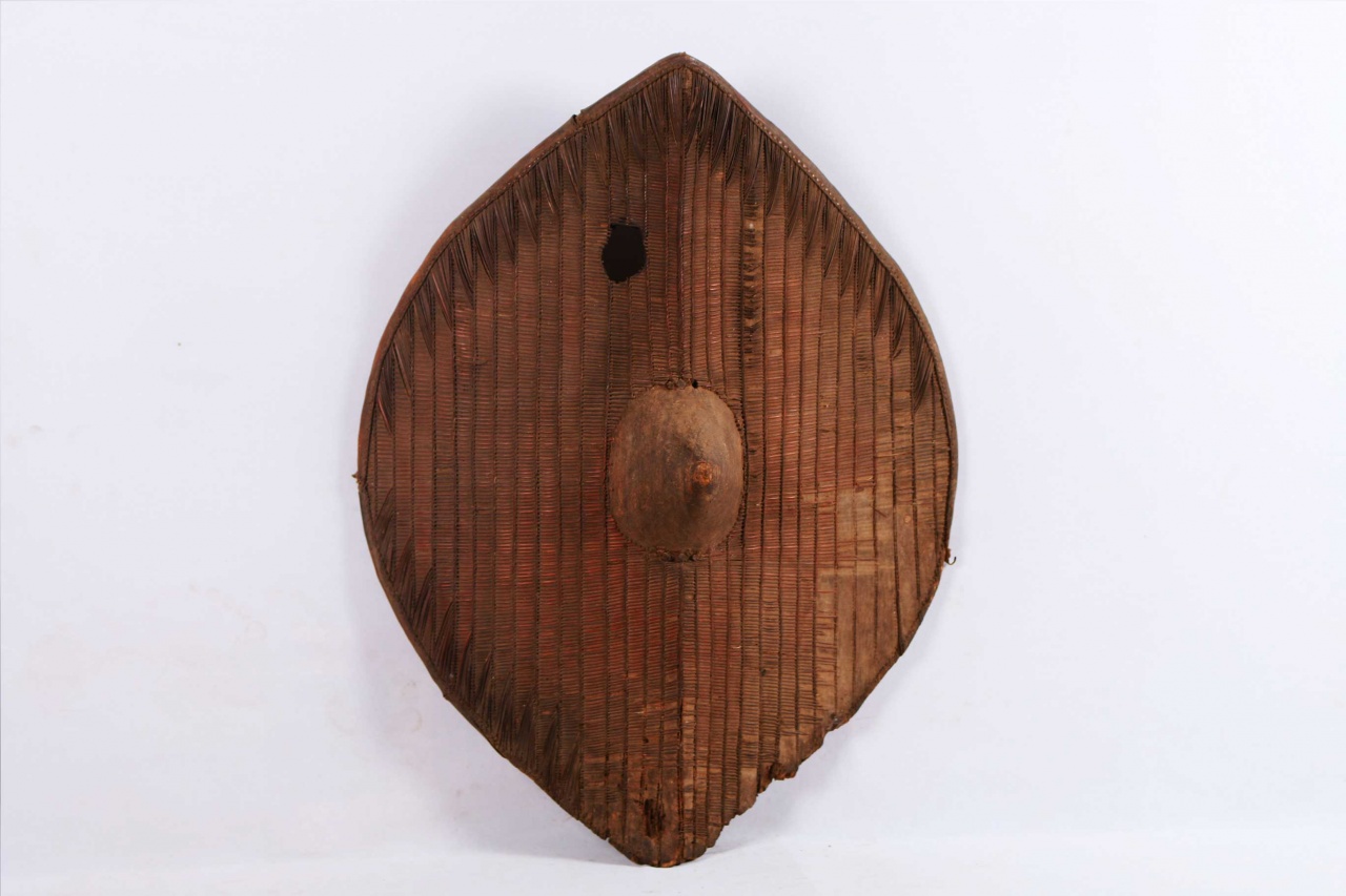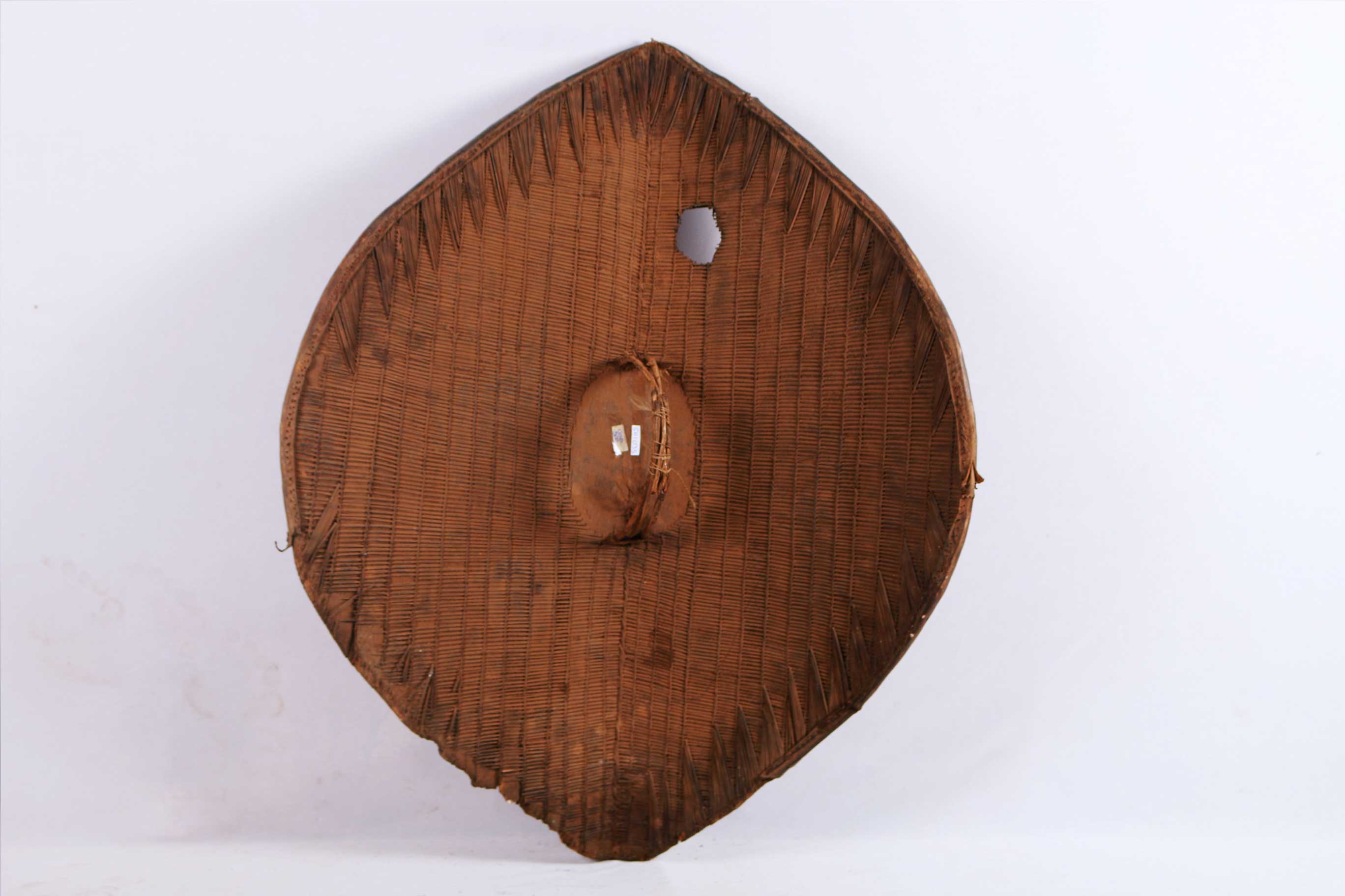 Such wicker-covered shields were carried by the Ganda/Baganda/Waganda north of lake Victoria and by the Basoga in Uganda. Among the shields from this region, this is one of the most striking. Wicker shields were made of lightweight wood stitched together with twine from a climbing plant. It has horizontal lines running from the rim to the middle of the shield. The handle on the inner side has bent wooden sticks tied together my fibre strings.
