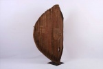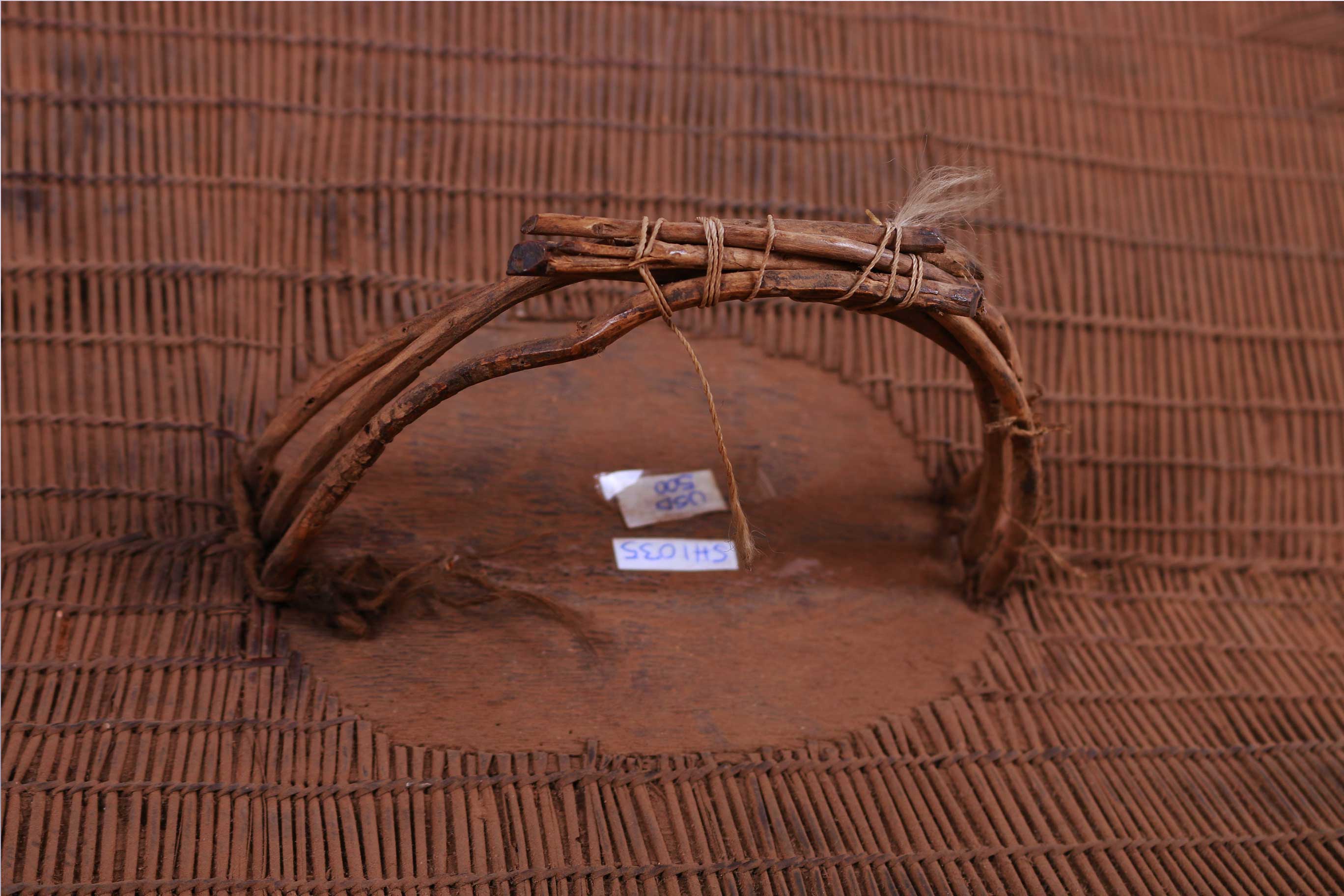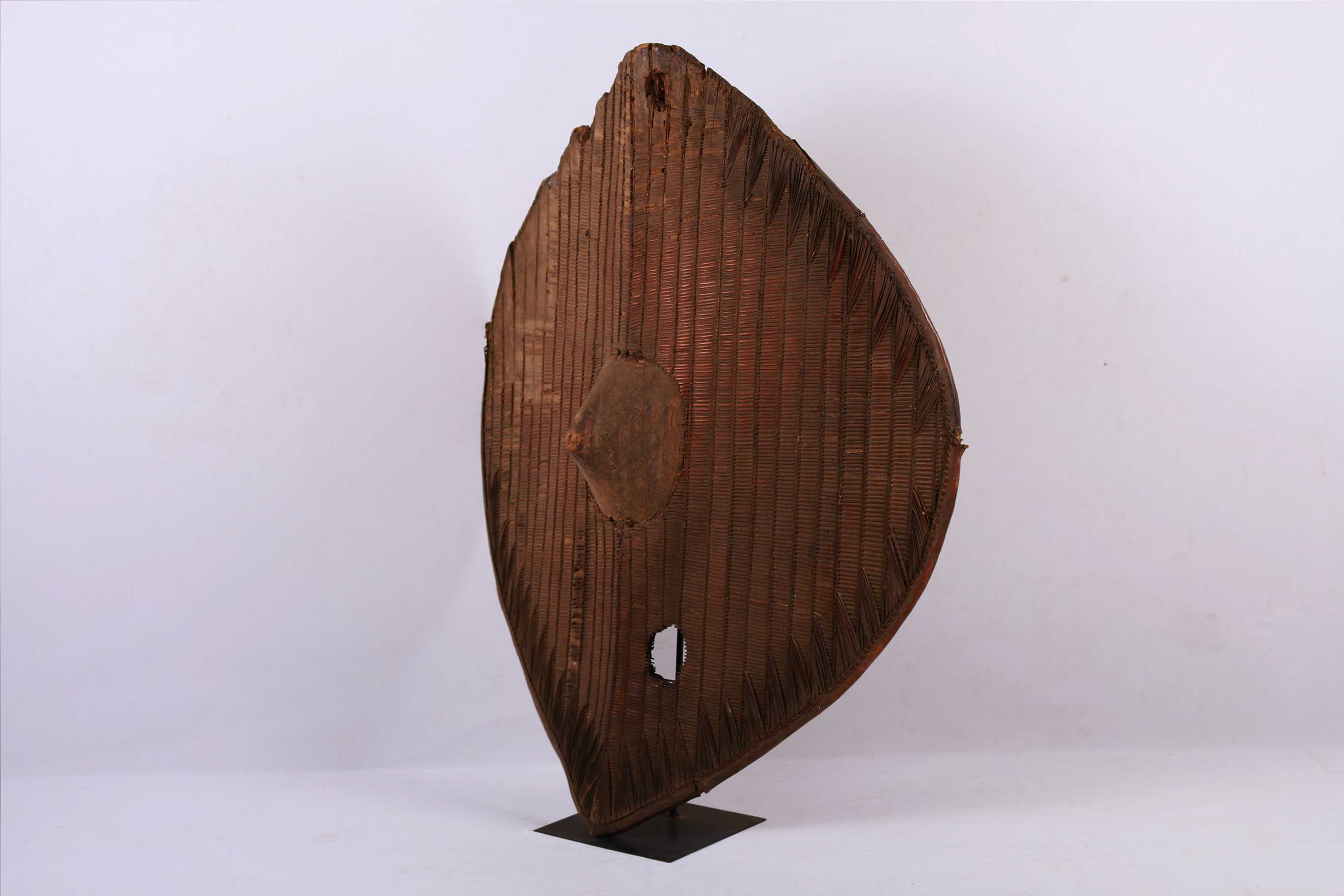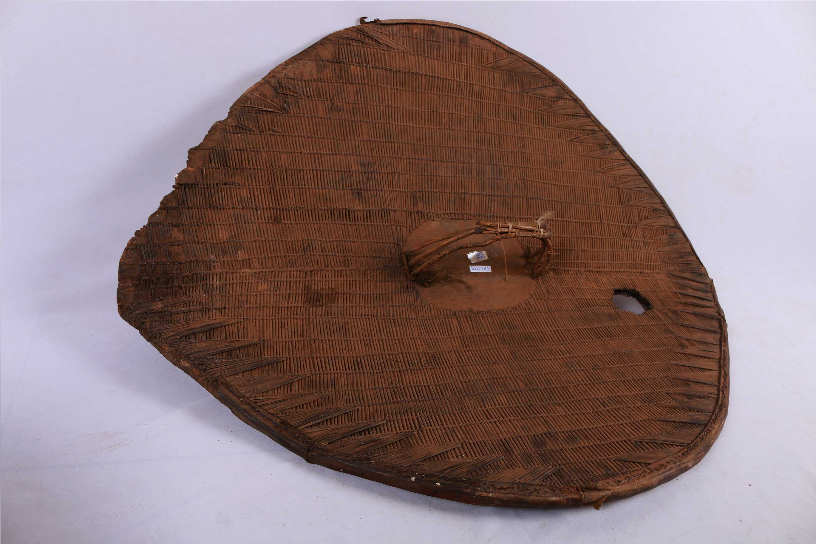 Such wicker-covered shields were carried by the Ganda/Baganda/Waganda north of lake Victoria and by the Basoga in Uganda. Among the shields from this region, this is one of the most striking. Wicker shields were made of lightweight wood stitched together with twine from a climbing plant. It has horizontal lines running from the rim to the middle of the shield. The handle on the inner side has bent wooden sticks tied together my fibre strings.
