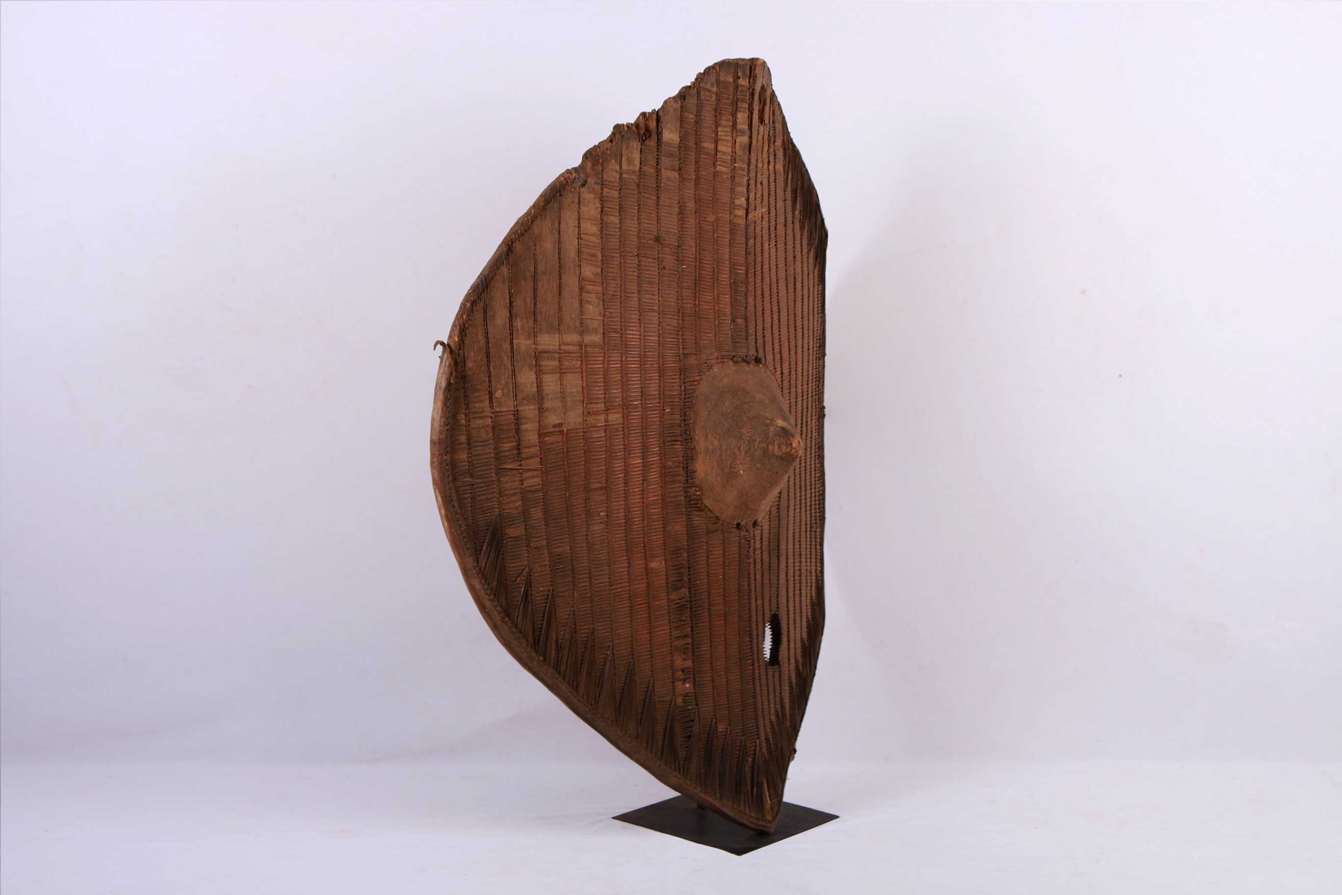Wicker shields display the high artistic quality of their workmanship and their elegance. Shields among African cultures were used in different ways. Used during initiation of young boys, ritual ceremonies and of course in wars. Since they were always in armed conflicts with each other. This is an old shield with visible traces of usage around the handle.