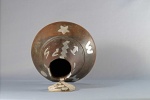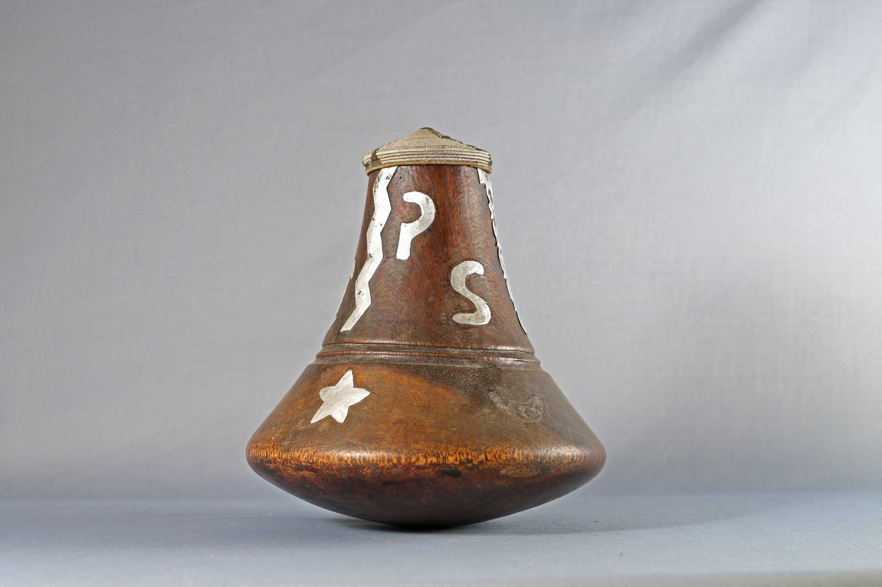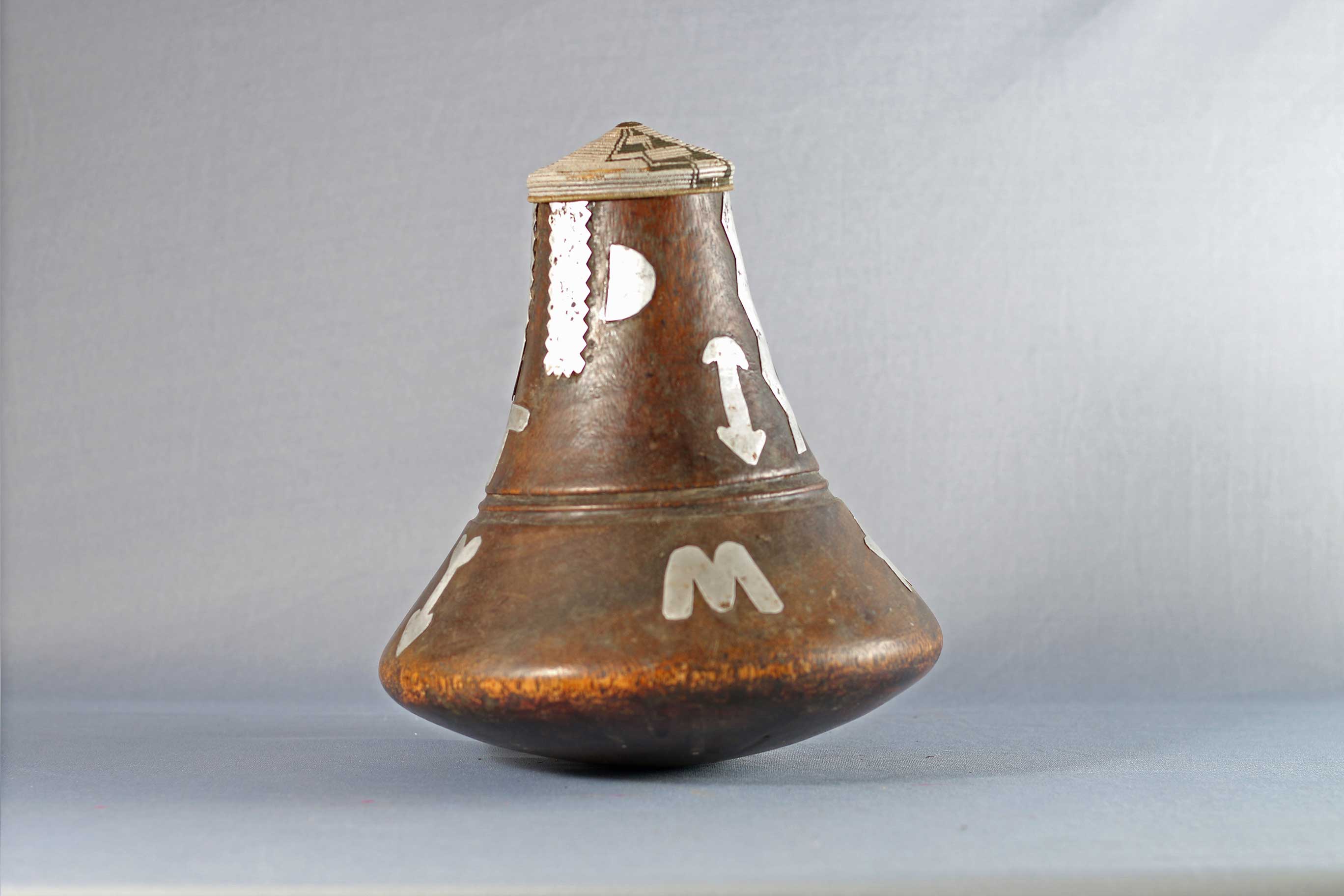 The Banyankole are among the half dozen major ethnic groups in Uganda. They live in southwestern Uganda, where there is a common border with Rwanda and Tanzania. The Banyankole consists of two major ethnic groups: the Bahima, who are pastoralists, and the Bairu, who are agriculturists. The Bairu are numerically larger, and the Bahima are politically and socially dominant. A fascinating Ankole milk cup which is of Ugandan origin, is a carved wood milk vessel, from the Ankole tribe living in Uganda, it has metallic symbols including stars and letters and a fiber crafted lid to cover the vessel, a wide cylindrical bottom, and a brown patina, it shows signs of age. These statuettes were used for rituals and other important ceremonies and also acted as milk containers.