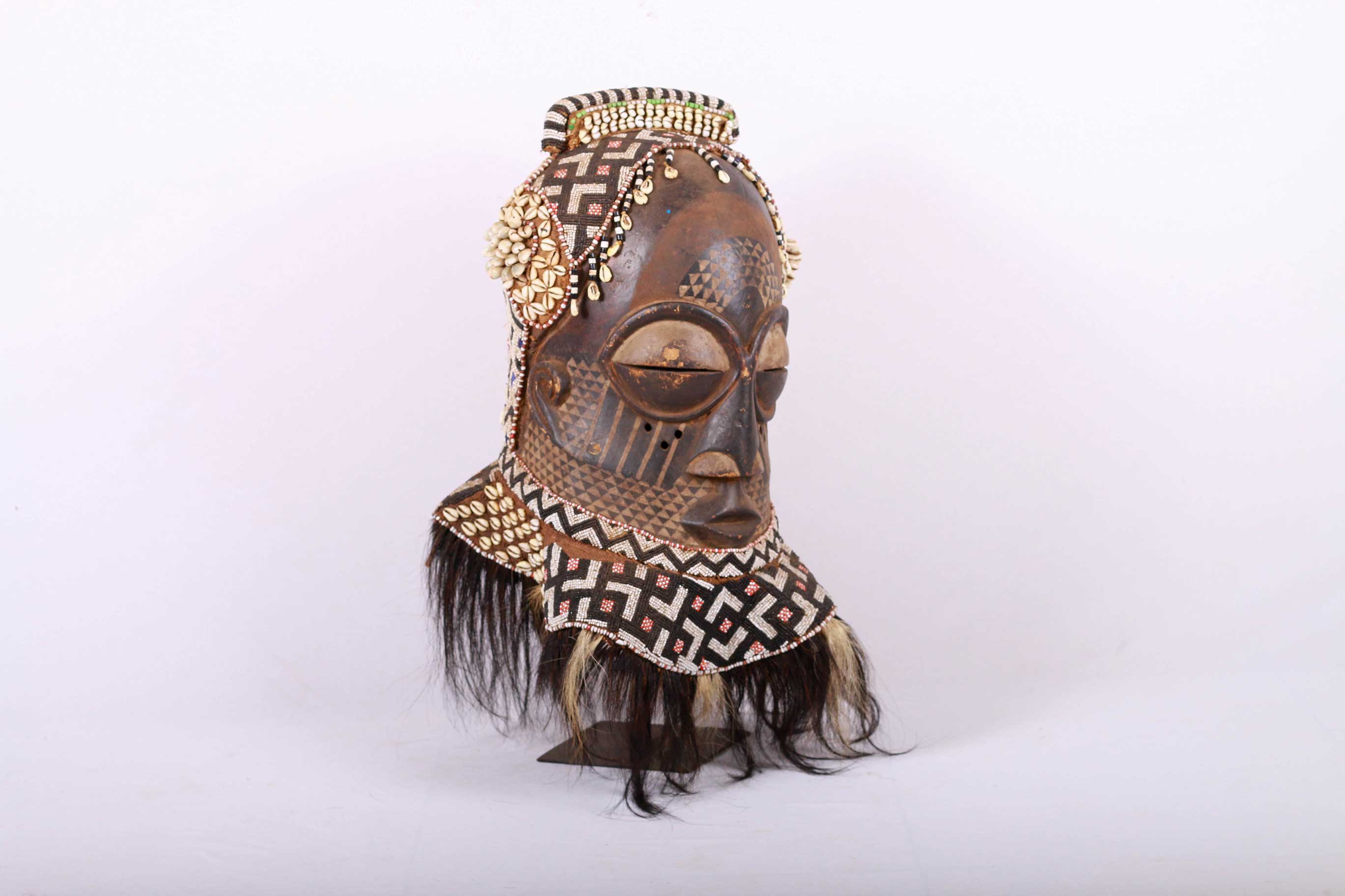 This is a sculpturally powerful Kuba mask helmet with an immense triangular nose, closed eyes, mouth, and carefully sculpted ears. It has a beaded decoration mixed with cowrie shells in the form of a trident-like pattern attached to strips of cloth at the top and bottom of the mask. At the bottom of the mask is attached animal hide and Rafia leaflets.