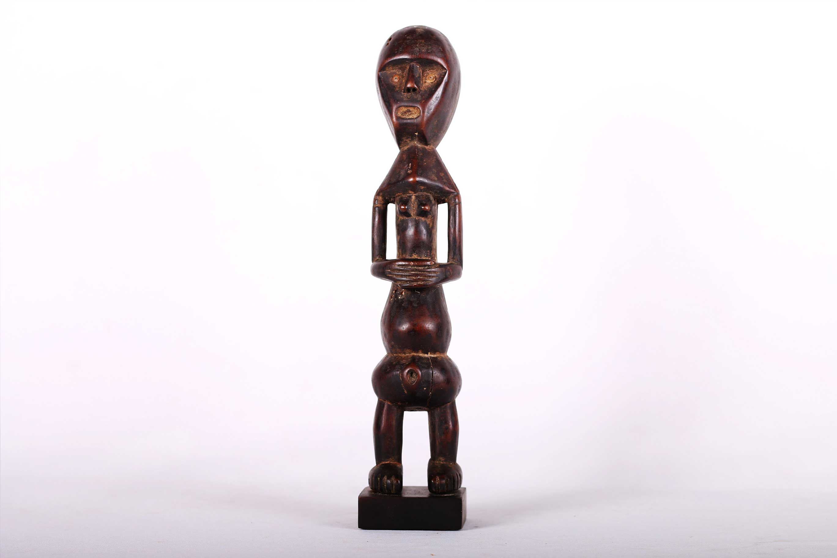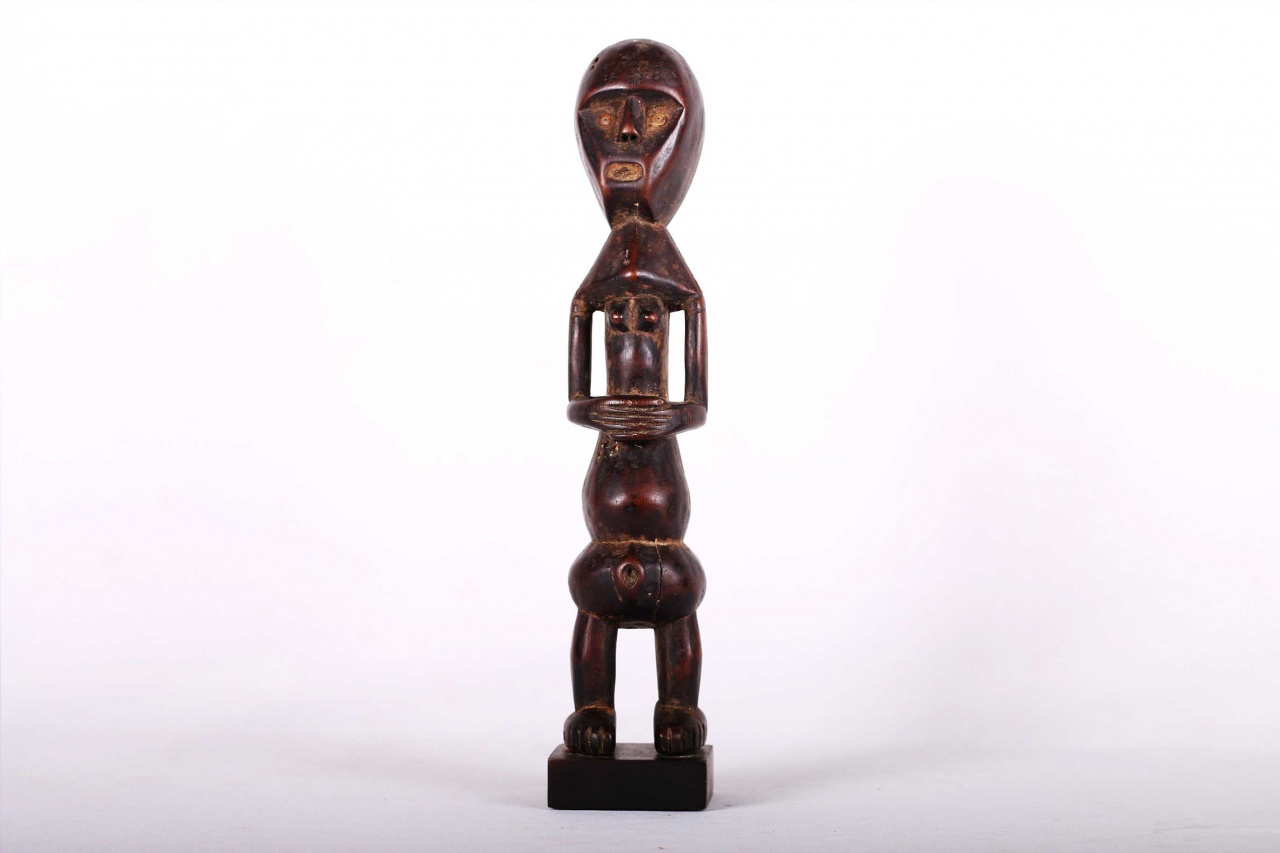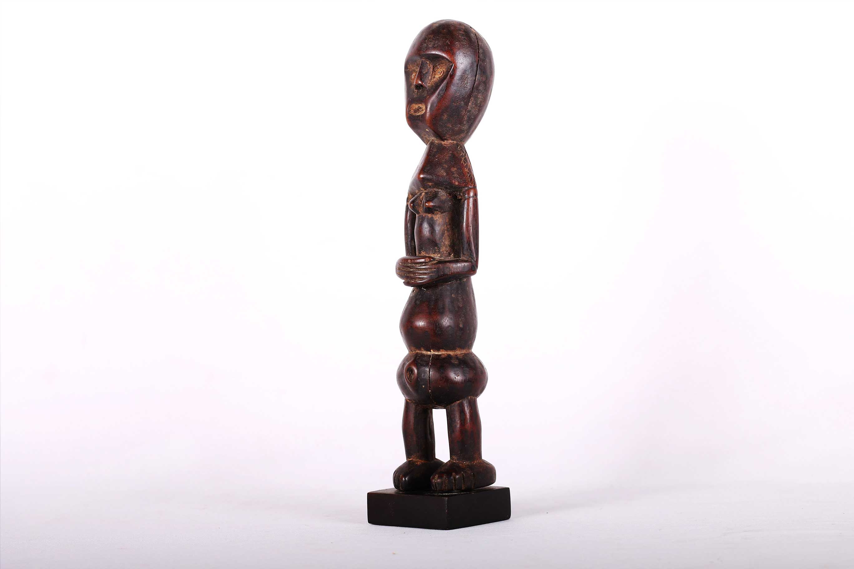 The Bali are located in the Eastern Democratic Republic of the Congo, statues and tribal art in general from this region is quite rare and hence not a lot of information is known on the functionality of the figures from this tribe, we are yet to ascertain the function of this mask. This is an old female Bali statue with a shiny dark brown patina,this standing figure has a stunning face and quite elaborate features, it is without a doubt an old bush collected figure.