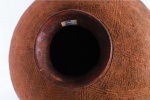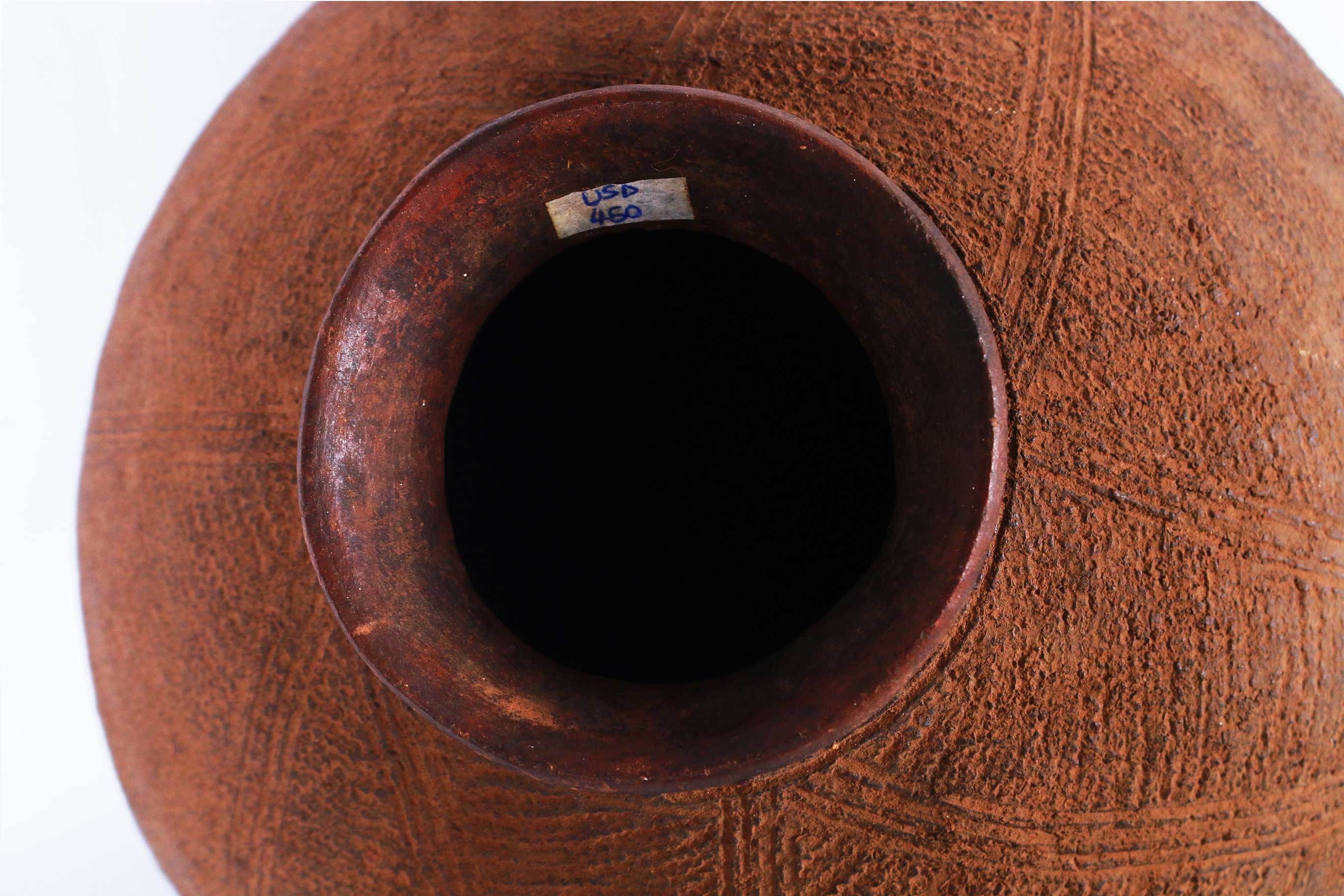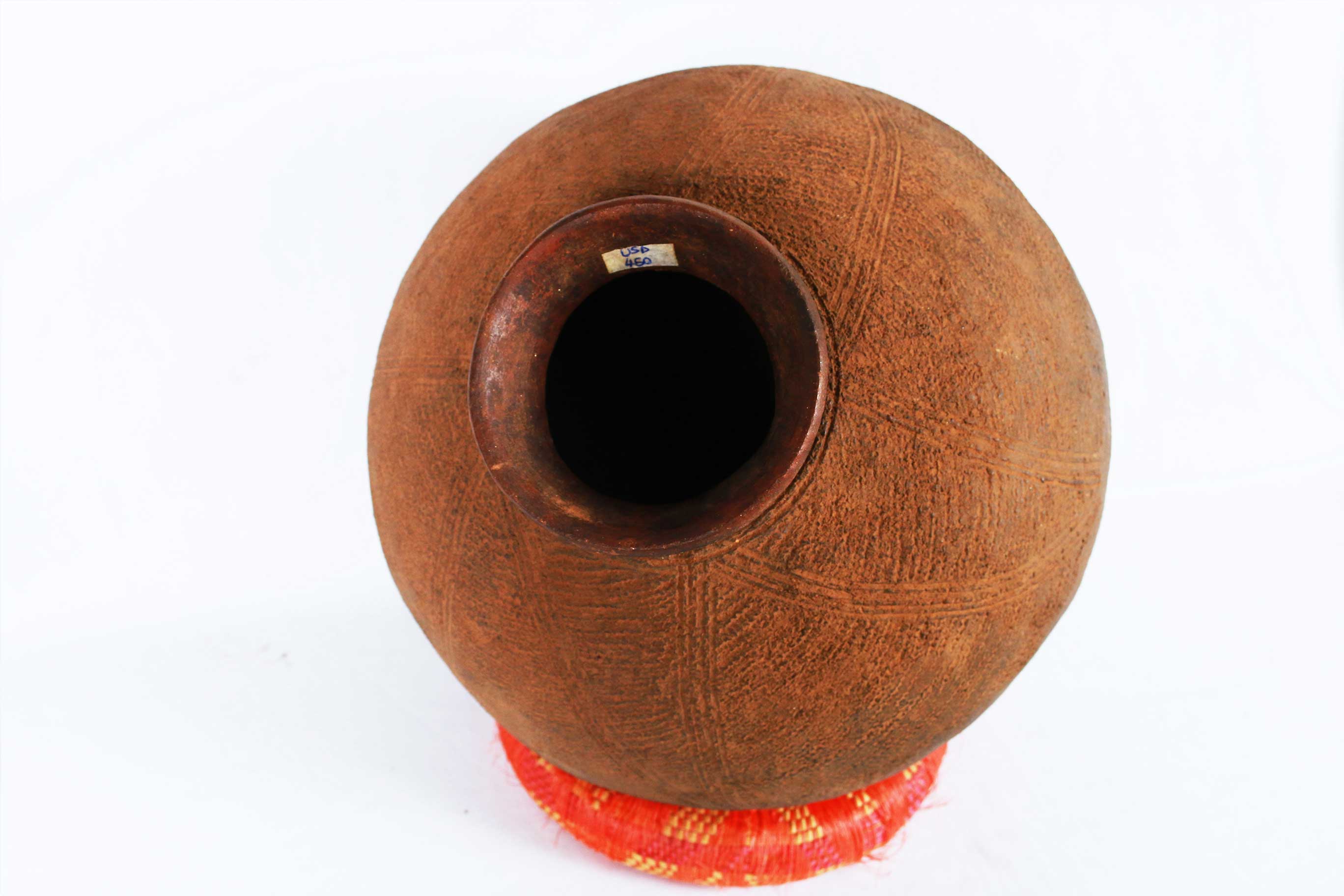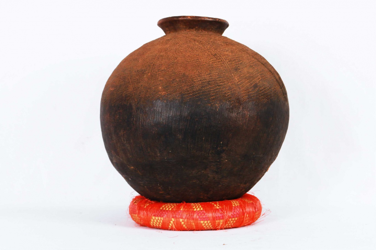 The Batwa pygmies of central Africa were the earliest inhabitants of the area, being later joined by Bantu agriculturalists who migrated over time from West Africa. As hunter-gathers, theirs has been a nomadic lifestyle of the forest and surrounding areas. Over several thousand years, Batwa in our area became the specialists paramount in the making of clay cooking pots for the settled Bantu communities, from whom cultivated crops and other items would be traded for the pots. It is the women who are the potters. Men are responsible for the extraction and transport of clay, which is a heavy and time-consuming task. All of the other work is up to the women. The pots are usually brought to market to be sold or exchanged. The following pot shows good age.