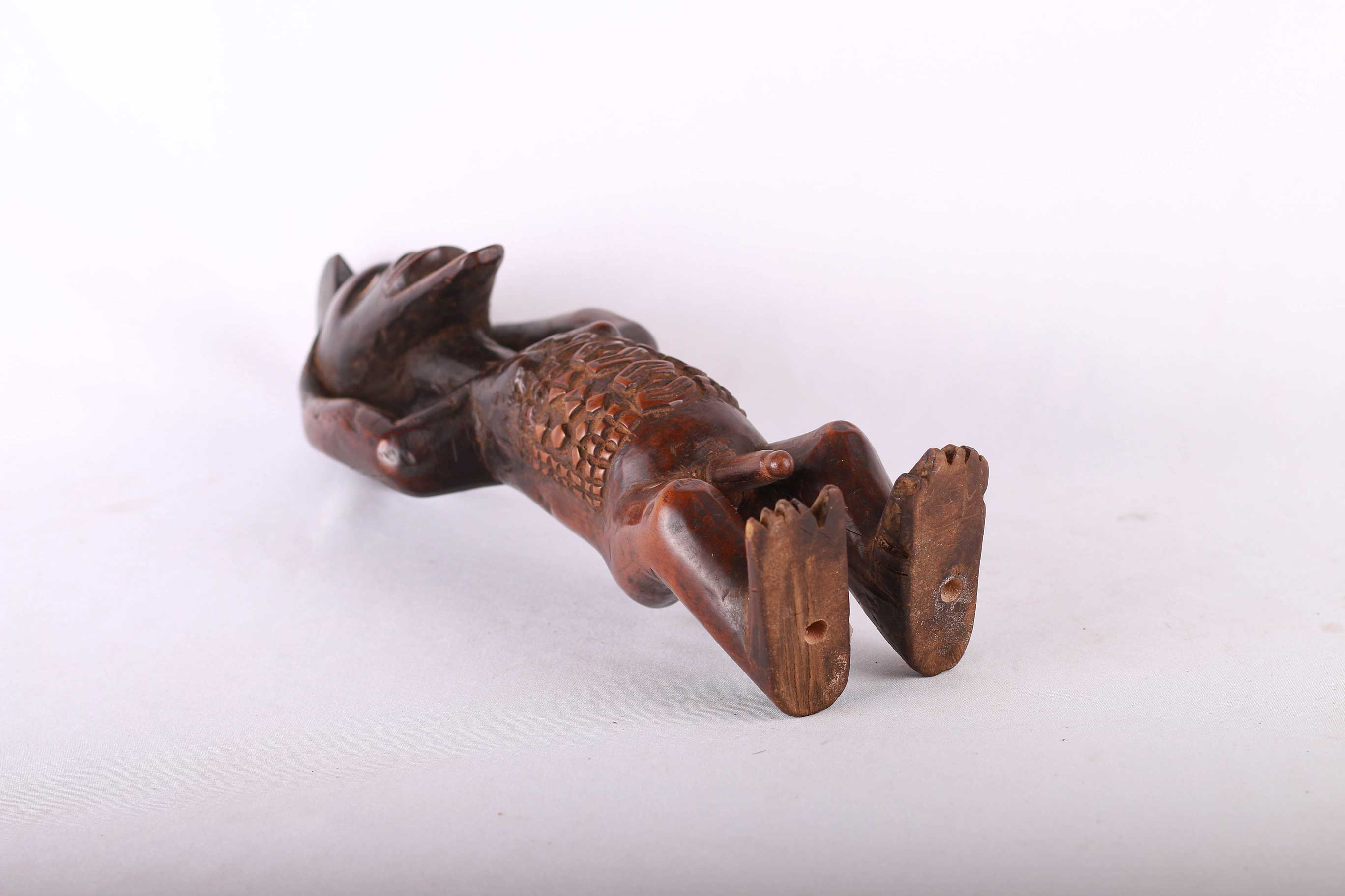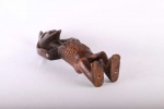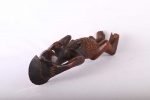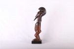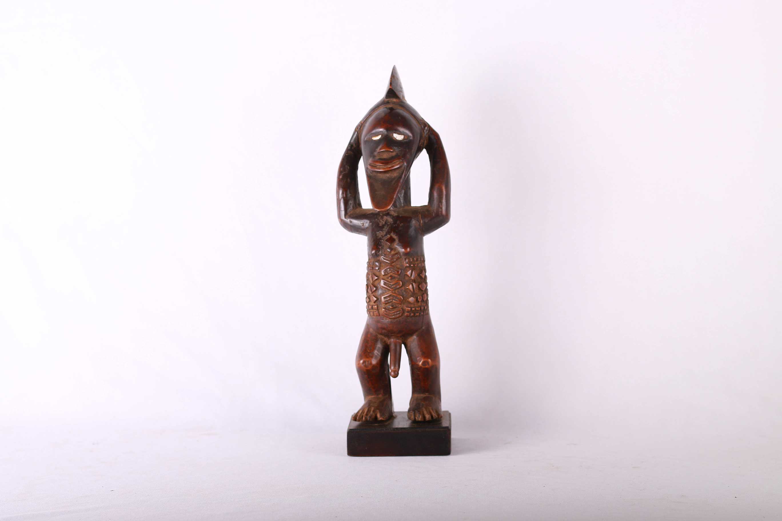 This ancient figure was used as a container for the spirit of an ancestor and had the power to provide for the well being of its owner and his family or to punish him for failure to observe the rules of proper behavior established by the ancestors. The figure originates from the Bembe tribe, a small group of people living in Uige Province in Angola. Among the Bembe, ancestors had close ties with the living and received offerings through the “priest,” who made appeals to statuettes. These figurines were used as magic statues (nkisi) by the sorcerers, they were idealized images of the ancestors and would often wear attributes that allowed them to be identified as medicine men or hunters.