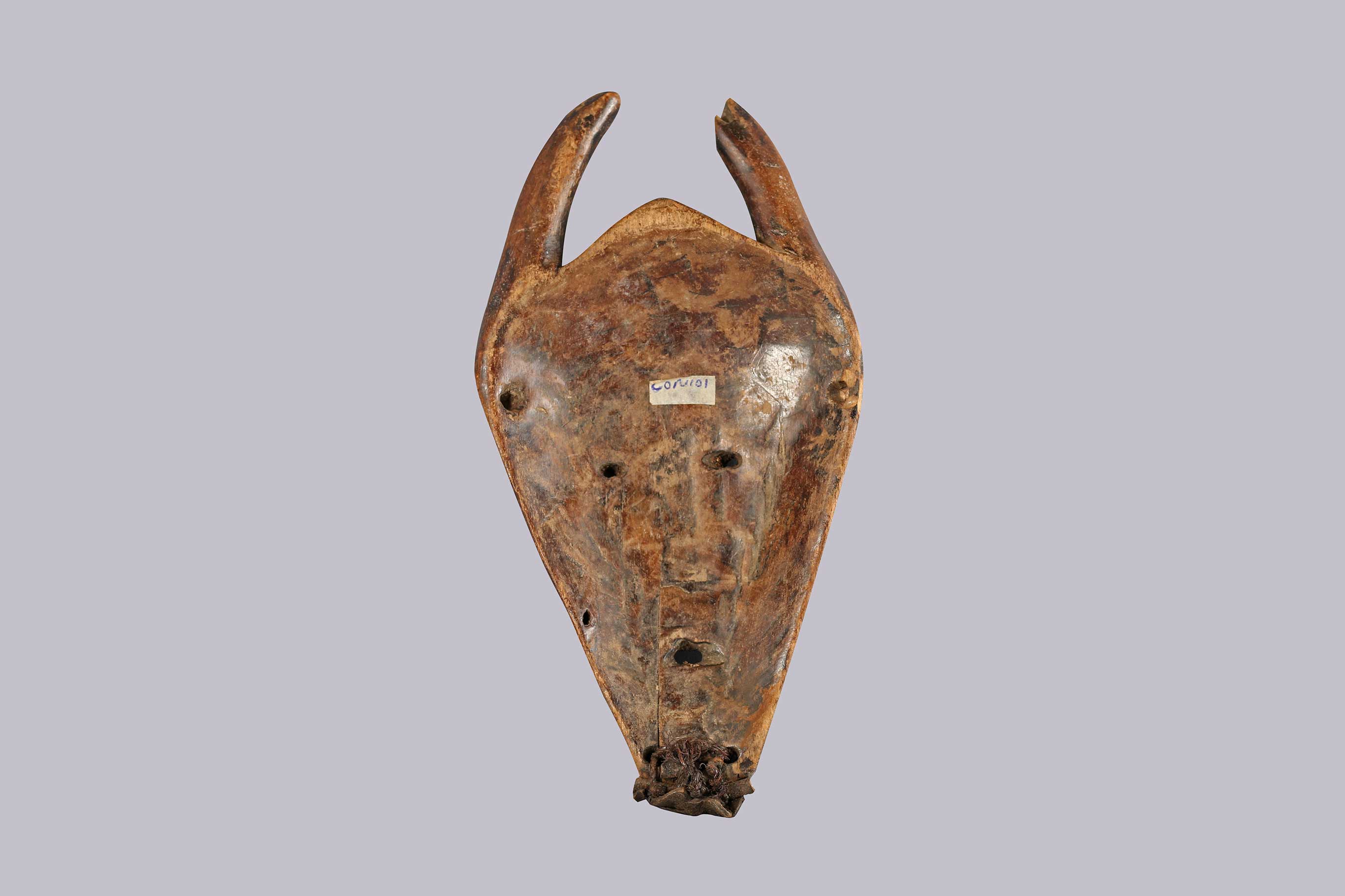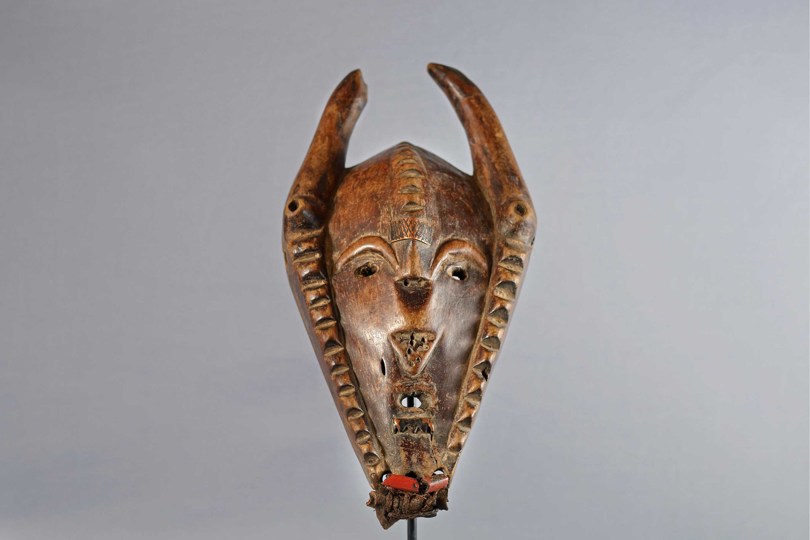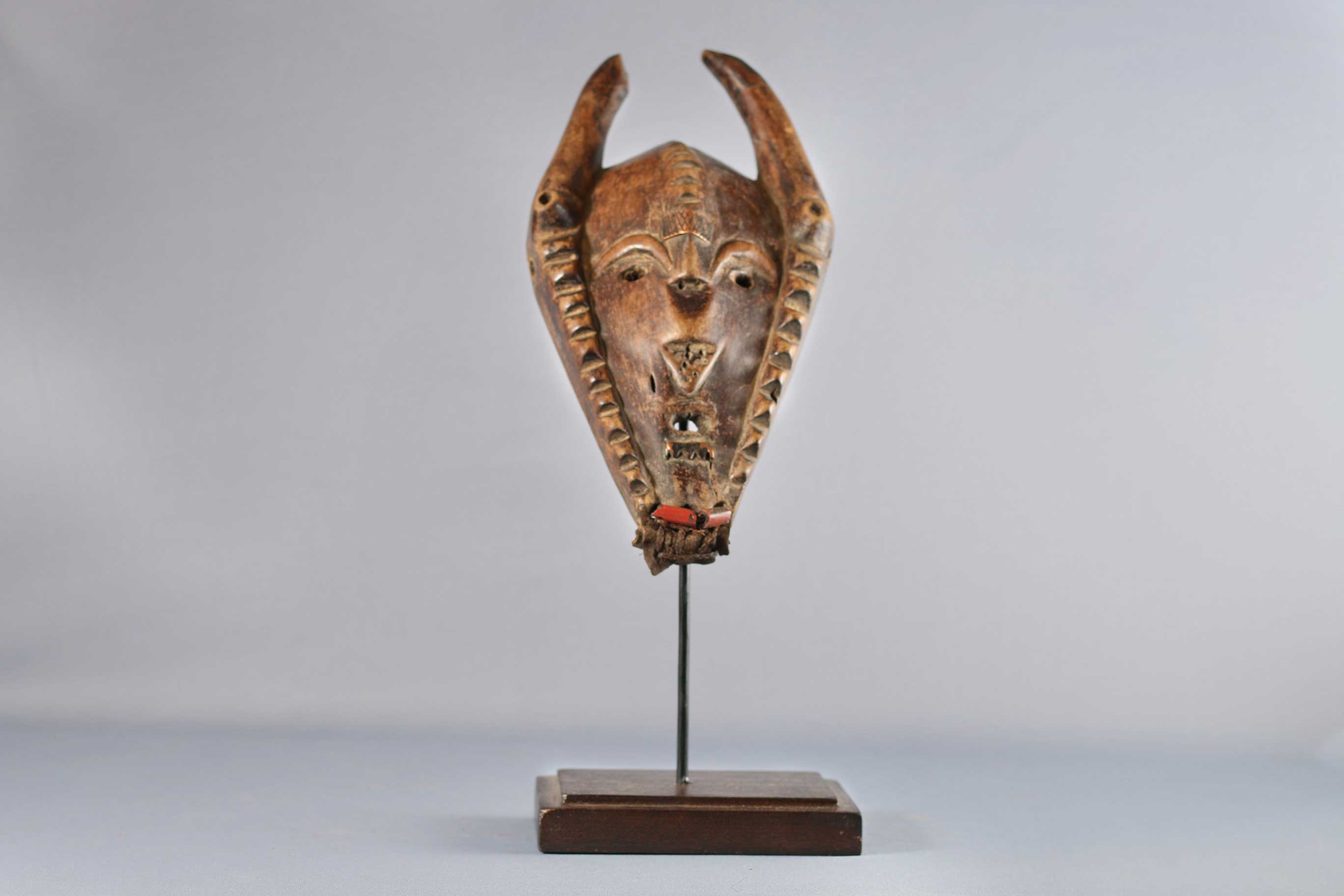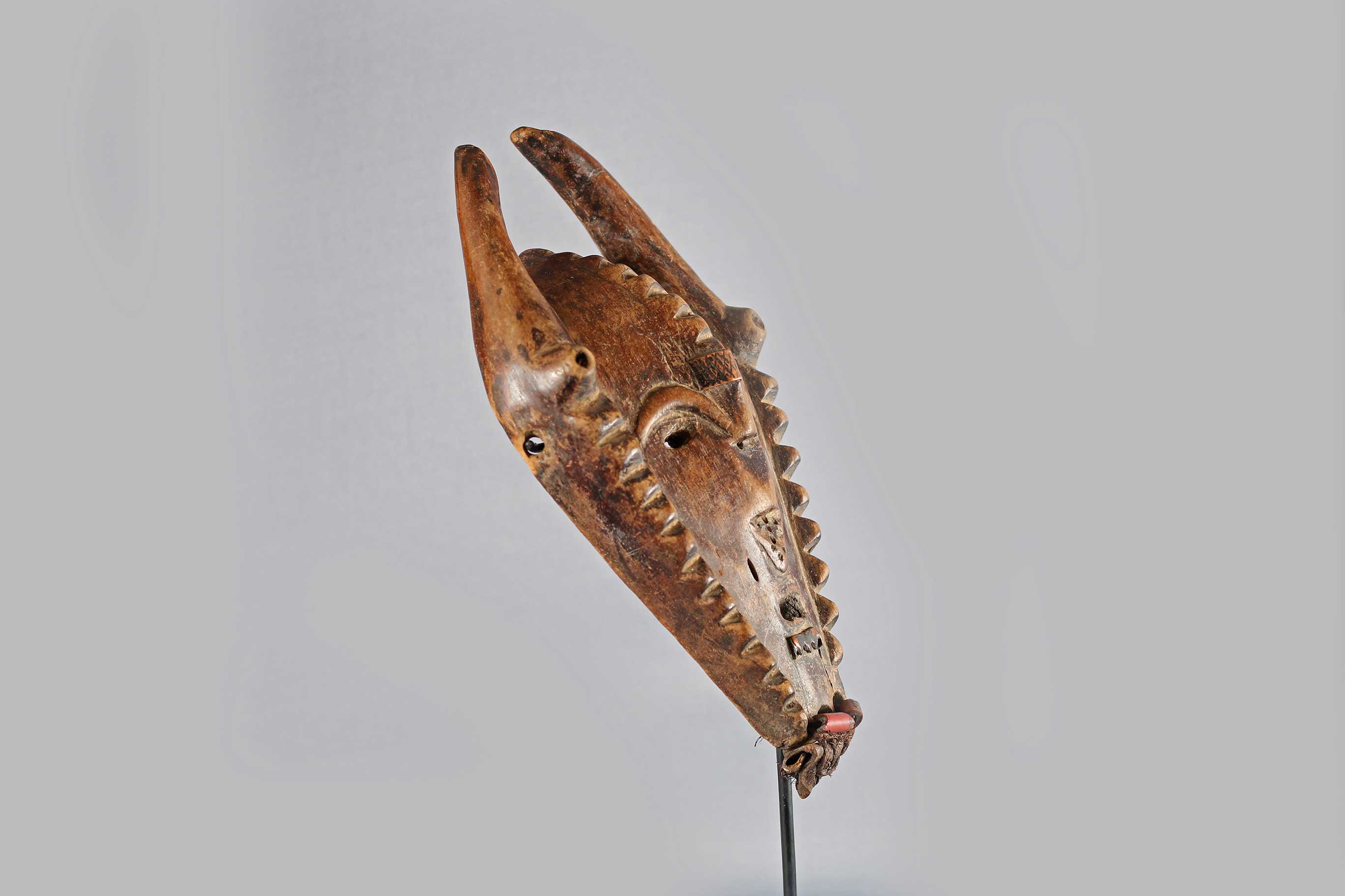 Masks and headdresses of the eastern Bembe people of the Democratic Republic Of Congo are recognizable for their beautiful forms. Elanda masks, from the Elanda male association, represent bird or animal spirits. The following mask has a shiny brown patina and we believe that it is highly likely a village production.