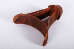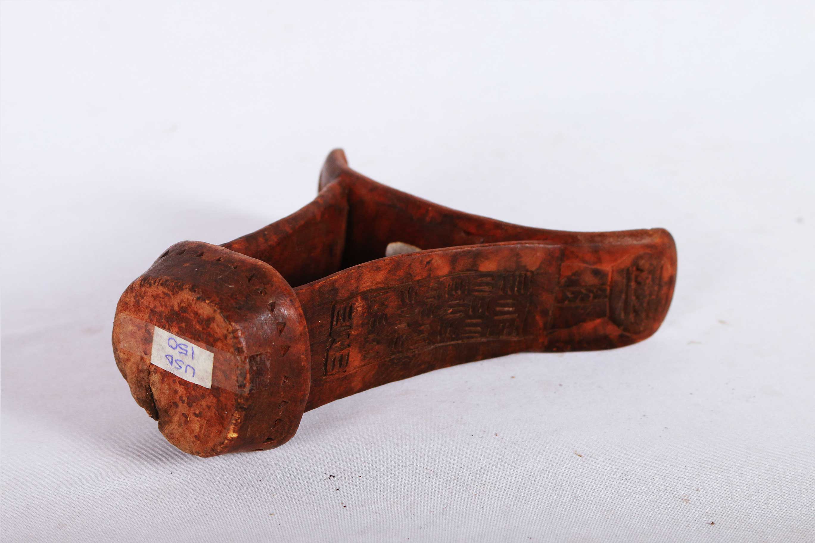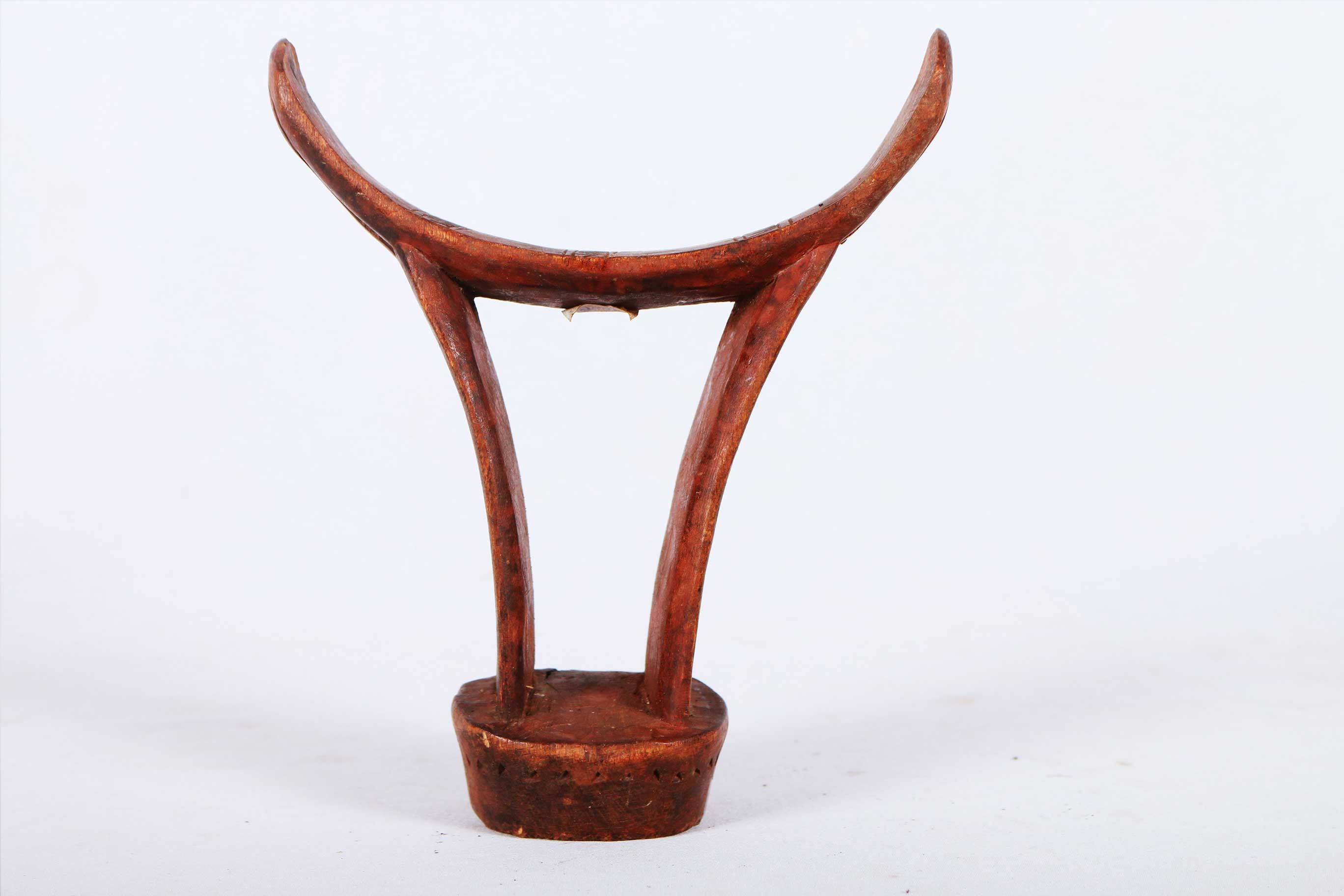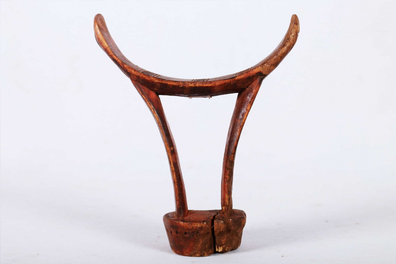 This particular headrest has significant style and shape, a circular base, two well-shaped columns in a V-shape and a crescent-shaped platform. It is old with visible signs of old age, shows traces of wear, a burnished brown patina and usage.