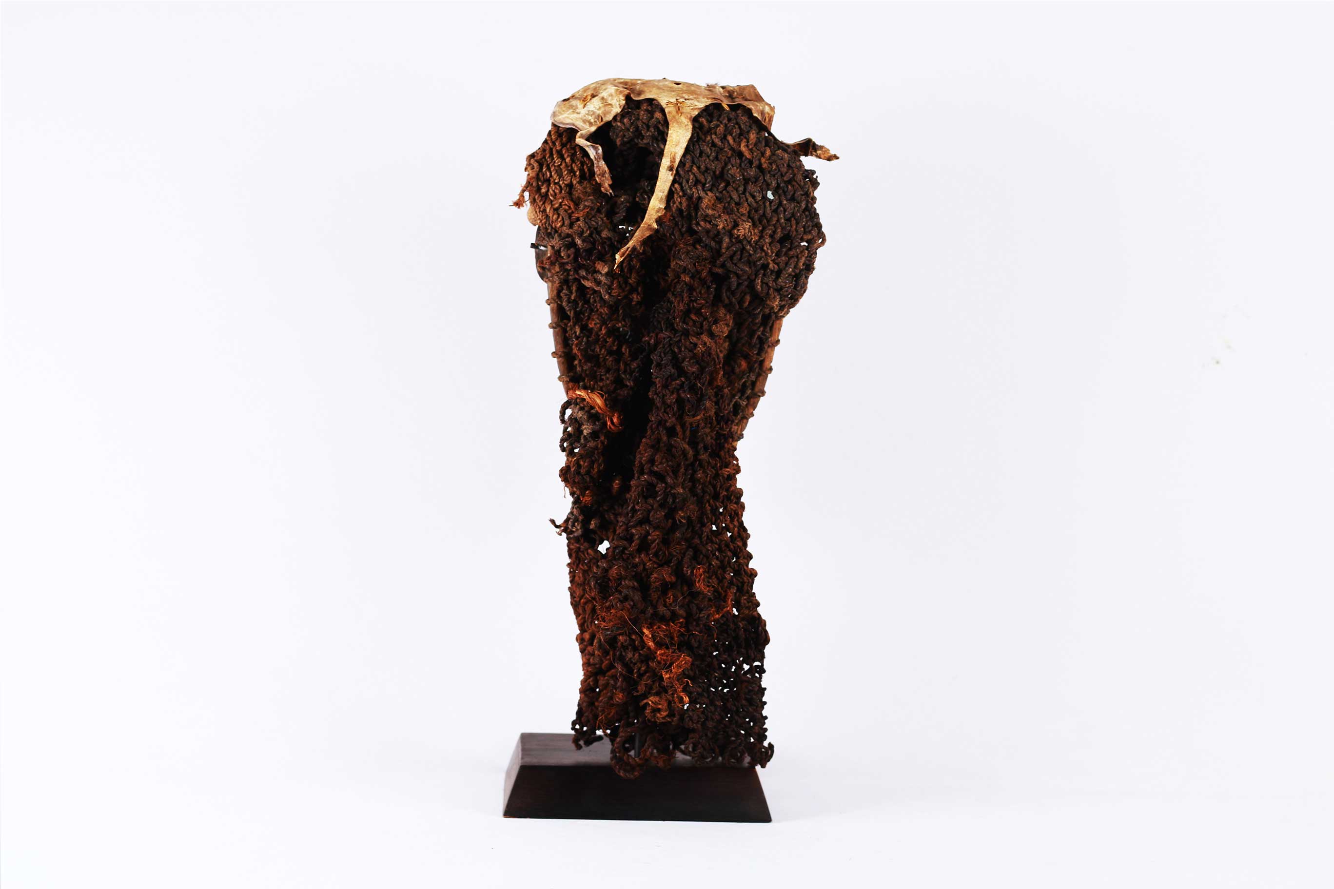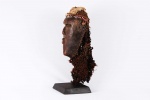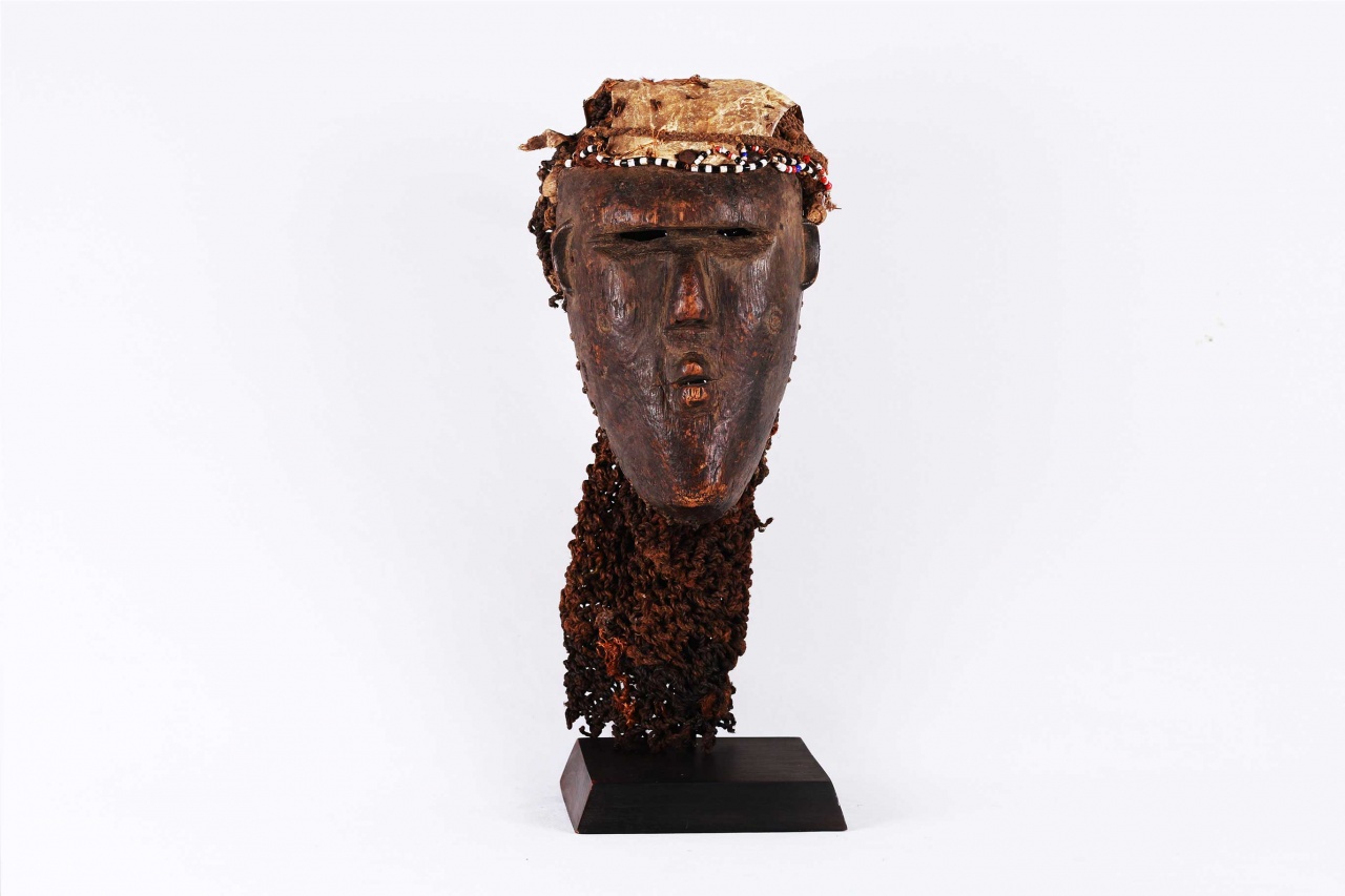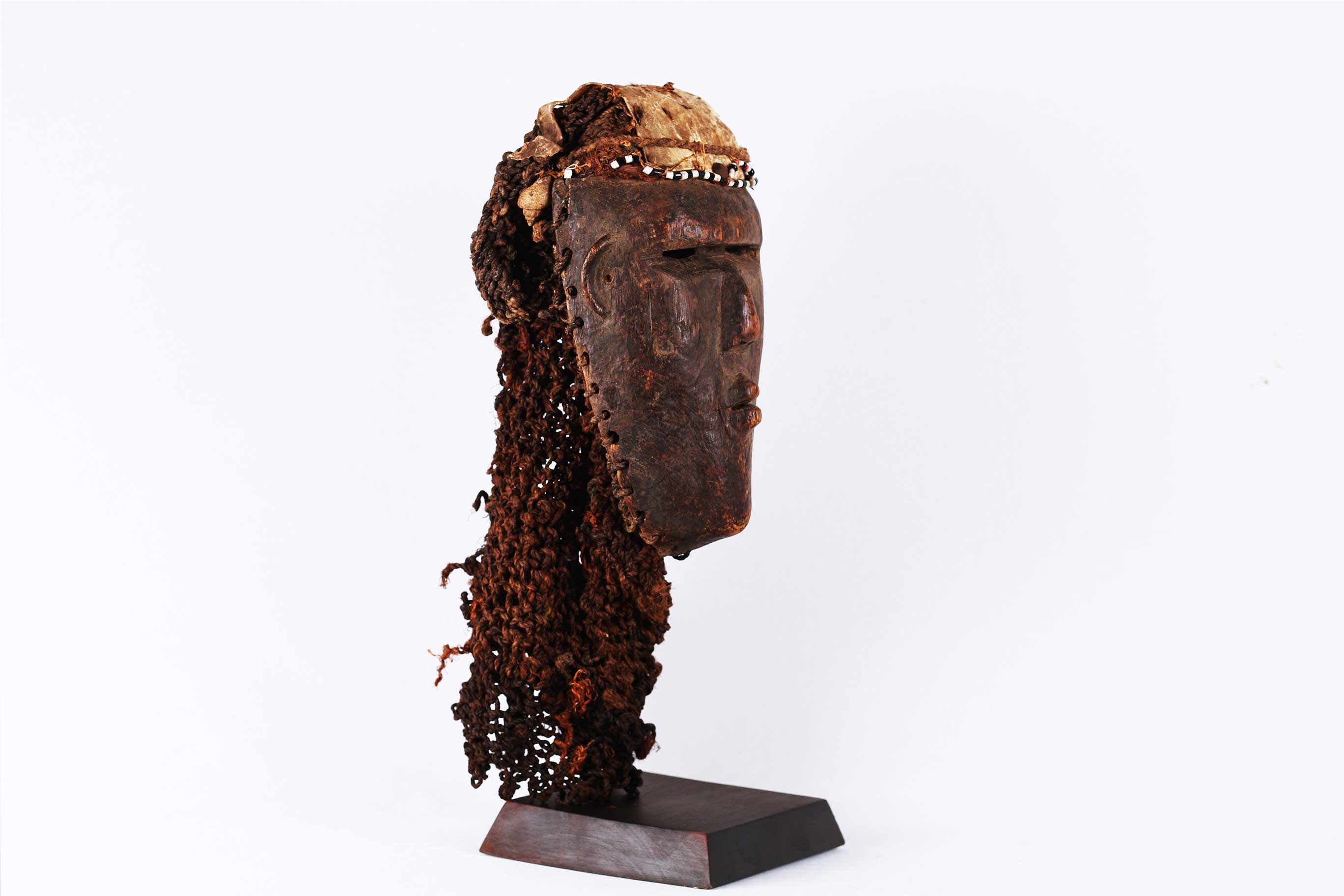 The Chokwe people are an ethnic group found in Angola, southwestern parts of the Democratic Republic of Congo and northwestern parts of Zambia. The Chokwe people influenced the art of many neighbouring tribes, including the Lunda, Mbunda, Lovale and Mbangani. They are regionally famous for their exceptional crafts work, particularly with baskets, pottery, mask carving, statues, stools and art objects produced to celebrate and validate the royal court. Chokwe masks were used by male dancers with costumes during initiation ceremonies to bring forth concepts of ideal beauty attributed to women. Men danced to dramatize the attributes of women, the masks were used to impersonate an ancestor or spirit. This is a wooden face mask, frontal coiffure with a wig like hair dress made from knotted fibres to imitate a form of wig long favoured by Chokwe women. It has a dark patina and signs of old age.