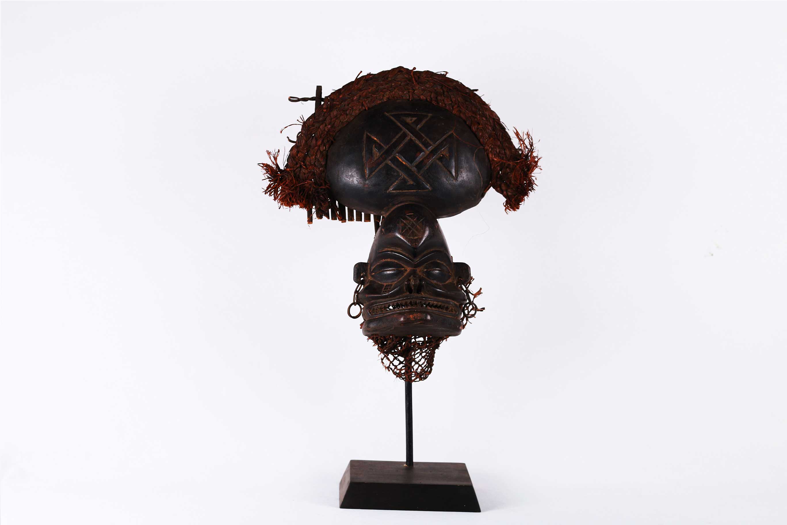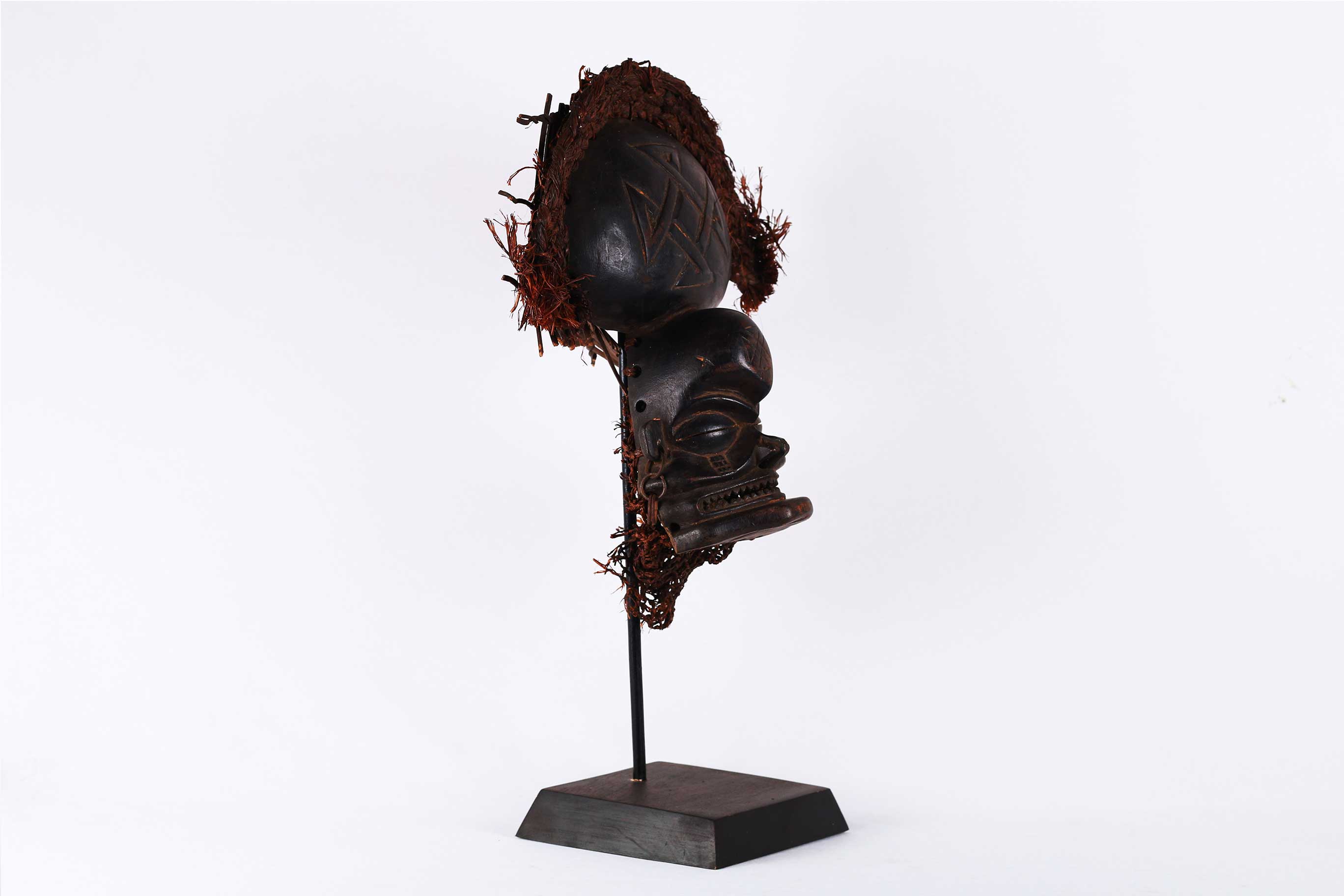The Chokwe people are an ethnic group found in Angola, southwestern parts of the Democratic Republic of Congo and northwestern parts of Zambia. The Chokwe people influenced the art of many neighbouring tribes, including the Lunda, Mbunda, Lovale and Mbangani. They are regionally famous for their exceptional crafts work, particularly with baskets, pottery, mask carving, statues, stools and art objects produced to celebrate and validate the royal court. Chokwe masks were used by male dancers with costumes during initiation ceremonies to bring forth concepts of ideal beauty attributed to women. Men danced to dramatize the attributes of women, the masks were used to impersonate an ancestor or spirit. This is a wooden face mask, frontal coiffure with a wig like hair dress made from knotted fibres to imitate a form of wig long favoured by Chokwe women. It has a dark patina and signs of old age.