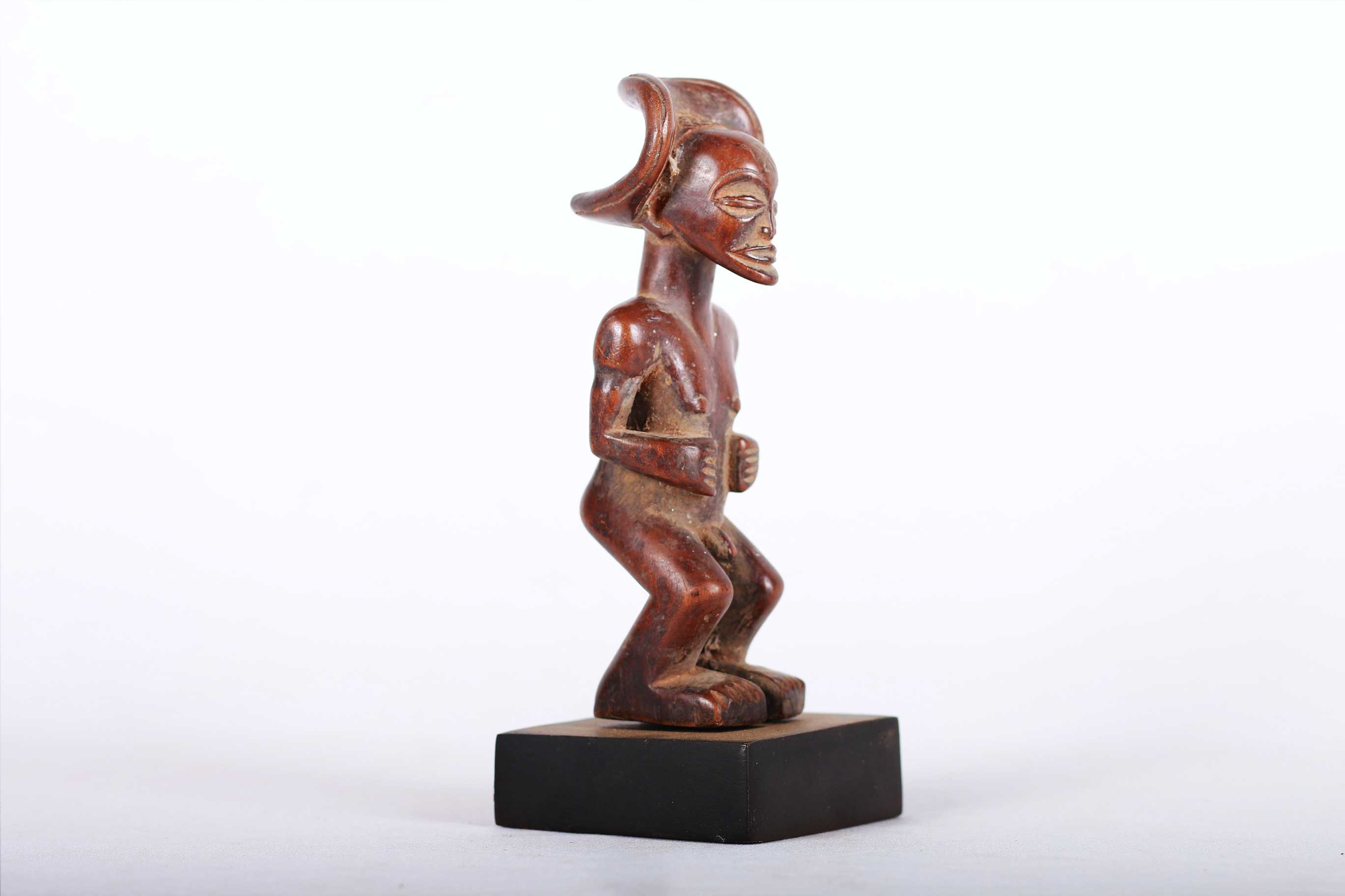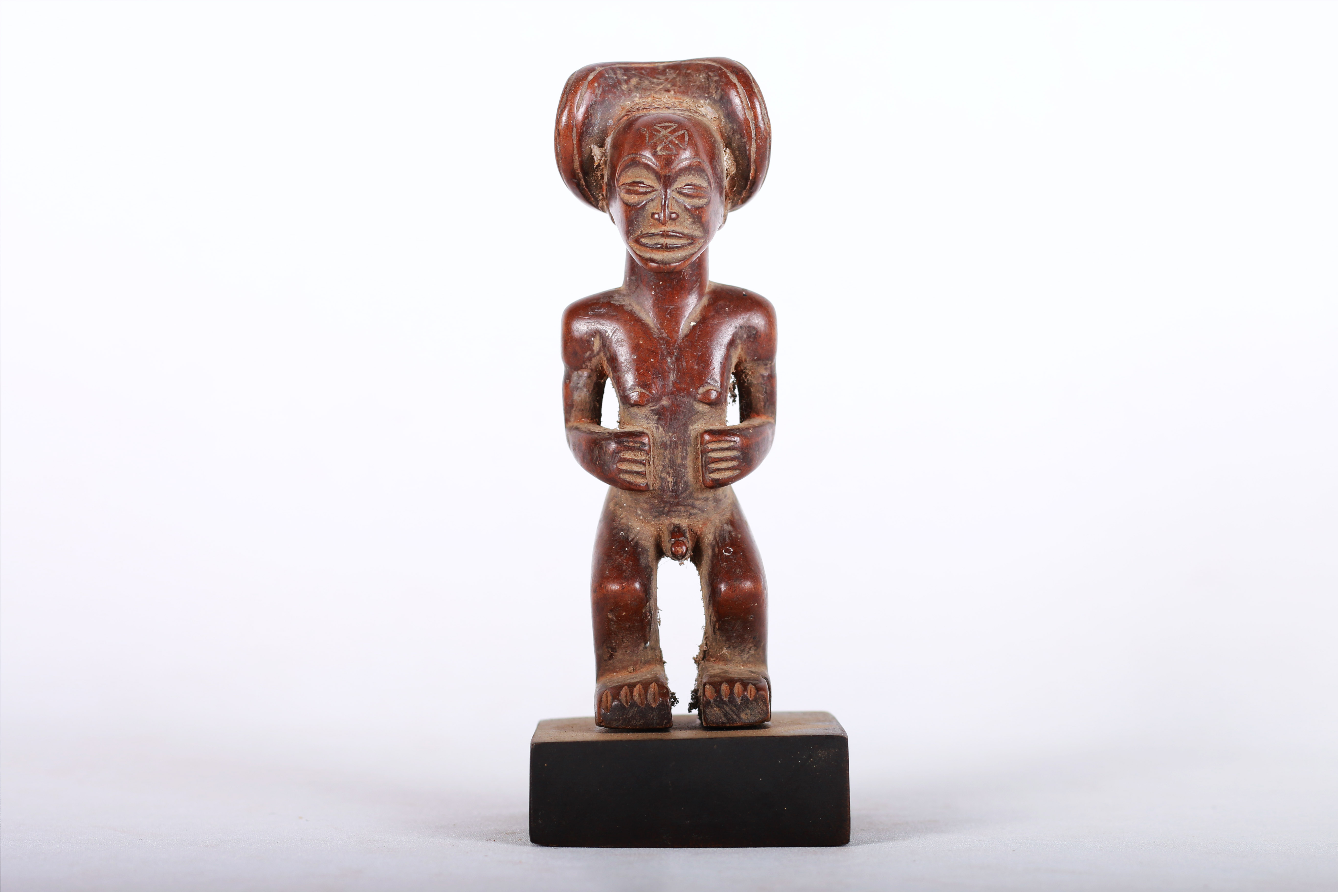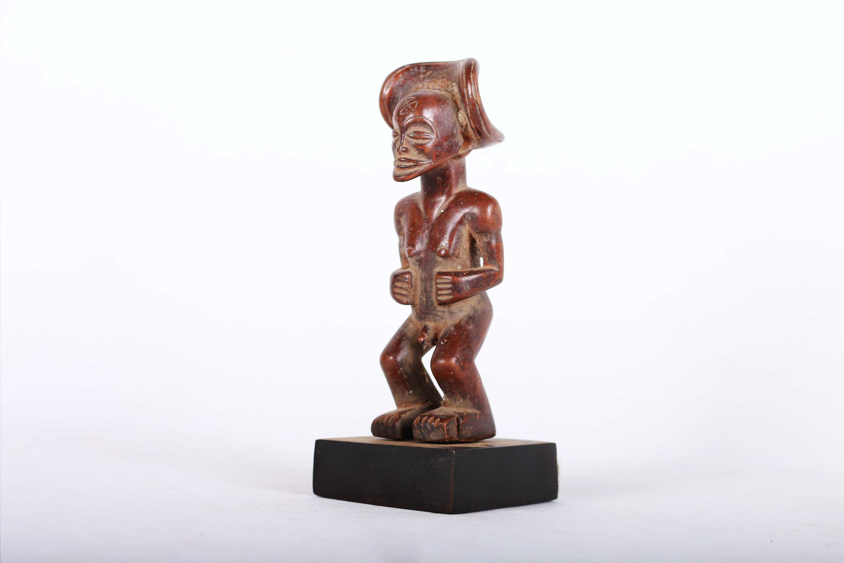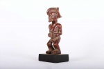 This Chokwe statue was carved in wood in a unique style, it originates from the Chokwe people an ethnic group found in Angola, southwestern parts of the Democratic Republic of Congo and northwestern parts of Zambia. The Chokwe people influenced the art of many neighboring tribes, including the Lunda, Mbunda, Lovale, and Mbangani. They are very famous for their exceptional crafts work, particularly with baskets, pottery, mask carving, statues, stools and art objects produced to celebrate and validate the royal court. Such small statues were made to represent ancestors and remind the people about the ranks and powers of the ancestral spirits. This magnificent small Chokwe statue with an elaborate hair dress style on the head, incised scarification on the forehead, brown patina, good signs of age, usage, exposure, natural abrasions, and scuffs.