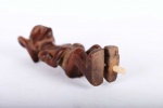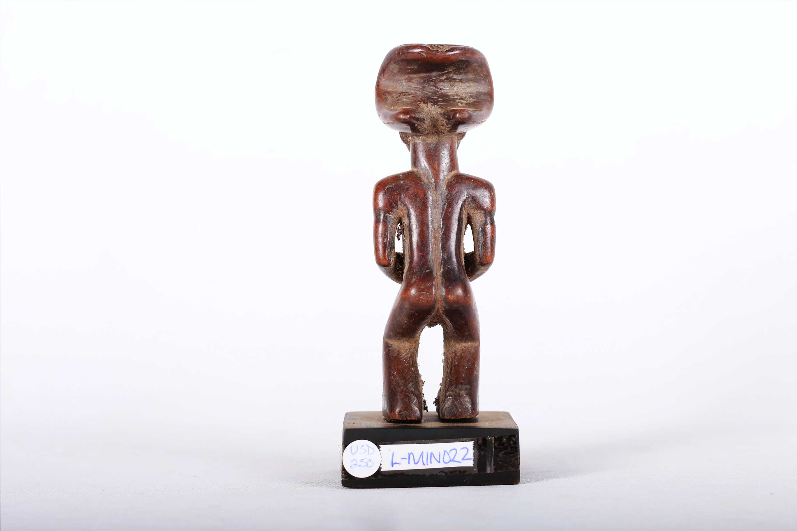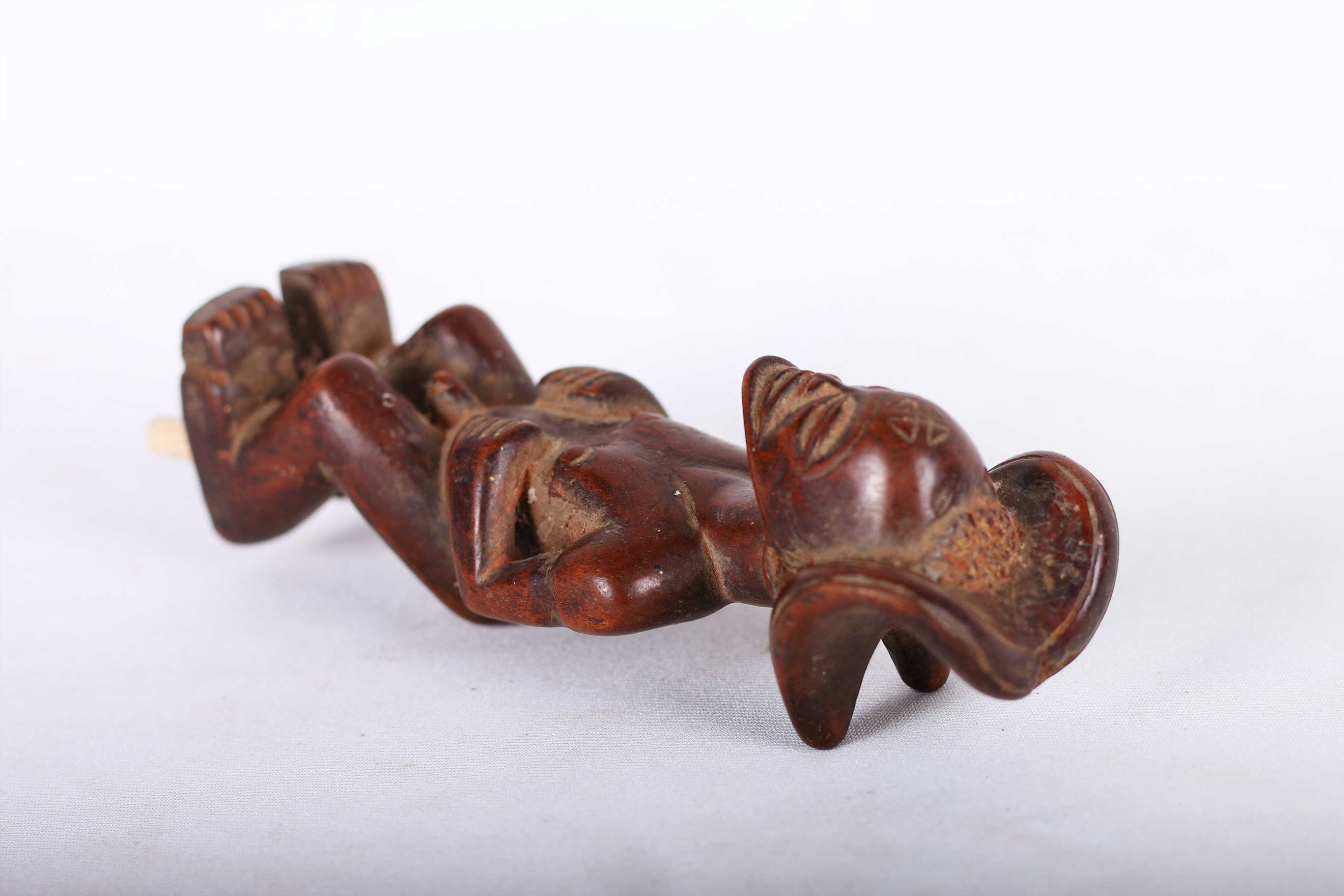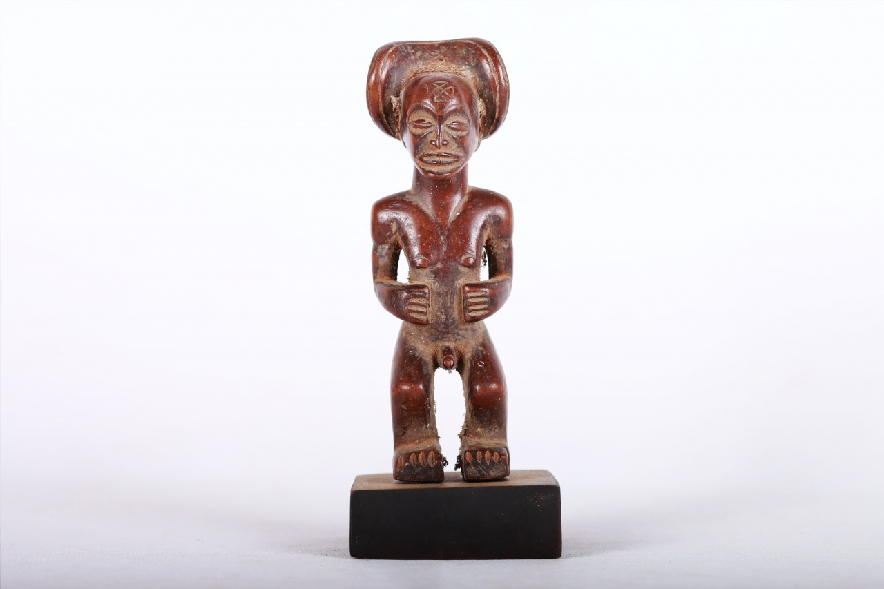 This Chokwe statue was carved in wood in a unique style, it originates from the Chokwe people an ethnic group found in Angola, southwestern parts of the Democratic Republic of Congo and northwestern parts of Zambia. The Chokwe people influenced the art of many neighboring tribes, including the Lunda, Mbunda, Lovale, and Mbangani. They are very famous for their exceptional crafts work, particularly with baskets, pottery, mask carving, statues, stools and art objects produced to celebrate and validate the royal court. Such small statues were made to represent ancestors and remind the people about the ranks and powers of the ancestral spirits. This magnificent small Chokwe statue with an elaborate hair dress style on the head, incised scarification on the forehead, brown patina, good signs of age, usage, exposure, natural abrasions, and scuffs.
