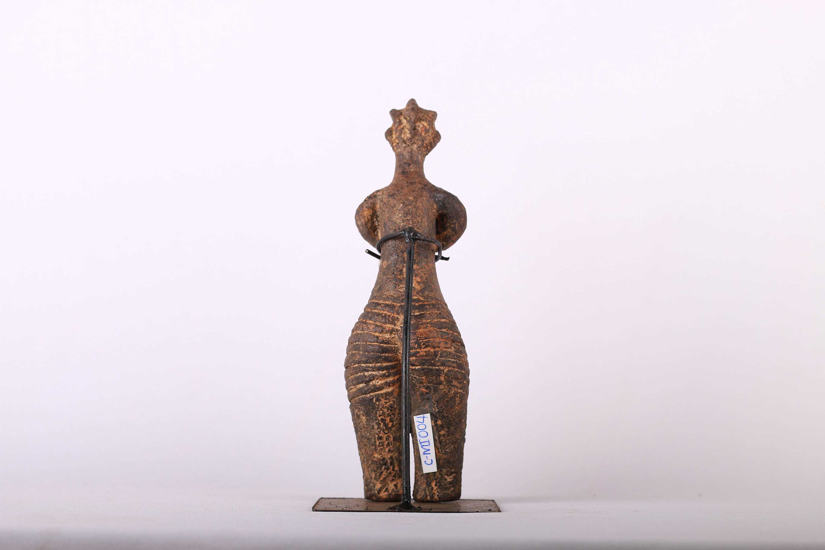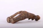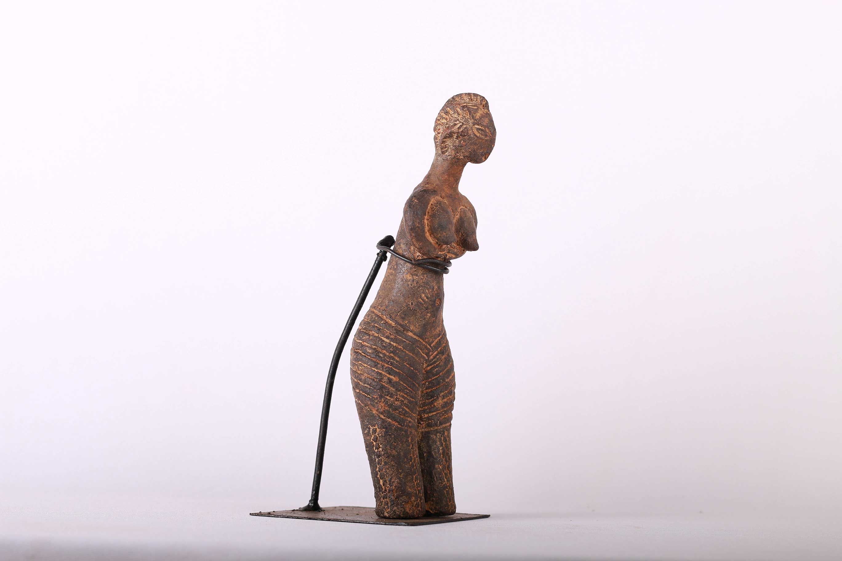 The Dinka people are a Nilotic ethnic group living in South Sudan. They mostly live along river Nile, from Mangala to Renk, in regions of Bahr el Ghazal, Upper Nile and Abyei Area of the Ngok Dinka in South Sudan. They are famous for their rituals in marriage, and cultural demonstrations in various ceremonies. Such clay fetishes were revered for their magical healing powers. This is a rare female Dinka Clay fetish uniquely made with formidable features, it is short, slightly bent with deeply incised streaks around the waist, short arms and an elaborate hairstyle. It is rough, shows signs of abrasion, wear and tear due to usage, this figure looks old.