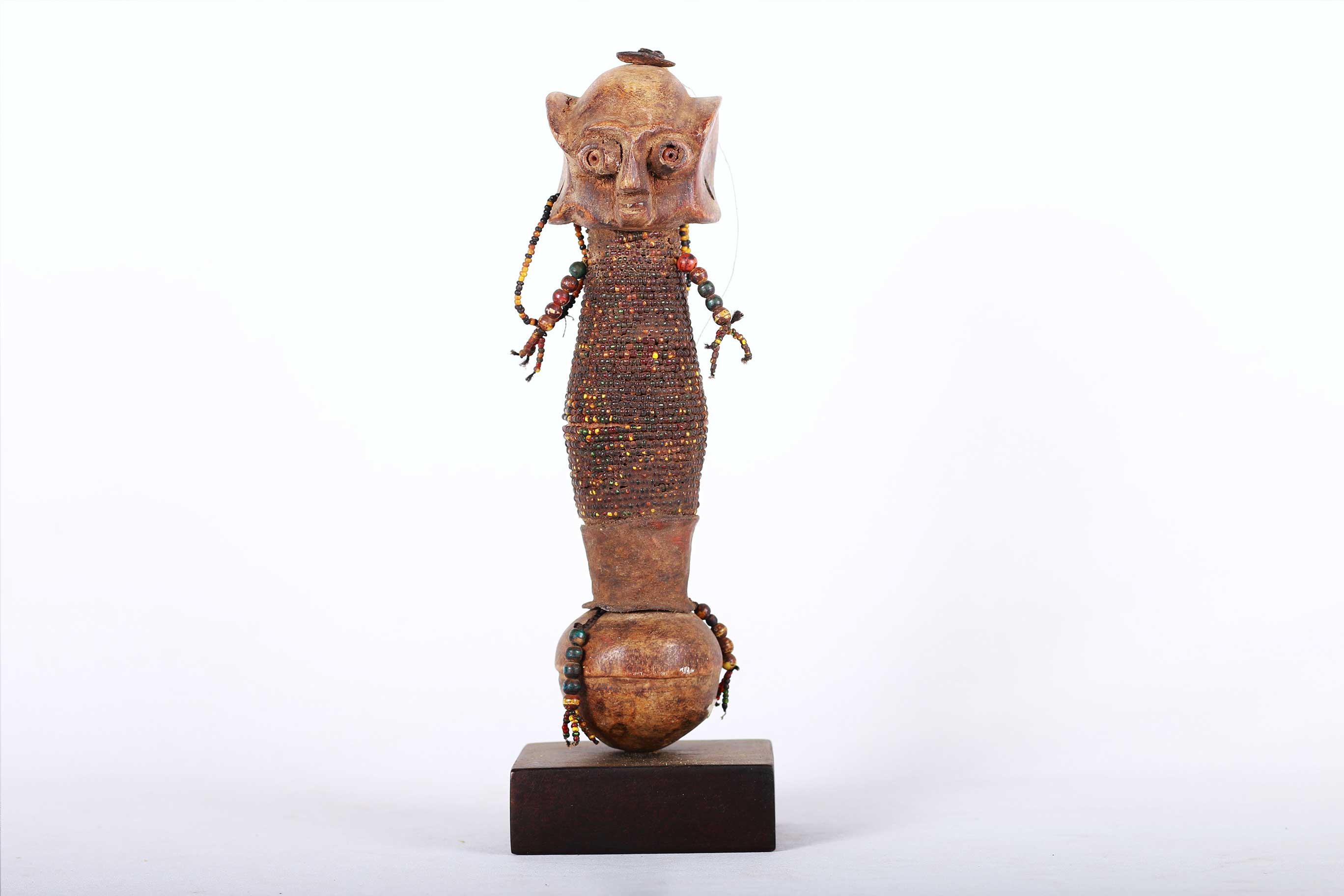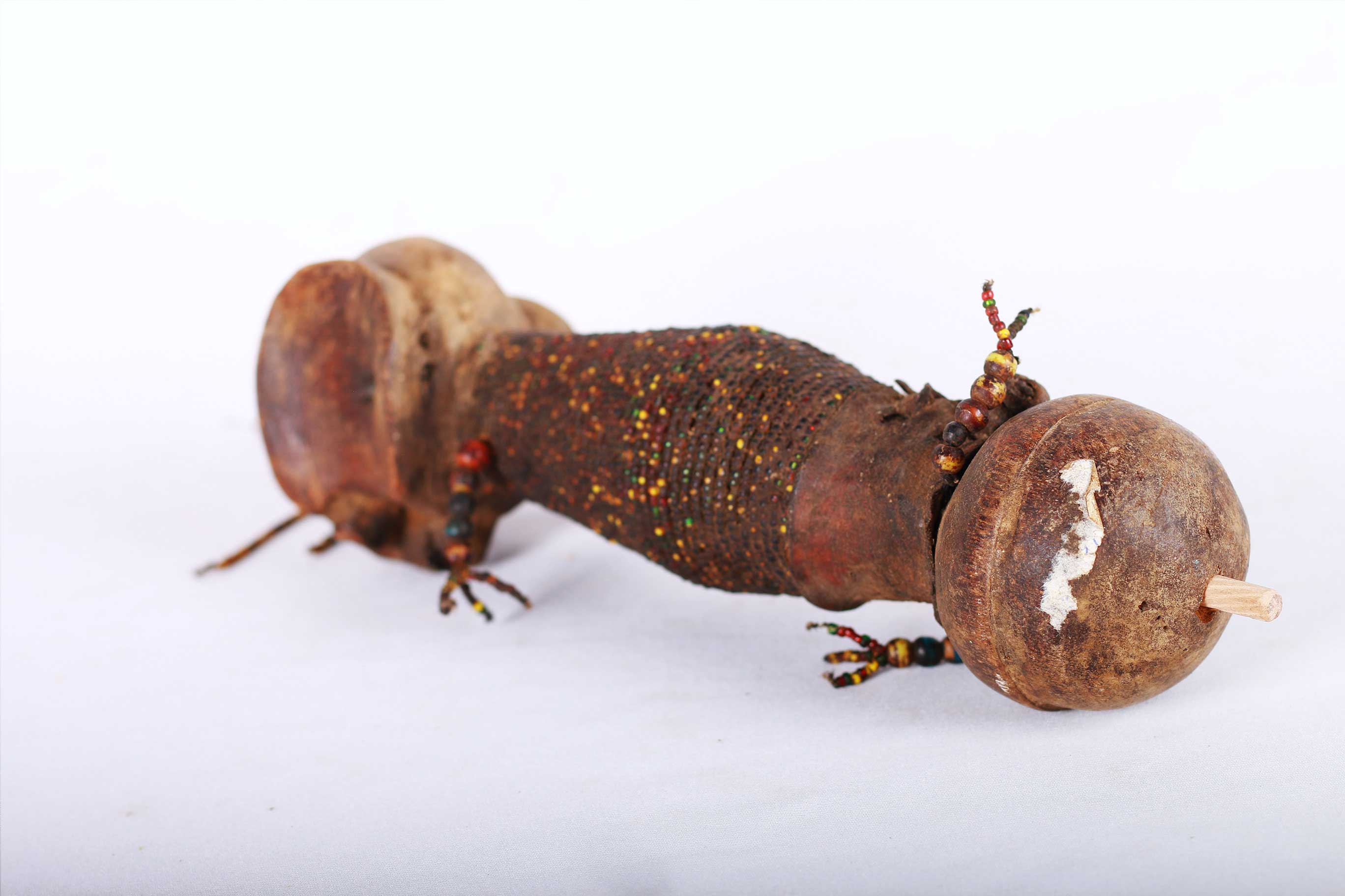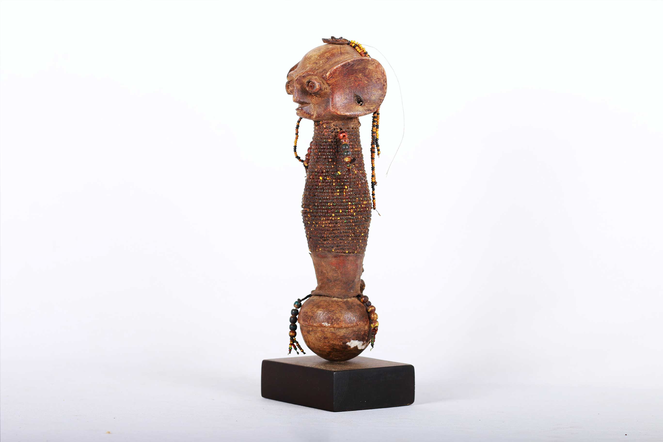 The Dinka people are a Nilotic ethnic group living in South Sudan. They mostly live along river Nile, from Mangala to Renk, in regions of Bahr el Ghazal, Upper Nile and Abyei Area of the Ngok Dinka in South Sudan. This is a wonderful wooden carved Dinka doll decorated with beads around the mid-section, hands and earrings. Such sculptures were made by young Dinka men and given to their new wives to be. The wife would then carry the doll on her back representing fertility. This doll has a khaki patina and looks old.