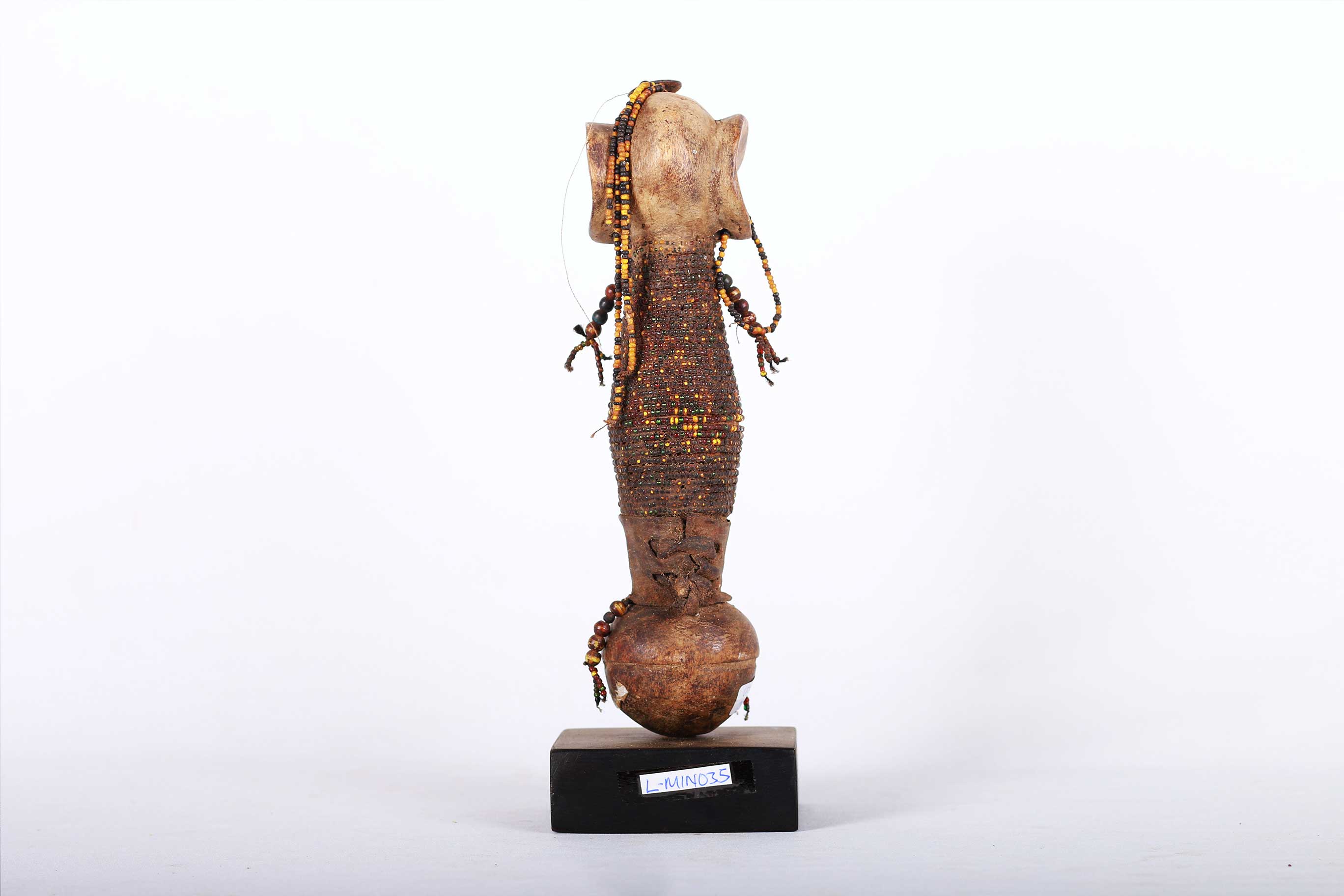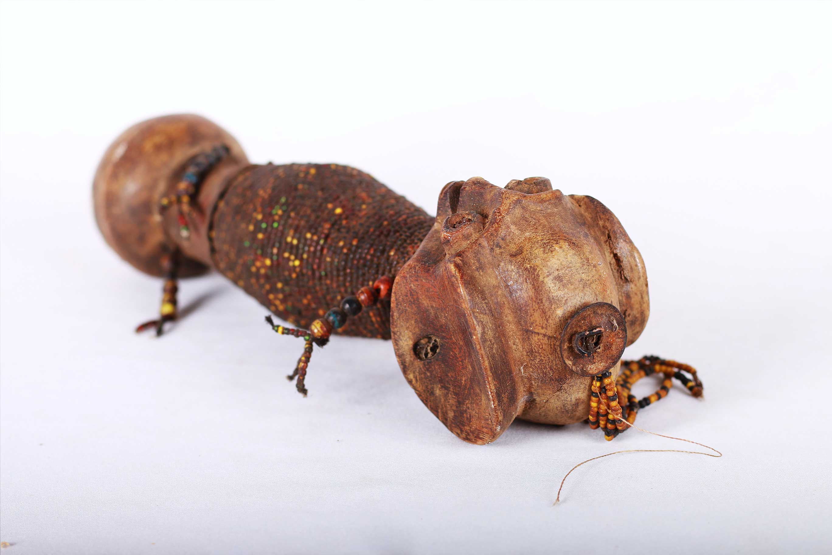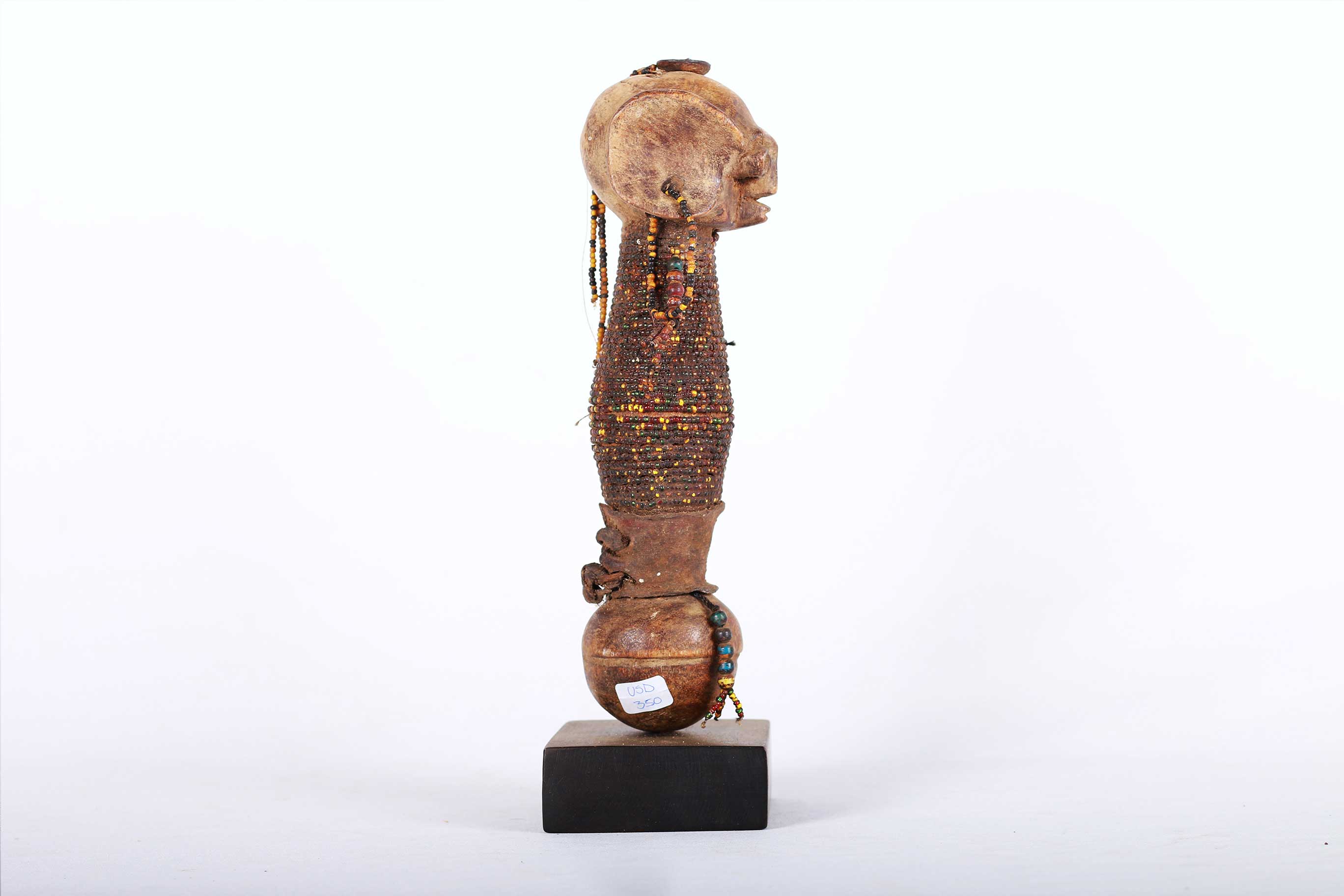 The Dinka people are a Nilotic ethnic group living in South Sudan. They mostly live along river Nile, from Mangala to Renk, in regions of Bahr el Ghazal, Upper Nile and Abyei Area of the Ngok Dinka in South Sudan. This is a wonderful wooden carved Dinka doll decorated with beads around the mid-section, hands and earrings. Such sculptures were made by young Dinka men and given to their new wives to be. The wife would then carry the doll on her back representing fertility. This doll has a khaki patina and looks old.