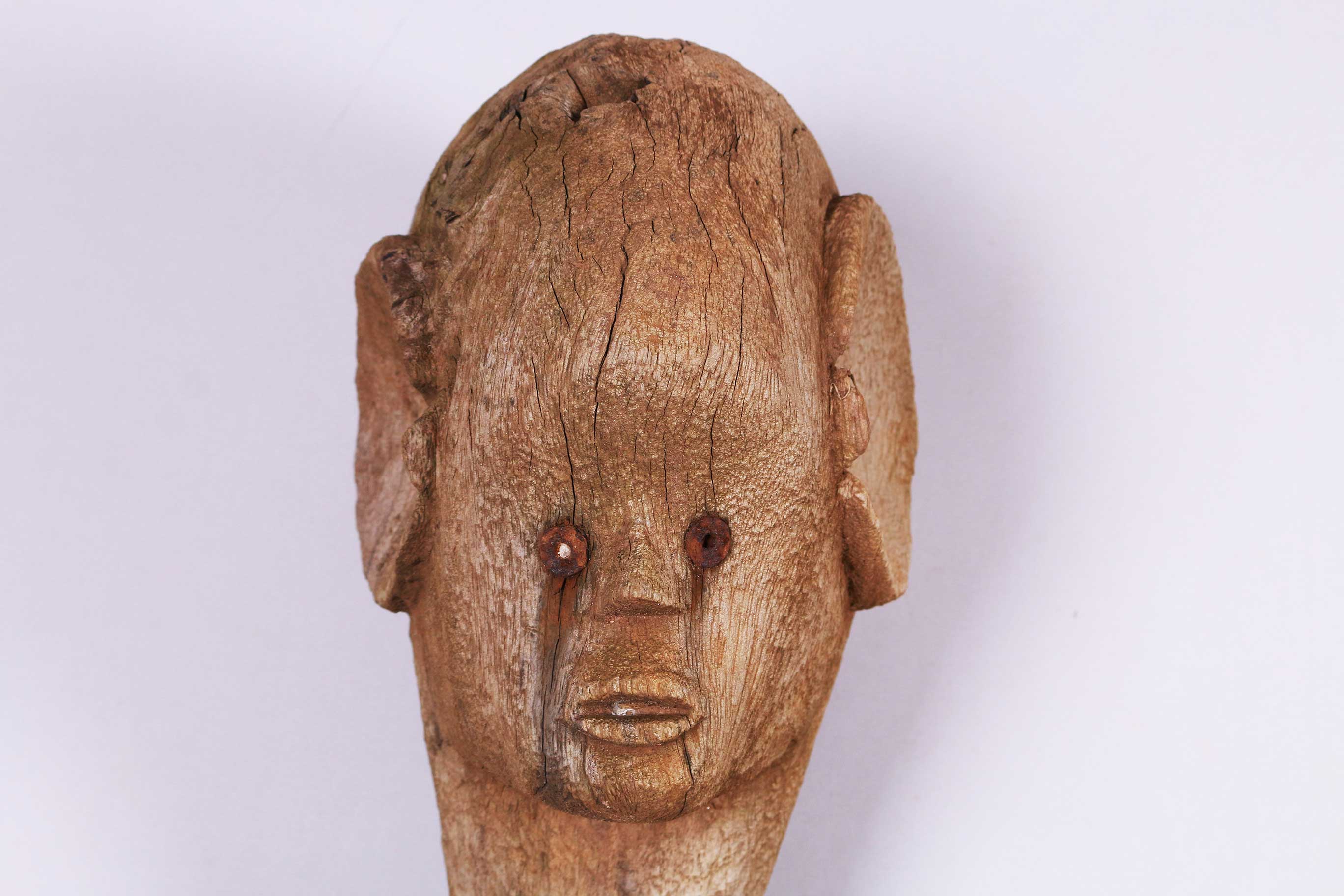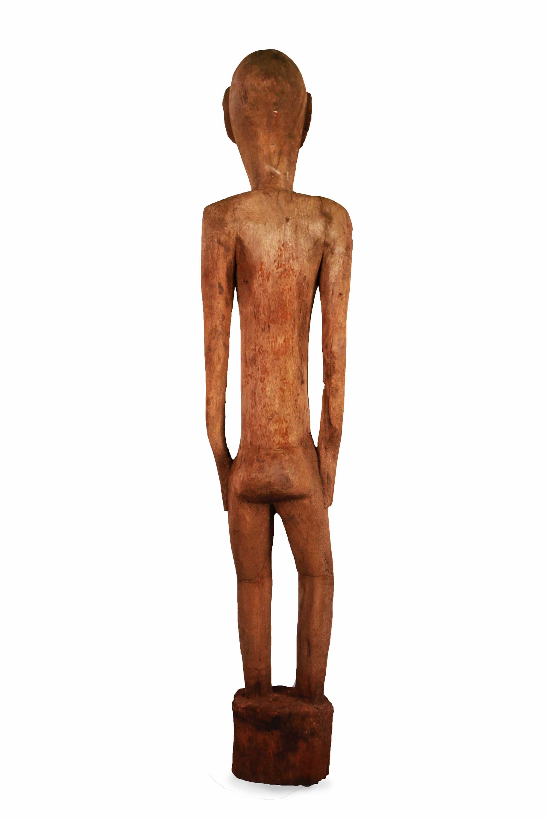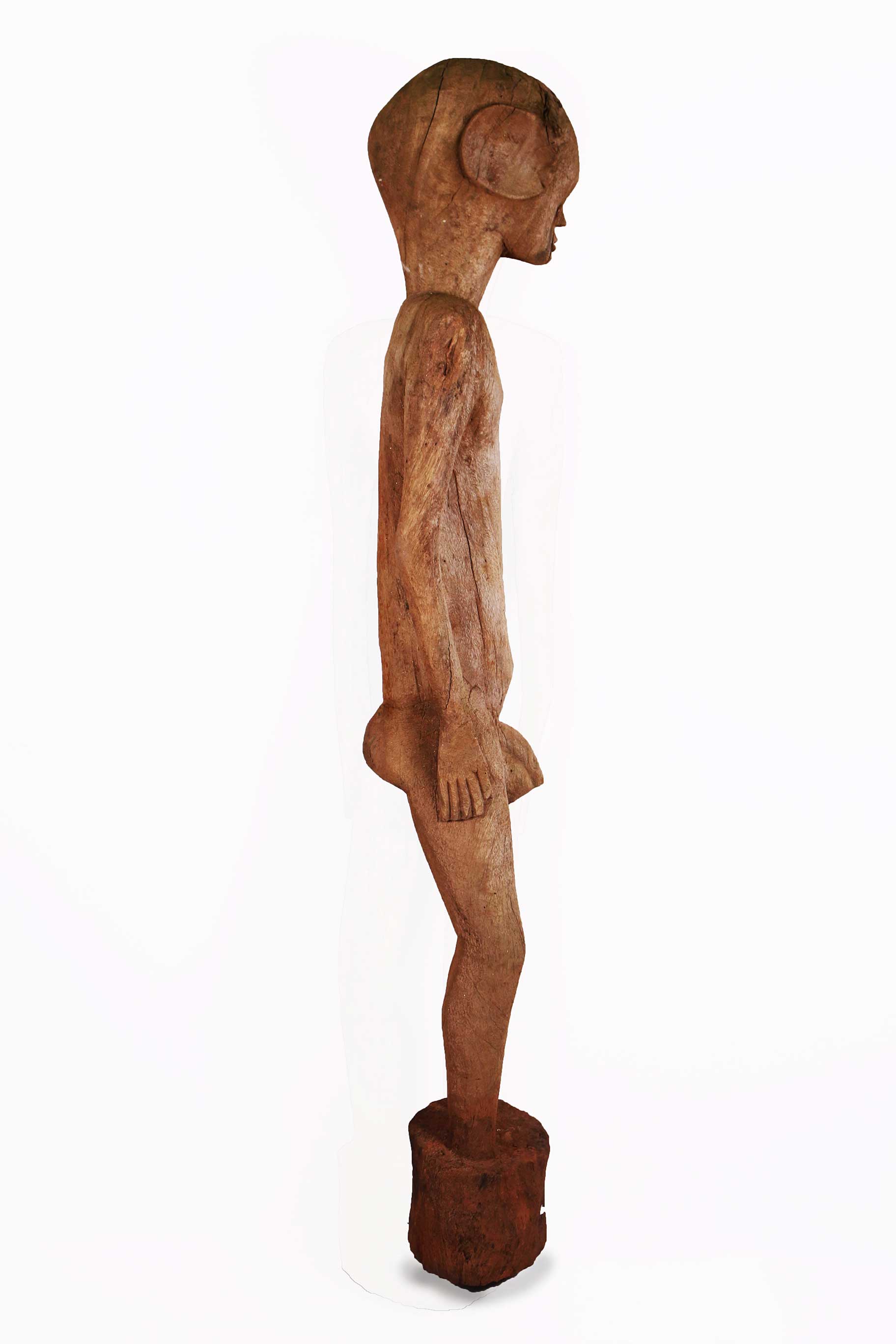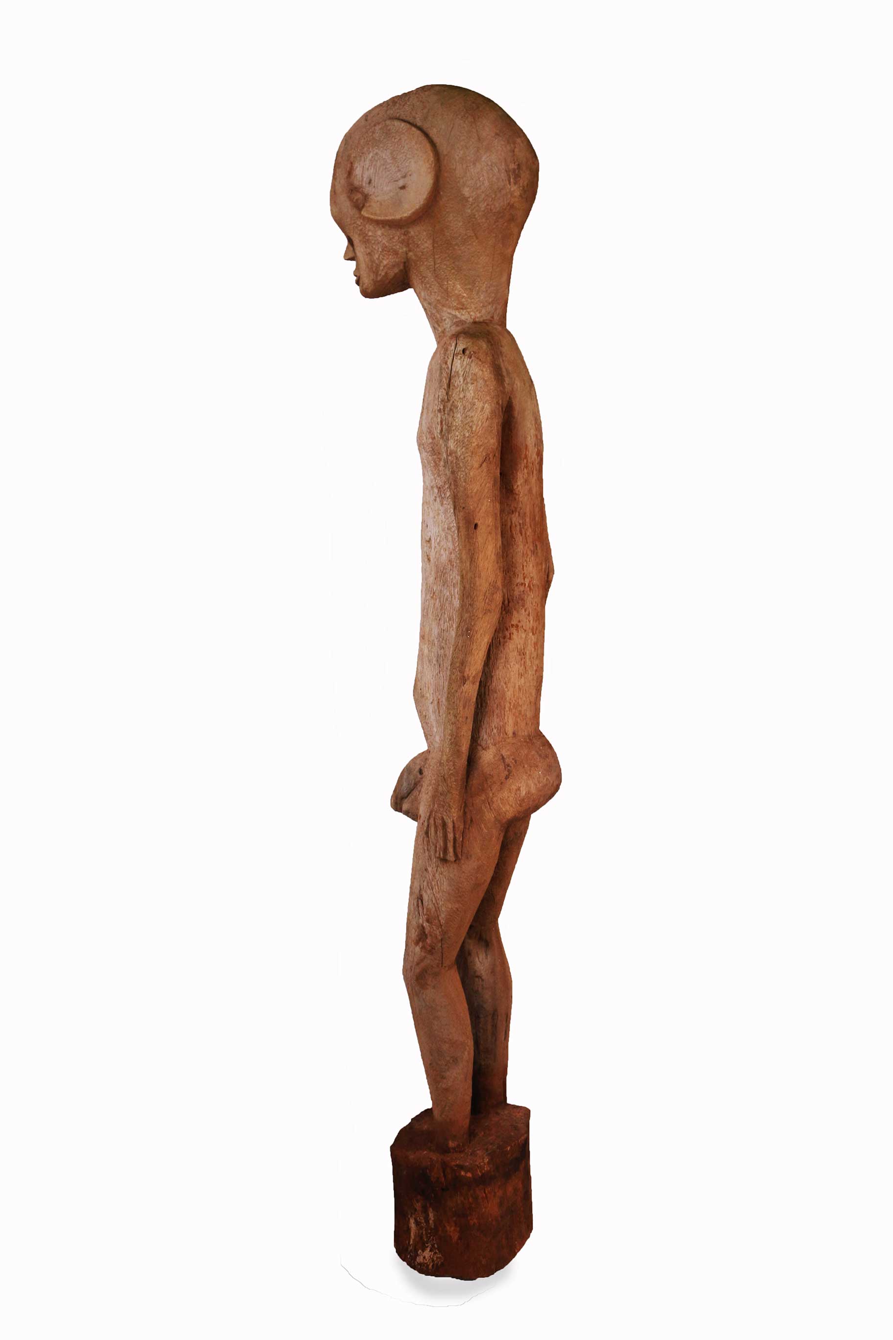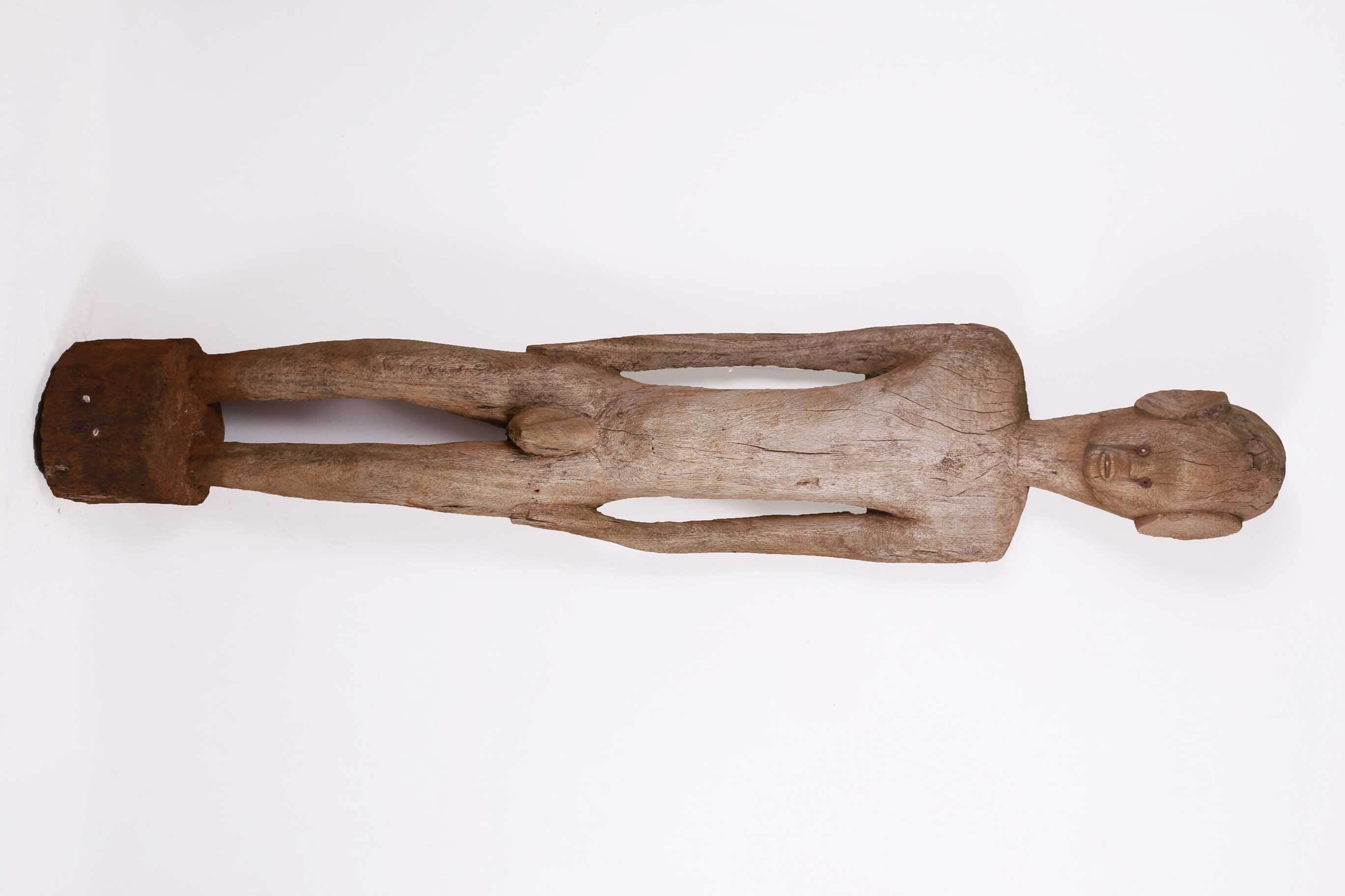 The following sculpture is carved out of dense wood with a brownish patina and a rough surface and shows visible signs of age and good usage.