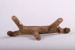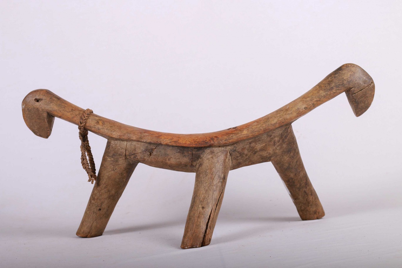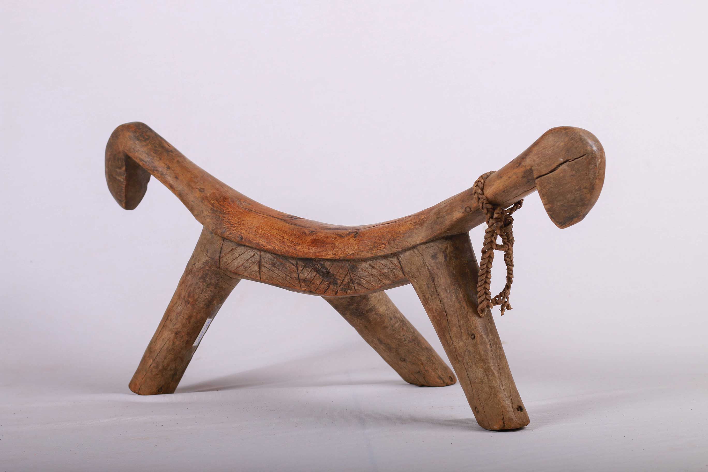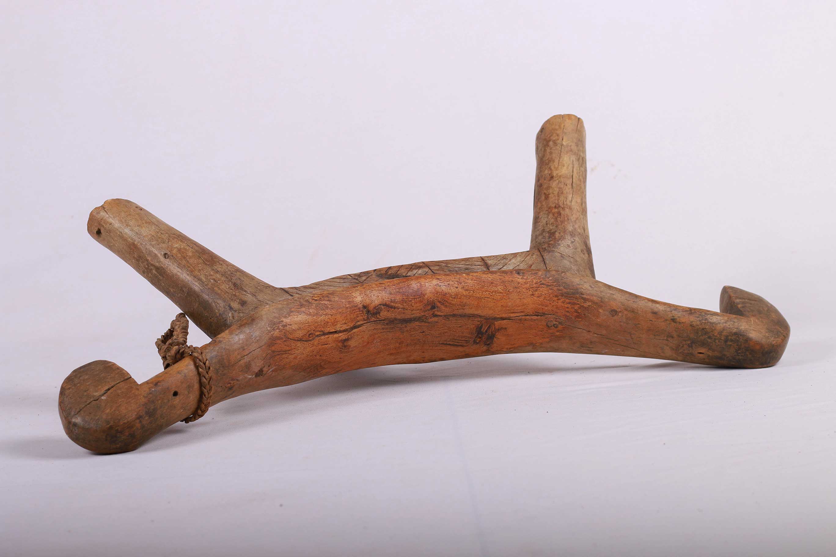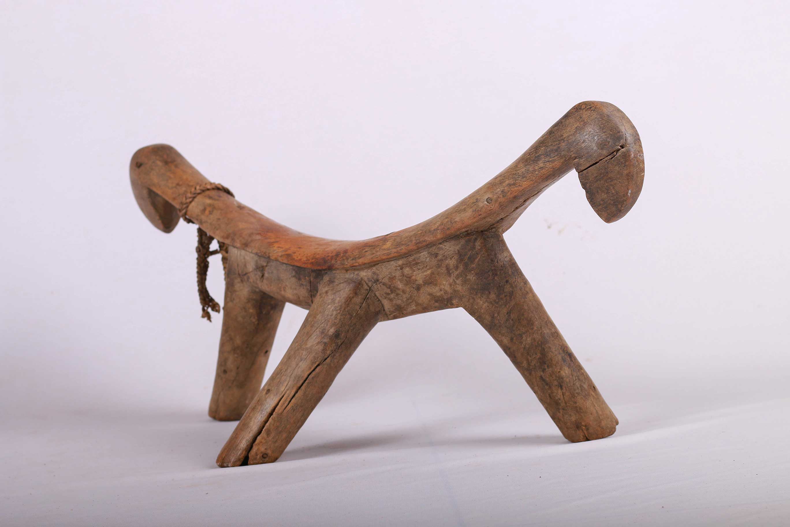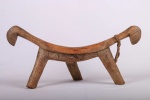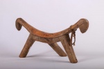 The simple forms produced by the Dinka and Nuer are often little more than the result of judicious pruning of a found branch to produce a three- or four-legged headrest. Zoomorphic features, such as a tail and a head, are sometimes brought out. These were used as pillows to help someone to have good sleep. They also used as a comfort to help protect ceremonial coiffure. In some occasions, headrests are used as a stool. As a personal object, the headrest has become part of the individual. Usually, when the person died, he is buried with his headrest. Sometimes the headrest is passed on to his heir, who would treat it with respect because this wooden piece embodies the spirit of the deceased person. Dinka headrests are primarily used by older men. The following headrest is crafted from hardwood and looks visibly old.