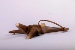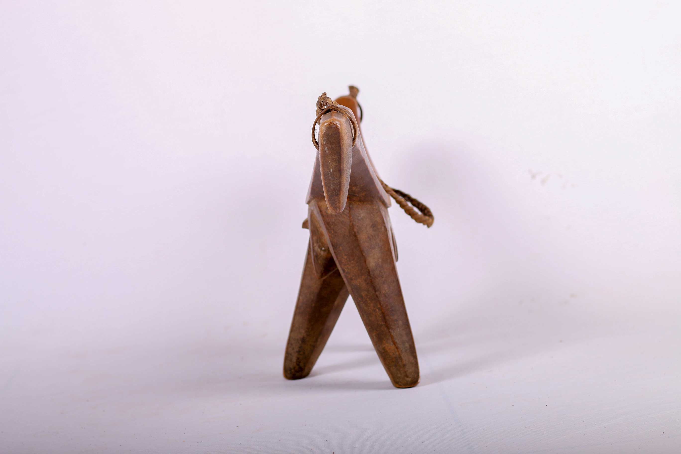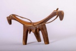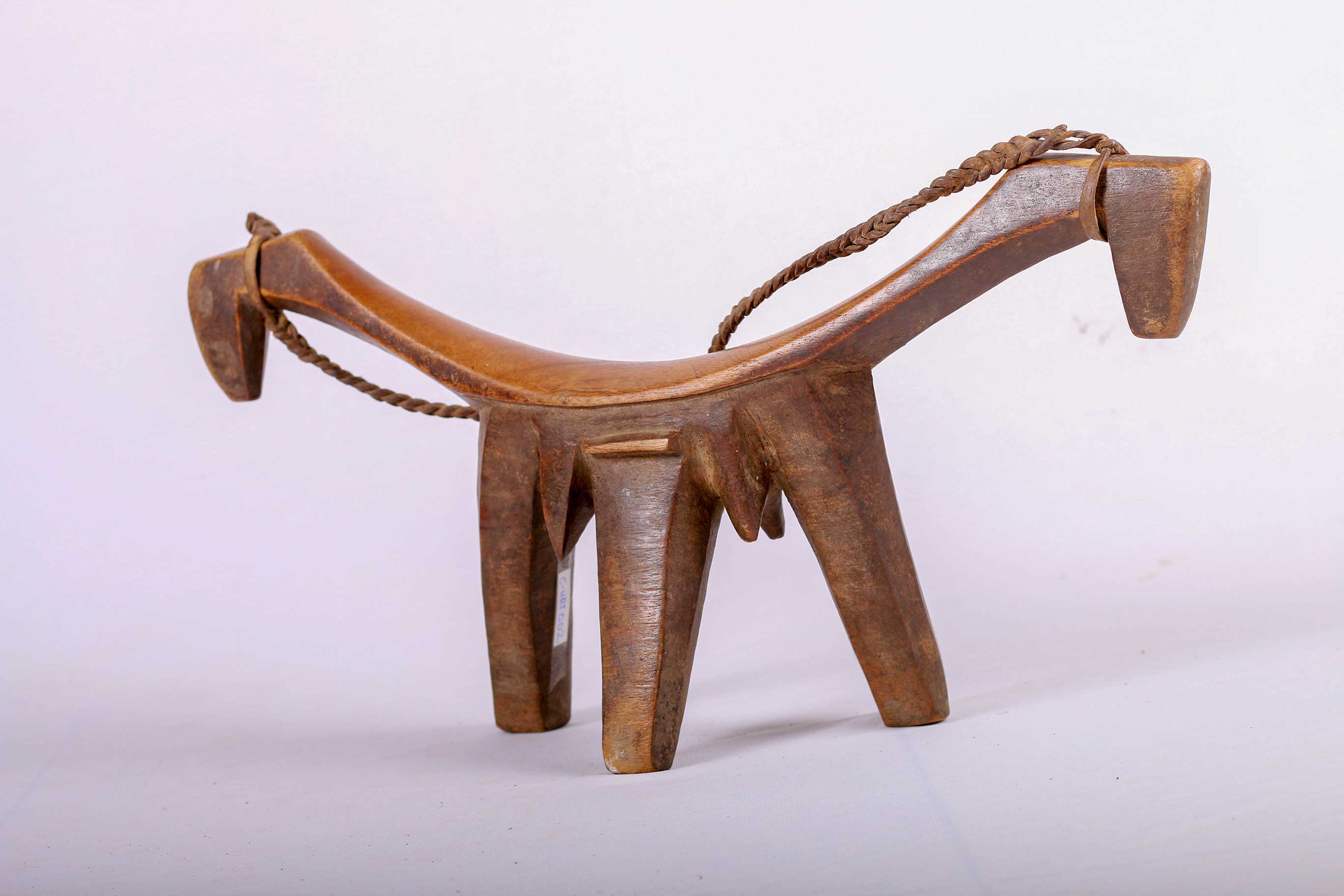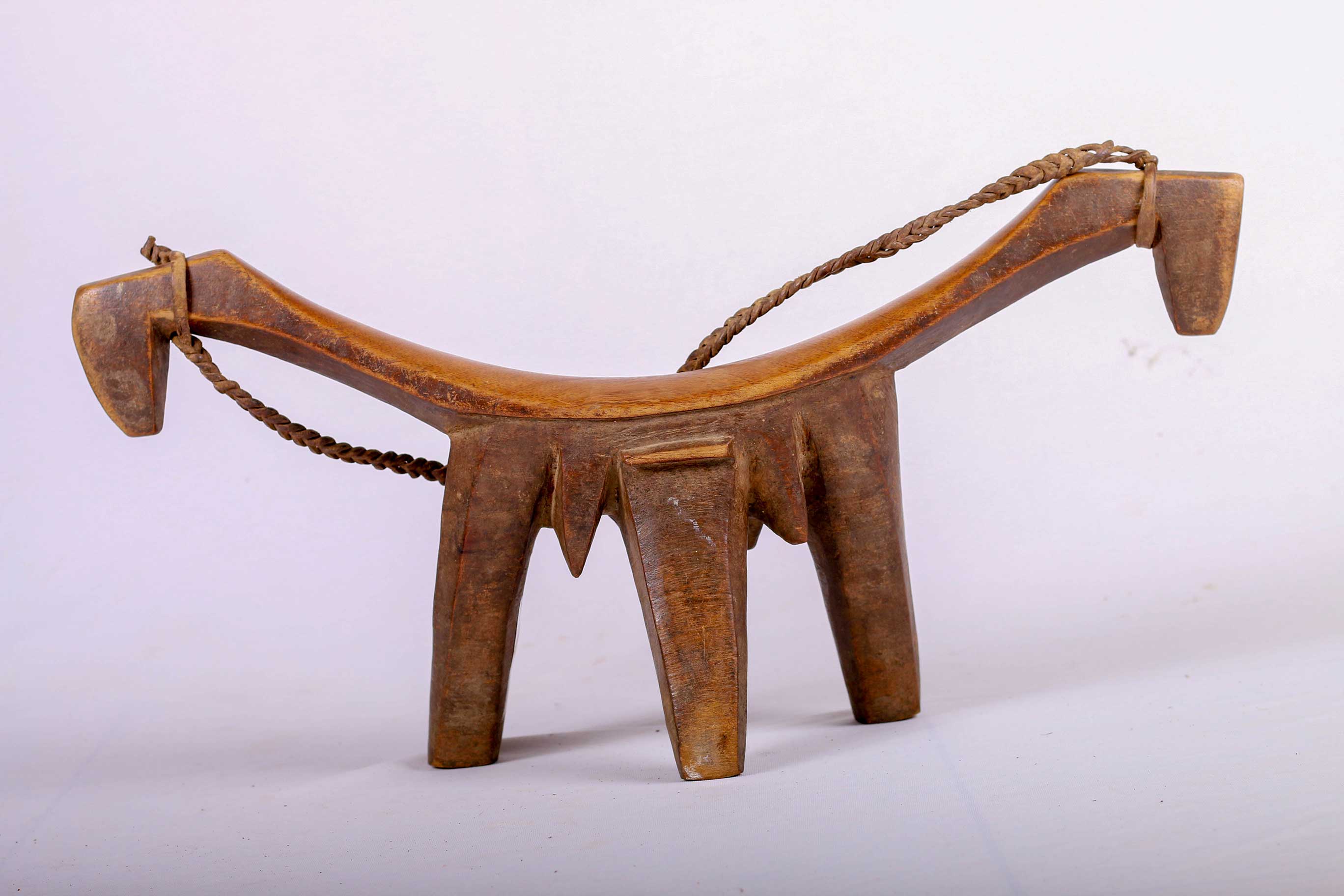 The simple forms produced by the Dinka and Nuer are often little more than the result of judicious pruning of a found branch to produce a three- or four-legged headrest. Zoomorphic features, such as a tail and a head, are sometimes brought out. These were used as pillows to help someone to have good sleep. They also used as a comfort to help protect ceremonial coiffure. In some occasions, headrests are used as a stool. As a personal object, the headrest has become part of the individual. Usually, when the person died, he is buried with his headrest. Sometimes the headrest is passed on to his heir, who would treat it with respect because this wooden piece embodies the spirit of the deceased person. Dinka headrests are primarily used by older men. The following headrest is crafted from hardwood and looks visibly old.