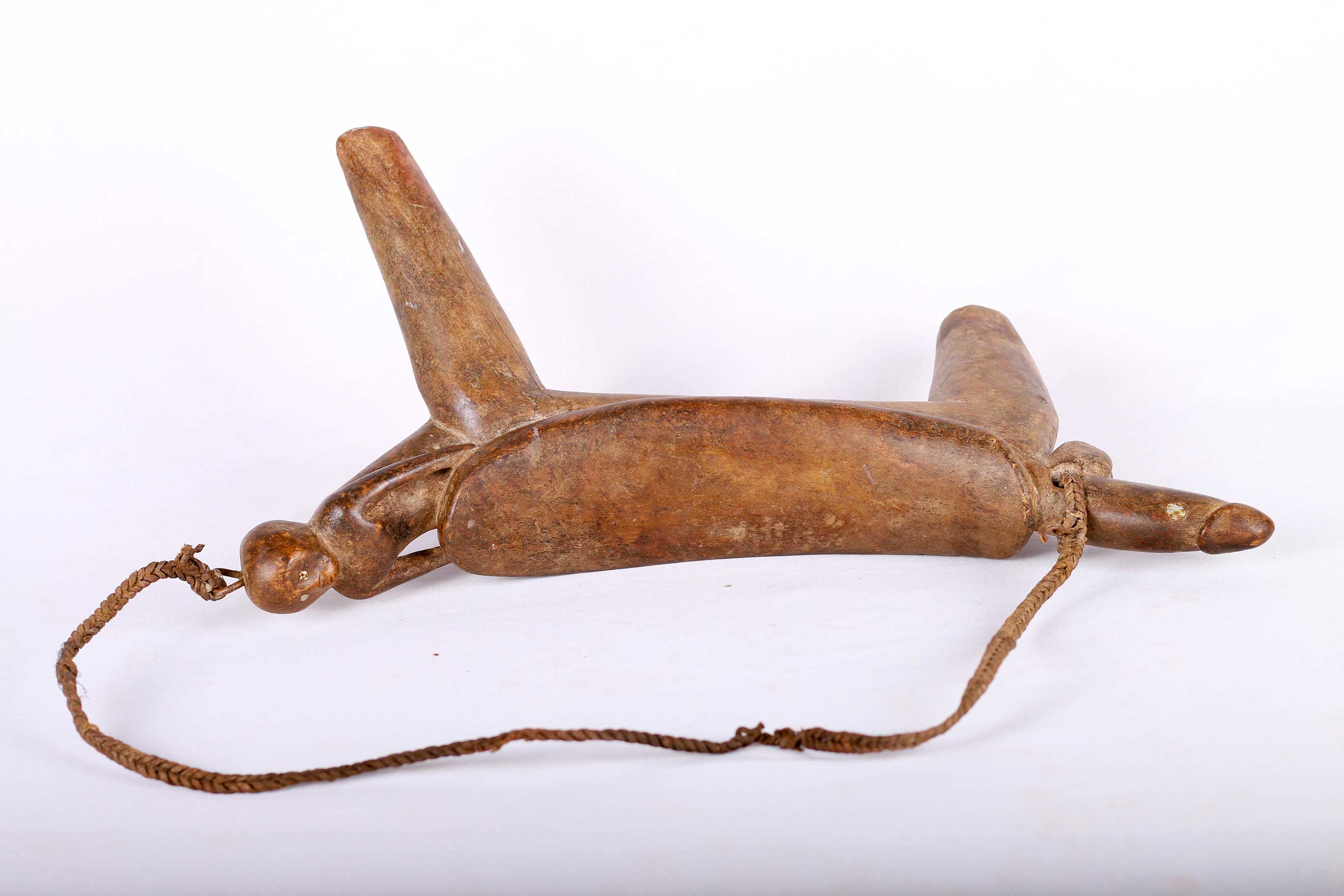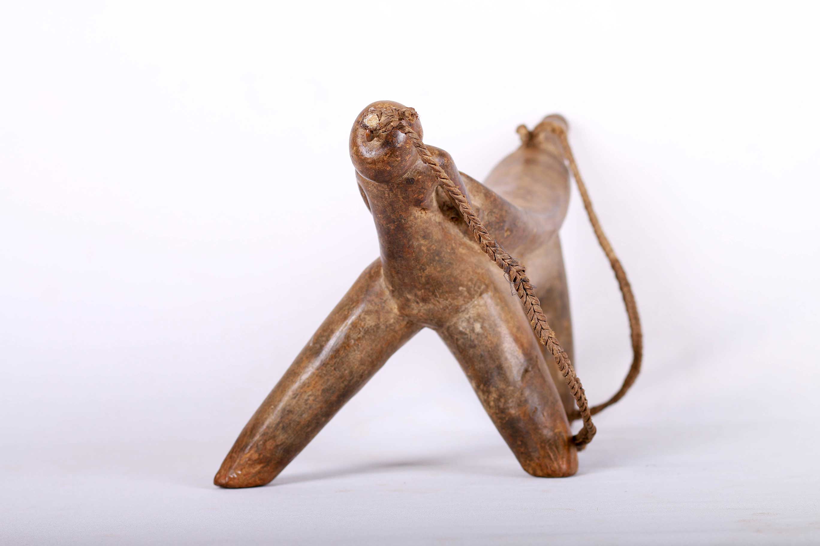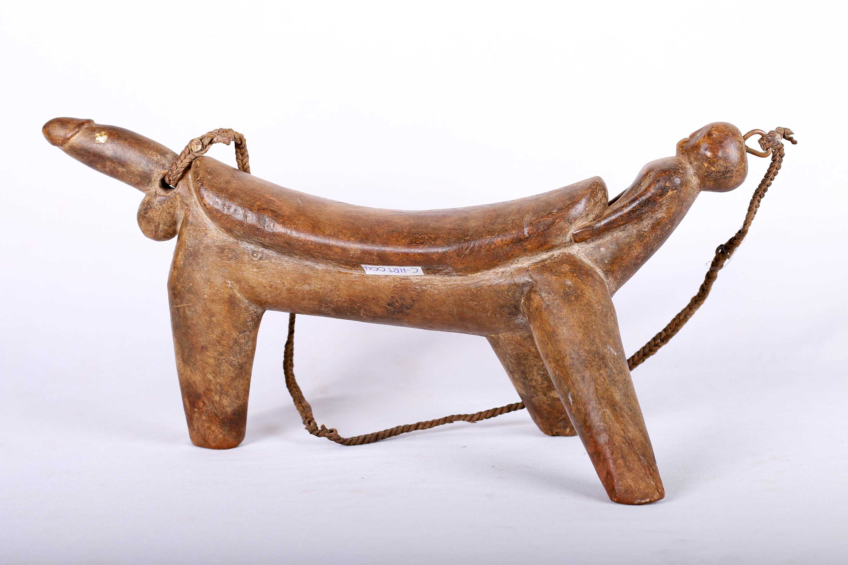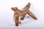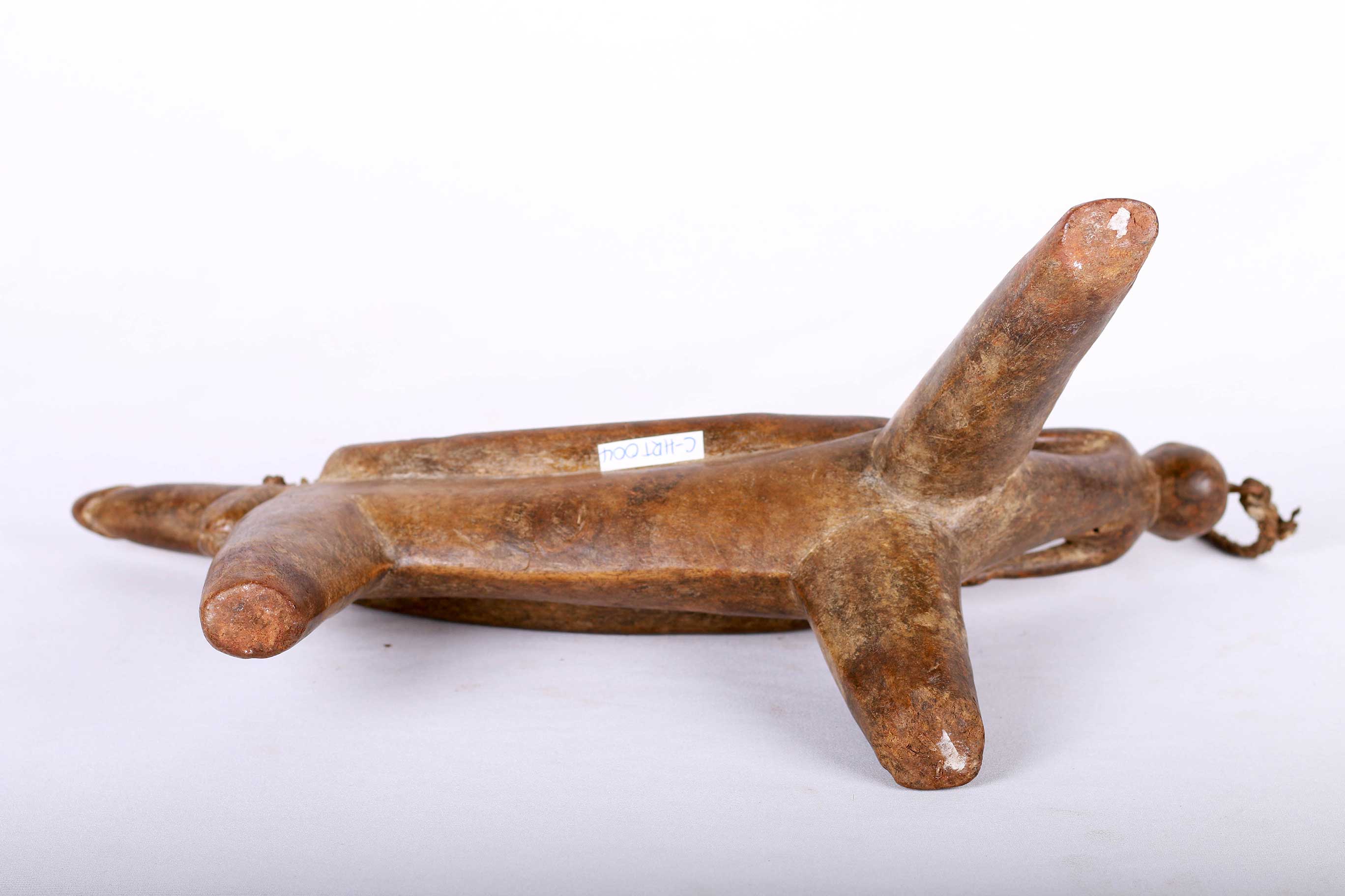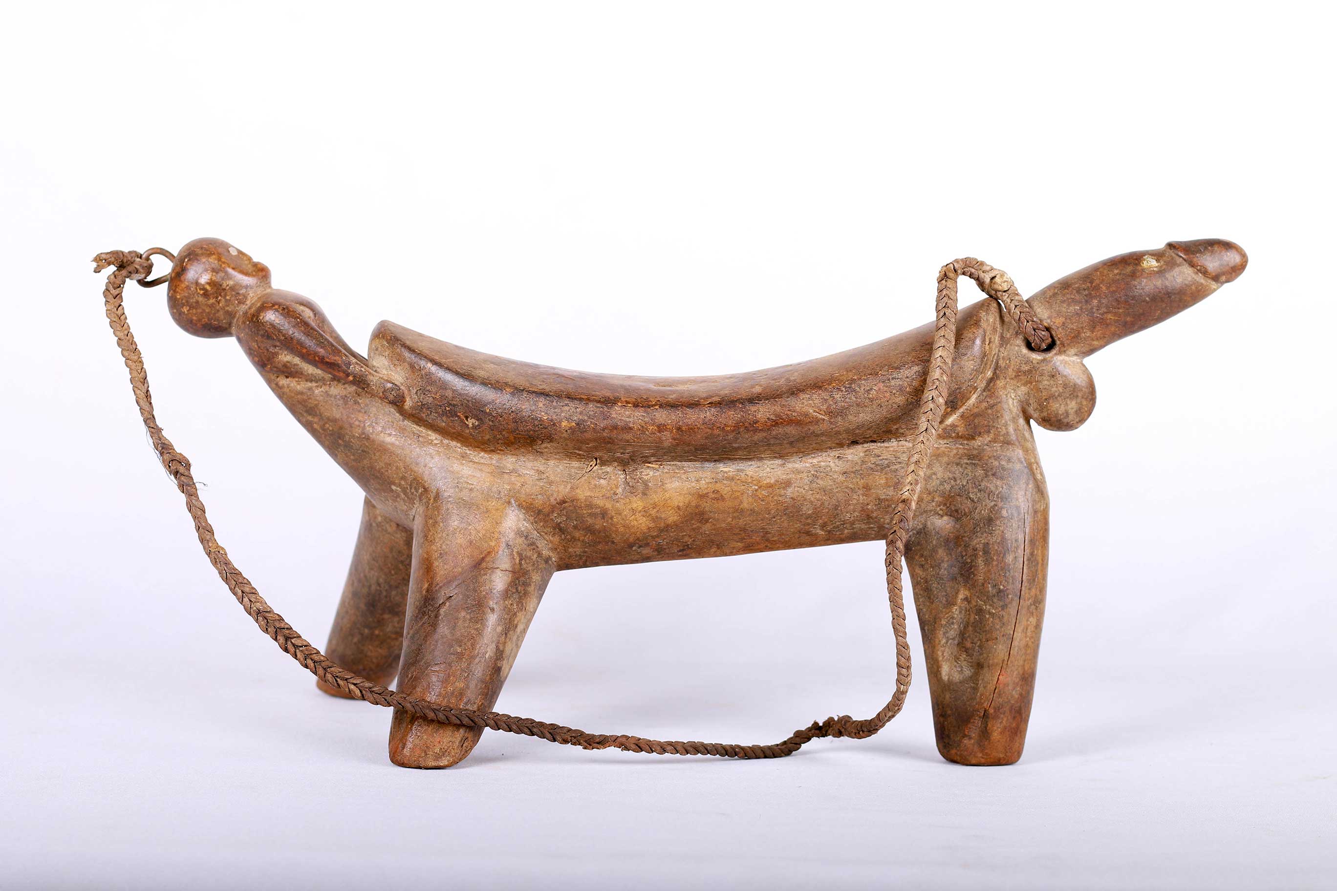 The simple forms produced by the Dinka and Nuer are often little more than the result of judicious pruning of a found branch to produce a three- or four-legged headrest. Zoomorphic features, such as a tail and a head, are sometimes brought out. These were used as pillows to help someone to have good sleep. They also used as a comfort to help protect ceremonial coiffure. In some occasions, headrests are used as a stool. As a personal object, the headrest has become part of the individual. Usually, when the person died, he is buried with his headrest. Sometimes the headrest is passed on to his heir, who would treat it with respect because this wooden piece embodies the spirit of the deceased person. Dinka headrests are primarily used by older men. The following headrest is crafted from hardwood and looks visibly old.