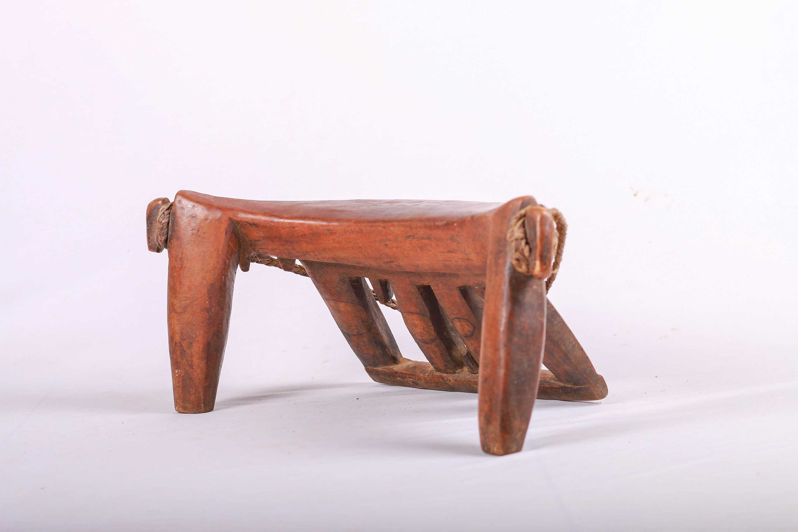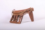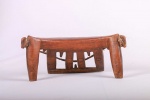 The simple forms produced by the Dinka and Nuer are often little more than the result of judicious pruning of a found branch to produce a three- or four-legged headrest. Zoomorphic features, such as a tail and a head, are sometimes brought out. These were used as pillows to help someone to have good sleep. They also used as a comfort to help protect ceremonial coiffure. In some occasions, headrests are used as a stool. As a personal object, the headrest has become part of the individual. Usually, when the person died, he is buried with his headrest. Sometimes the headrest is passed on to his heir, who would treat it with respect because this wooden piece embodies the spirit of the deceased person. Dinka headrests are primarily used by older men. The following headrest is crafted from hardwood and looks visibly old.