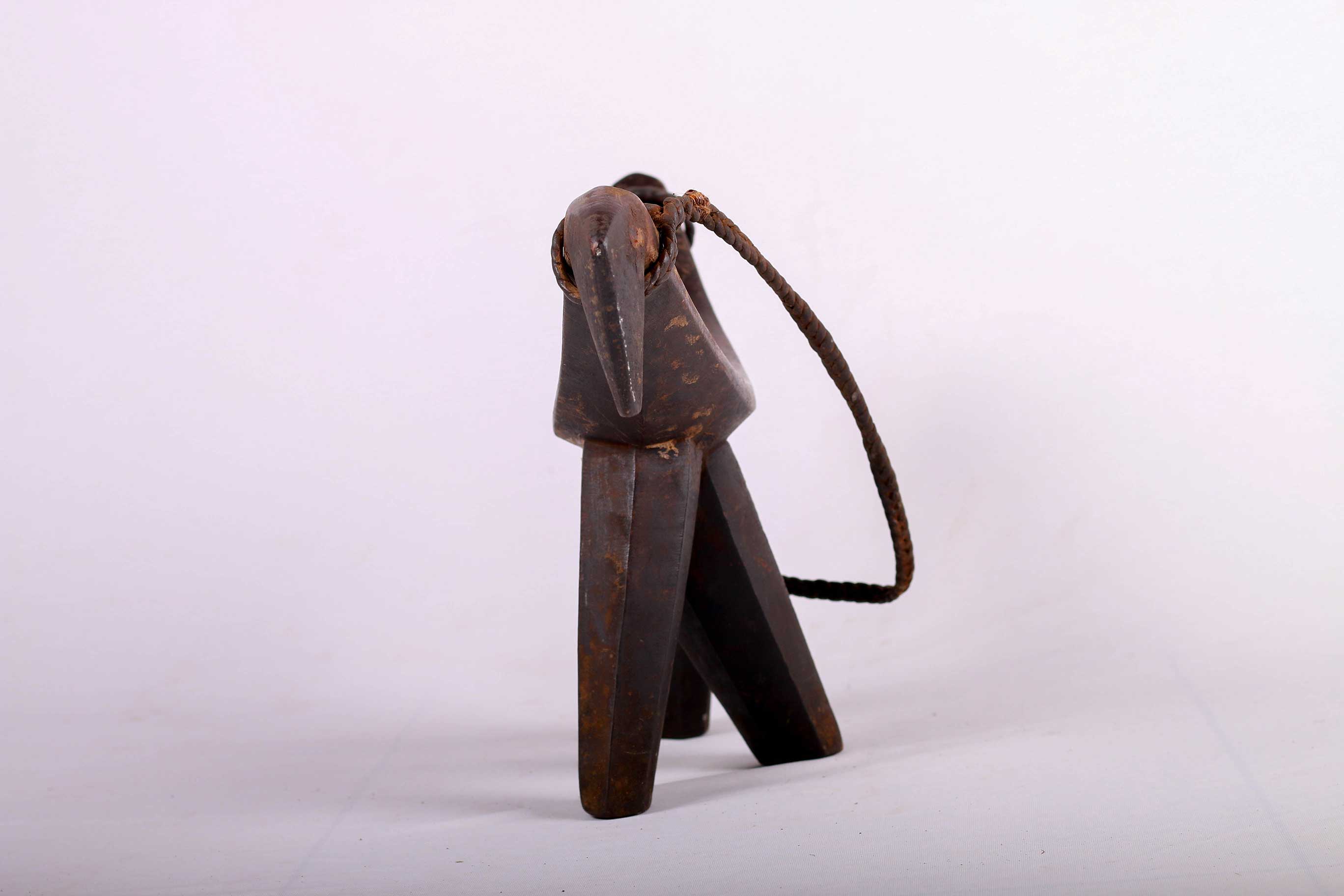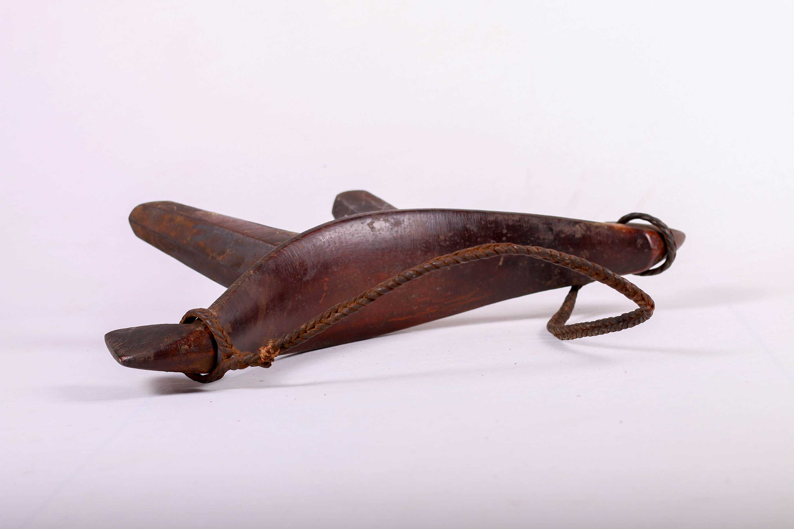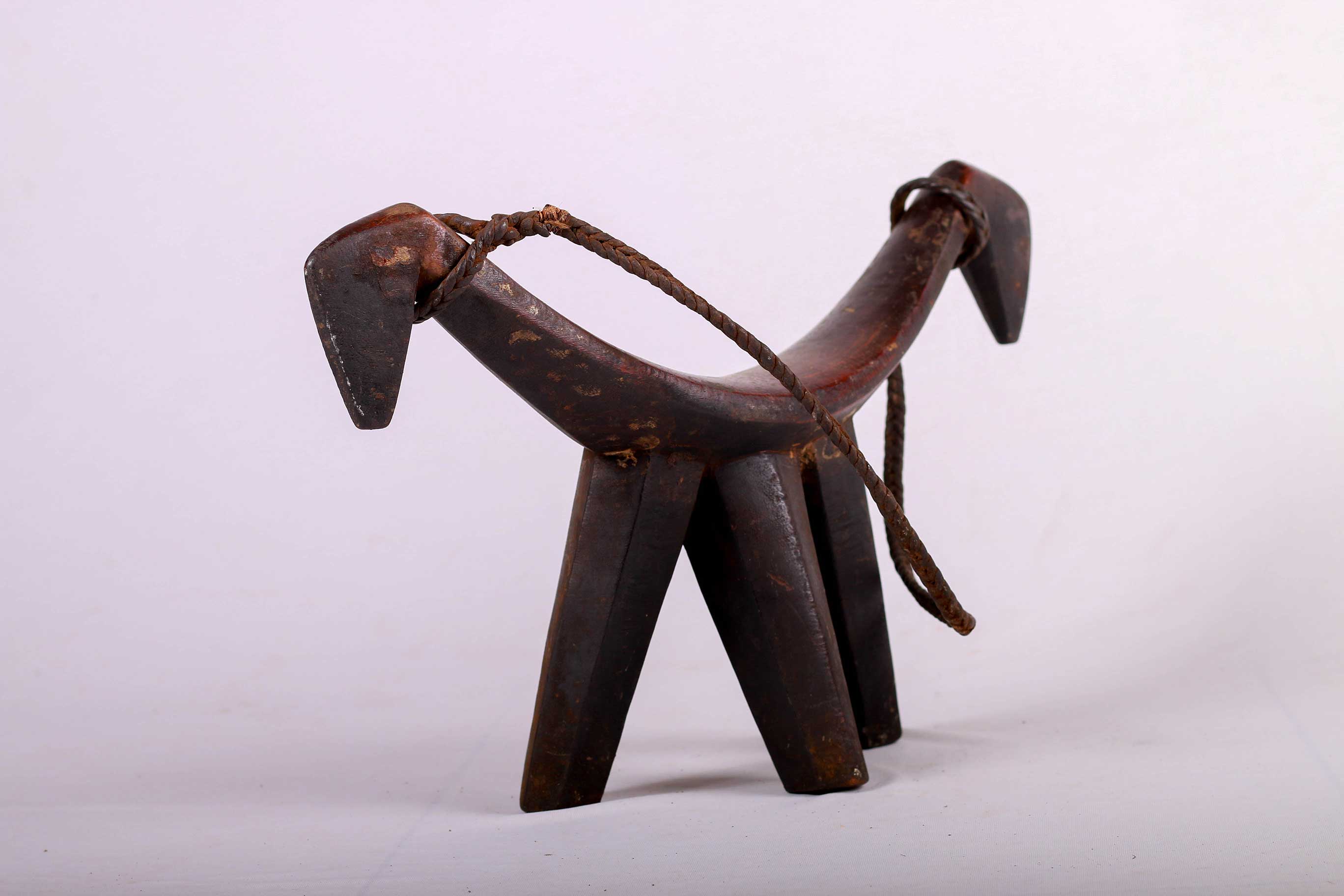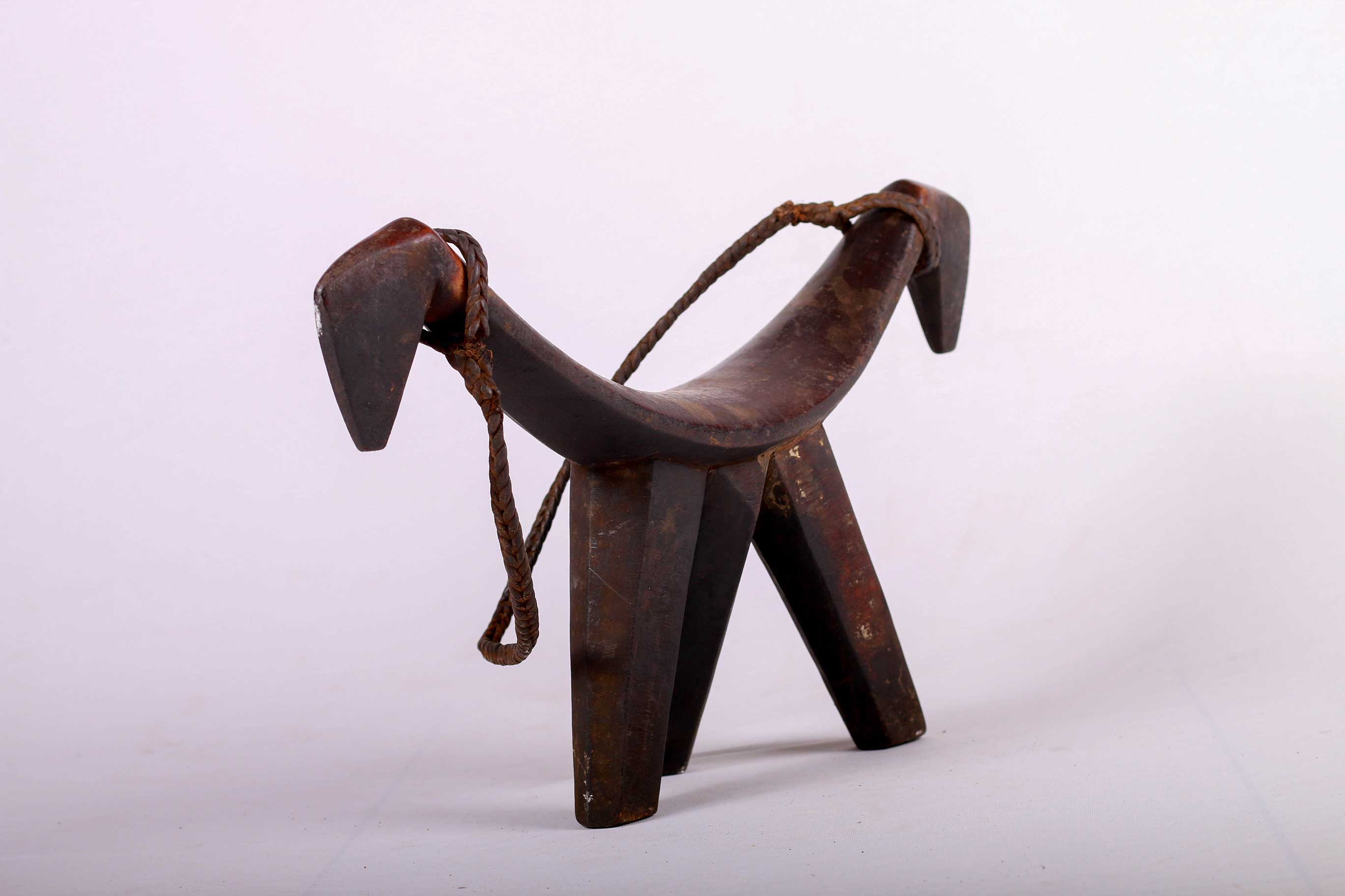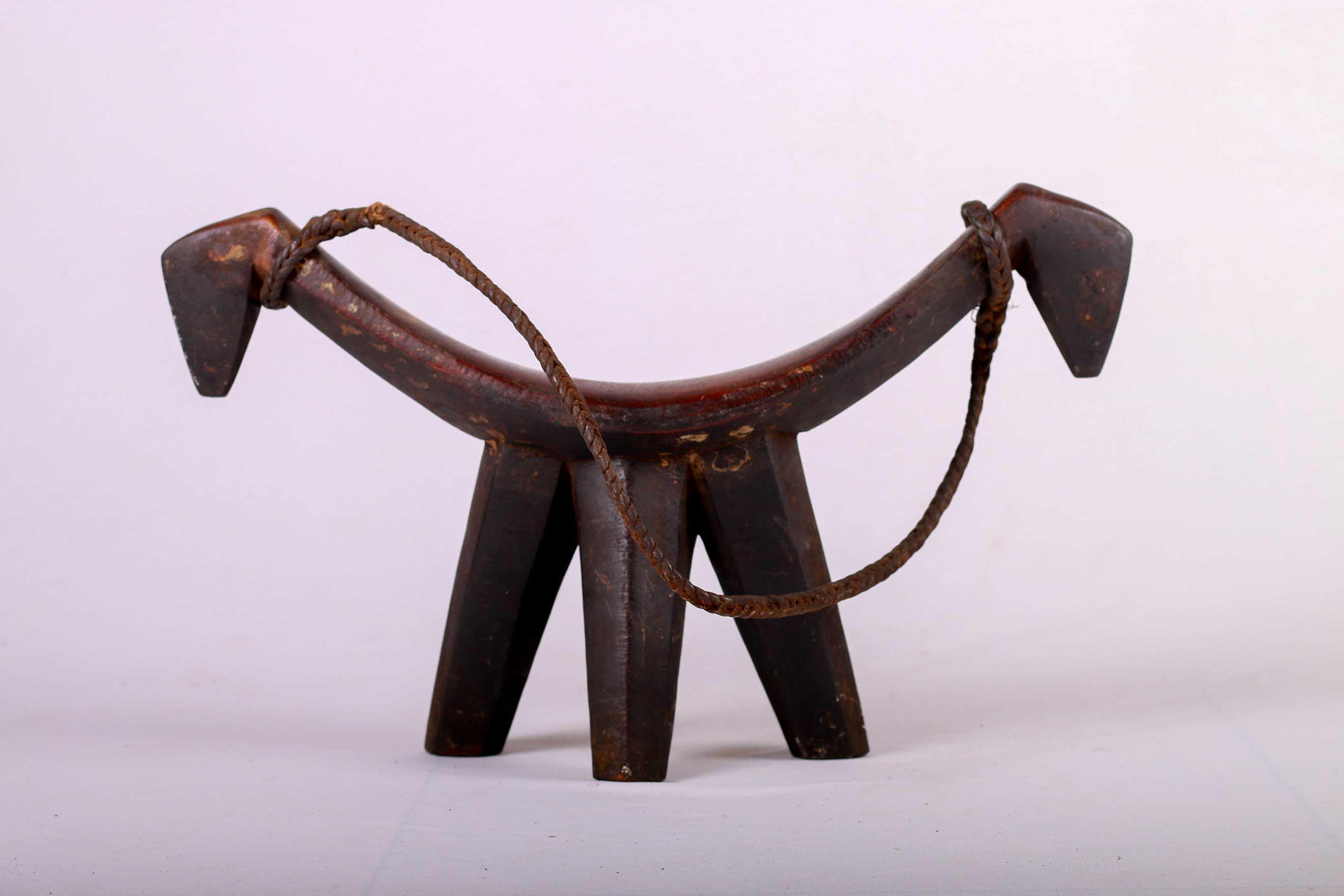 Such headrests were inspired by the aesthetics of cattle. The shape of this headrest is suggestive of the elegant horns of a cow. The legs taking the form of tubular columns. The owner of this headrest was a powerful man. It has a woven twisted leather as a handle. It was also used as a seat, with the convex platform resting on three vertical columns. This piece has a wonderful dark brown patina and shows signs of usage and old age.