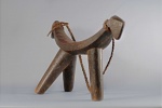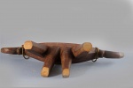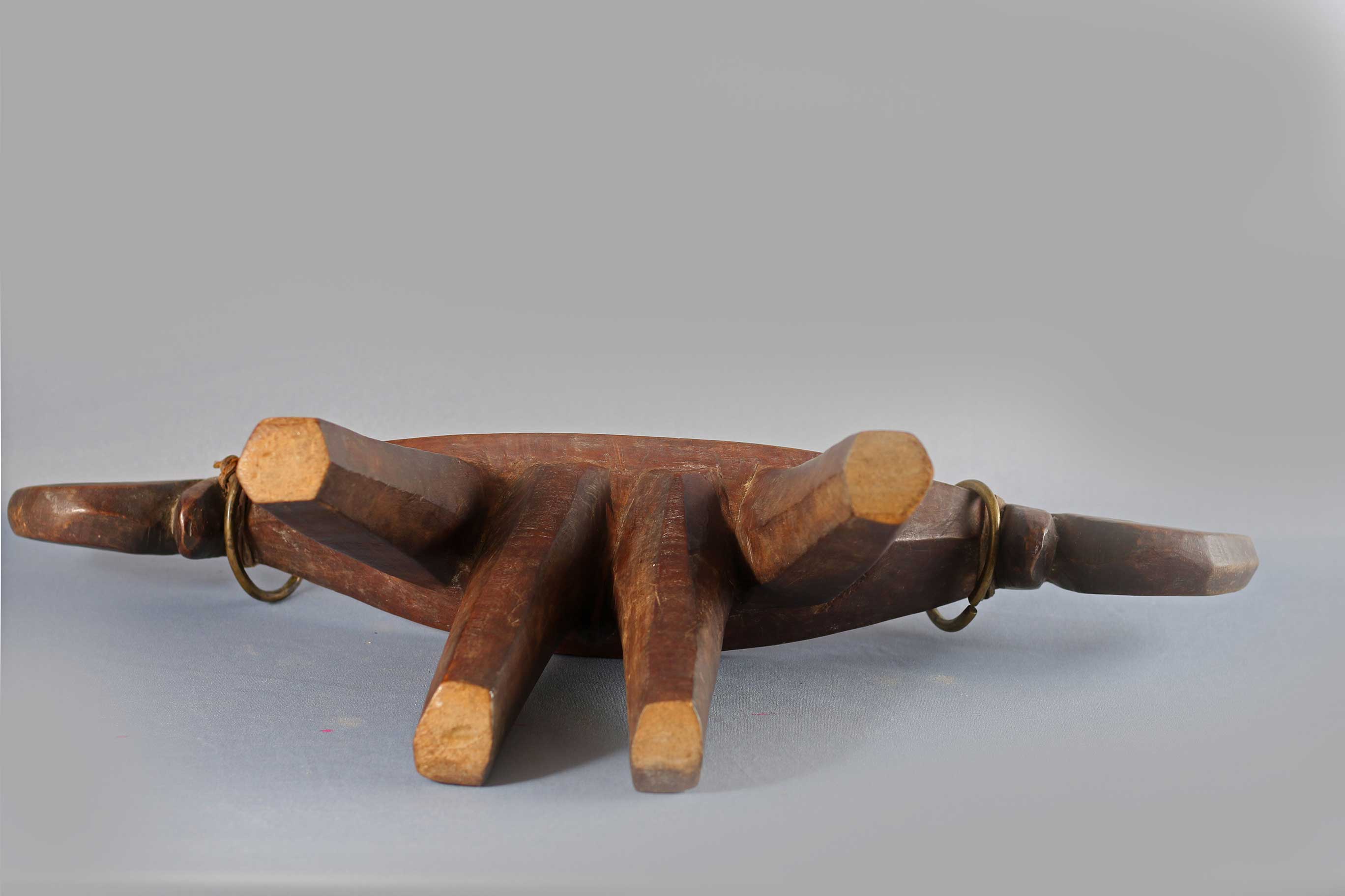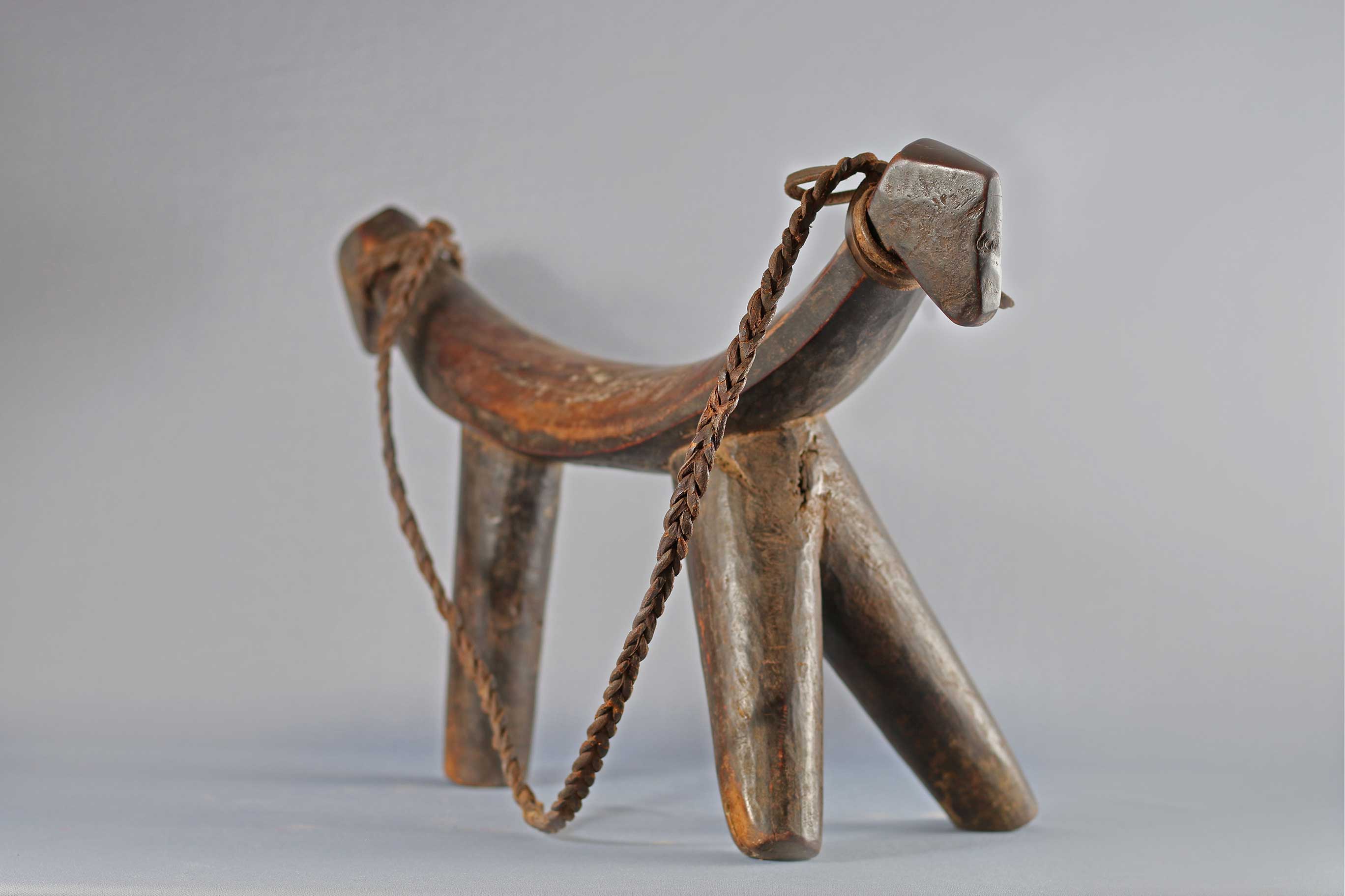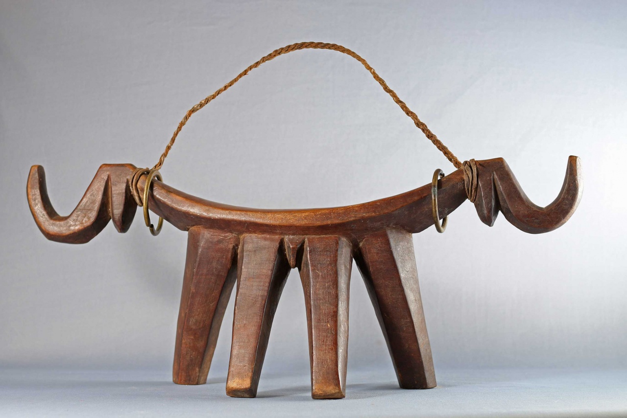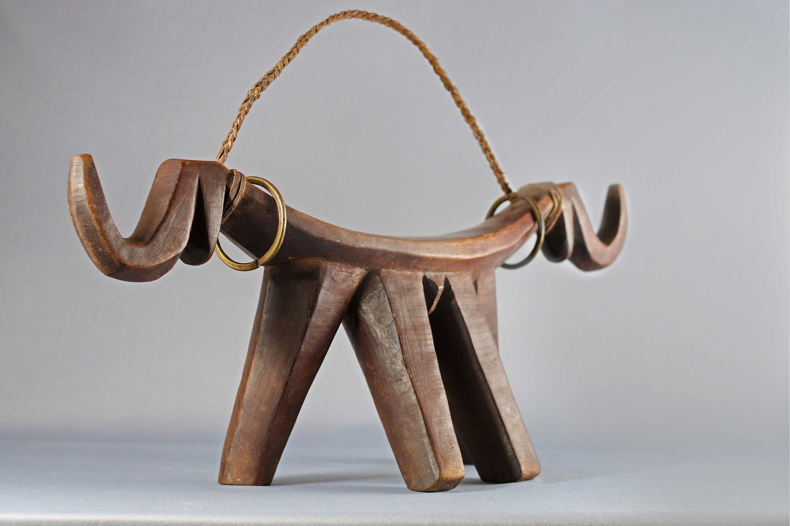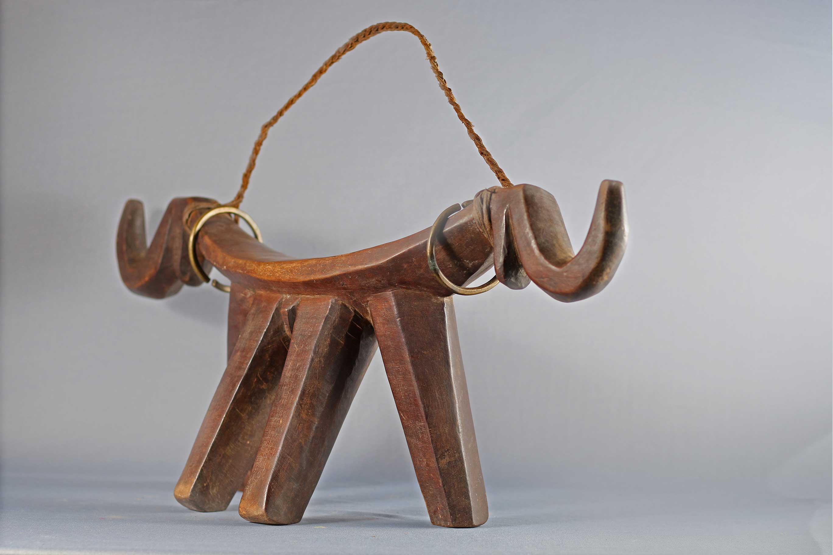 Such headrests were inspired by the aesthetics of cattle. The shape of this headrest is suggestive of the elegant horns of a cow. The legs taking the form of tubular columns. The owner of this headrest was a powerful man. It has a woven twisted leather as a handle. It was also used as a seat, with the convex platform resting on three vertical columns. This piece has wonderful brown patina and shows signs of usage and old age.