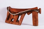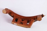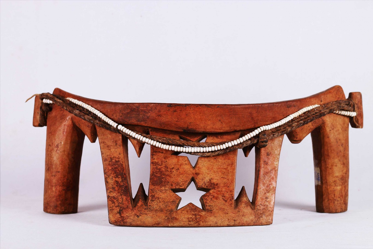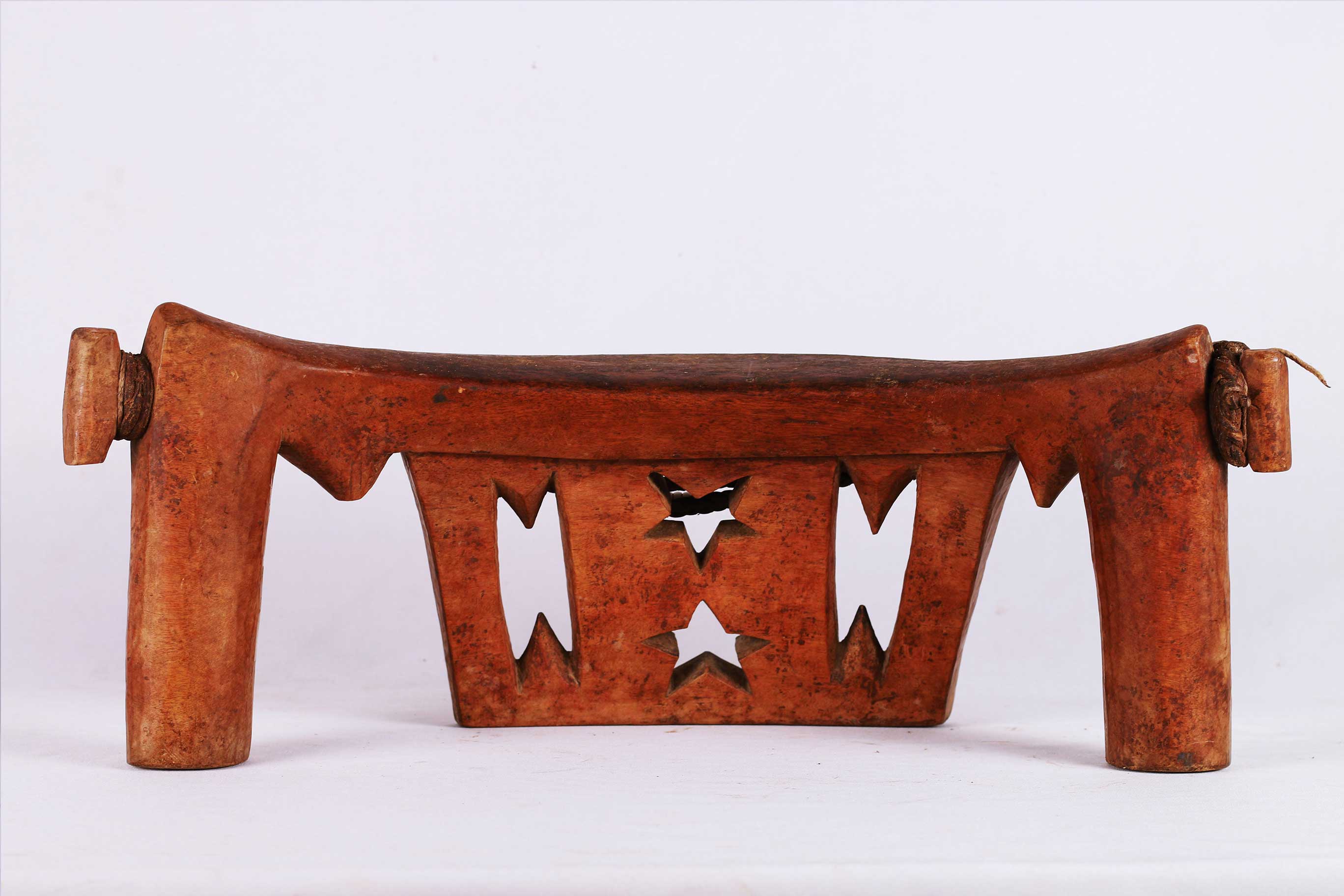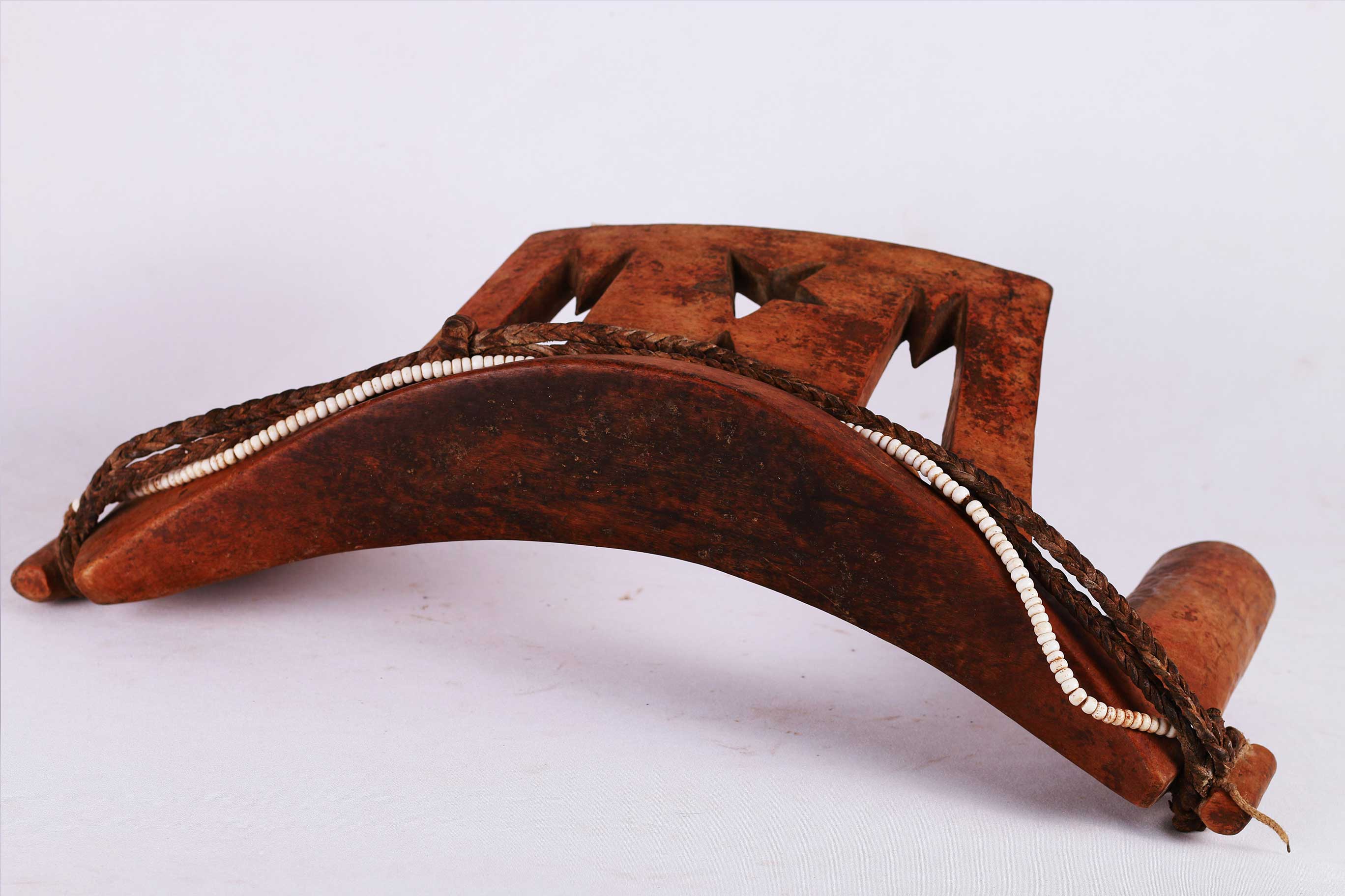 The simple forms produced by the Dinka and Nuer are often little more than the result of judicious pruning of a found branch to produce a three- or four-legged headrest. Zoomorphic features, such as a tail and a head, are sometimes brought out. These were used as pillows to help someone to have good sleep. They also used as a comfort to help protect ceremonial coiffure. In some occasions, headrests are used as a stool. As a personal object, the headrest has become part of the individual. Usually, when the person died, he is buried with his headrest. Sometimes the headrest is passed on to his heir, who would treat it with respect because this wooden piece embodies the spirit of the deceased person. Dinka headrests are primarily used by older men. The following headrest is crafted from hardwood and looks visibly old.