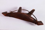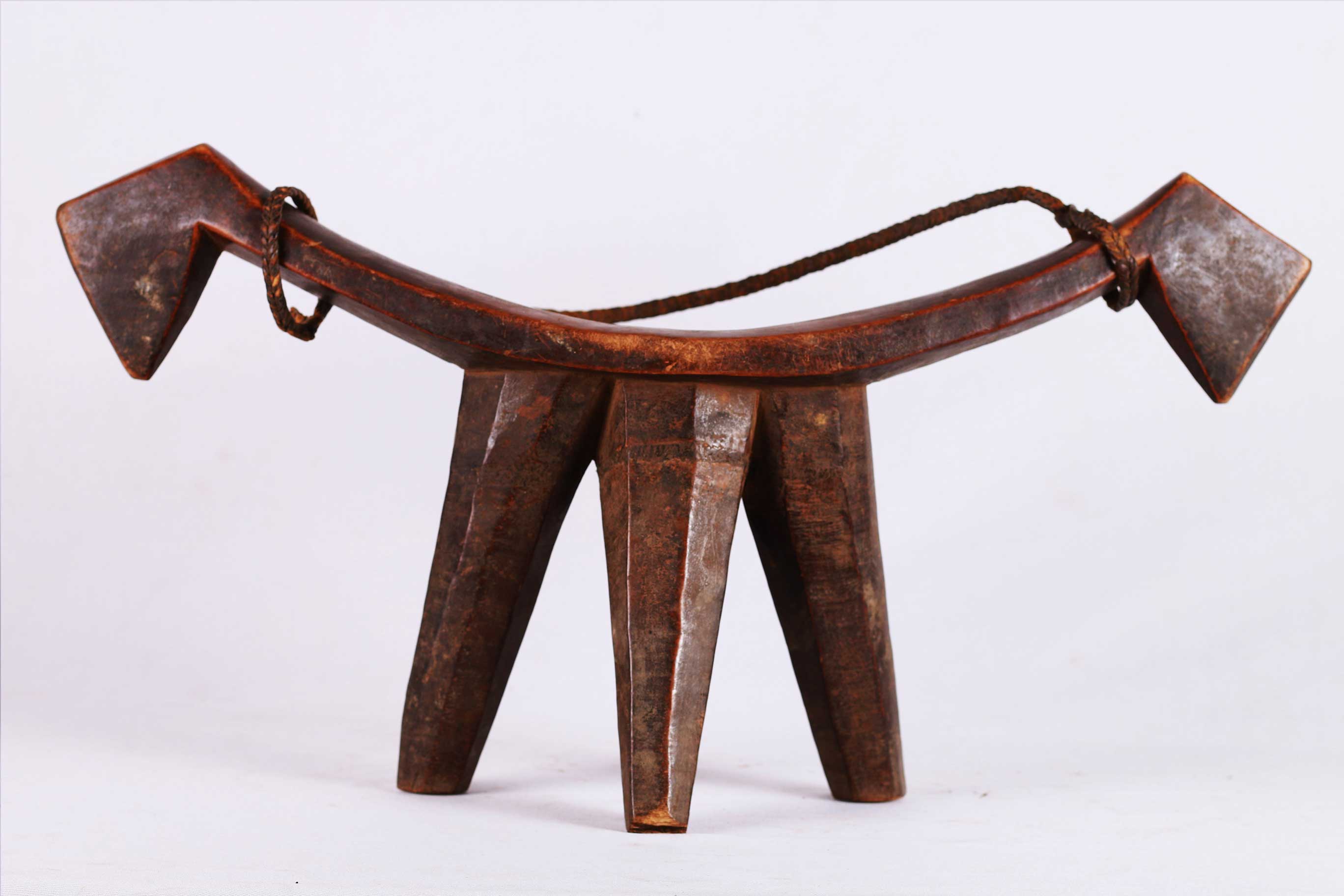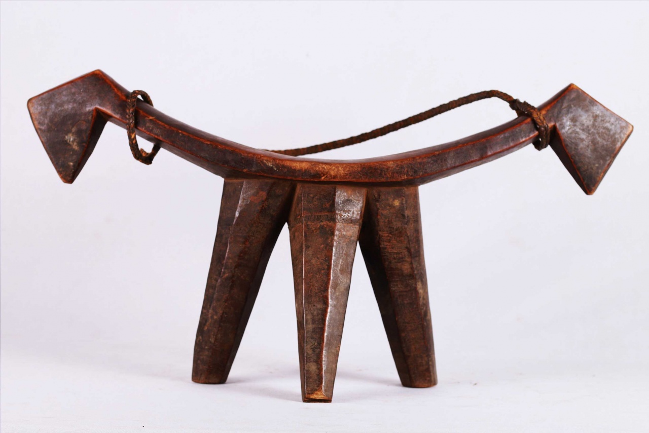 four-legged headrest. Zoomorphic features, such as a tail and a head, are sometimes brought out. These were used as pillows to help someone to have good sleep. They also used as a comfort to help protect ceremonial coiffure. On some occasions, headrests are used as a stool. As a personal object, the headrest has become part of the individual. Usually, when the person died, he is buried with his headrest. Sometimes the headrest is passed on to his heir, who would treat it with respect because this wooden piece embodies the spirit of the deceased person. Dinka headrests are primarily used by older men. The following headrest is crafted from hardwood and looks visibly old.