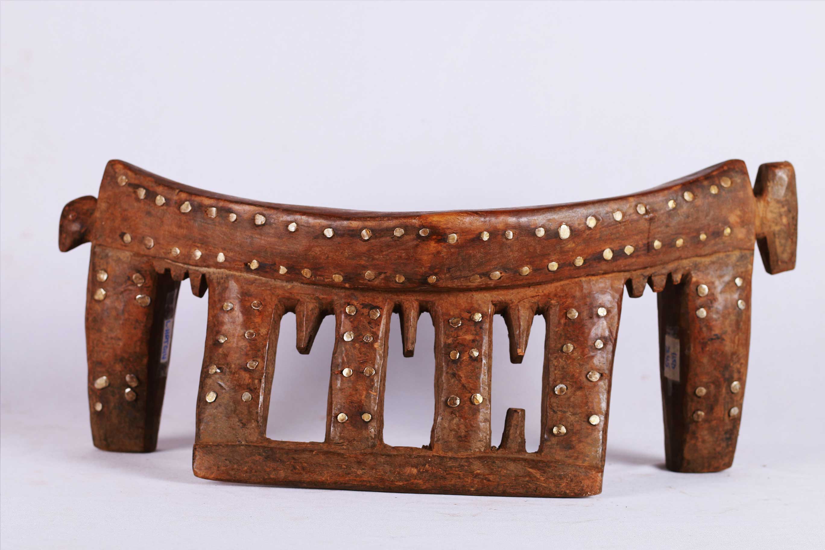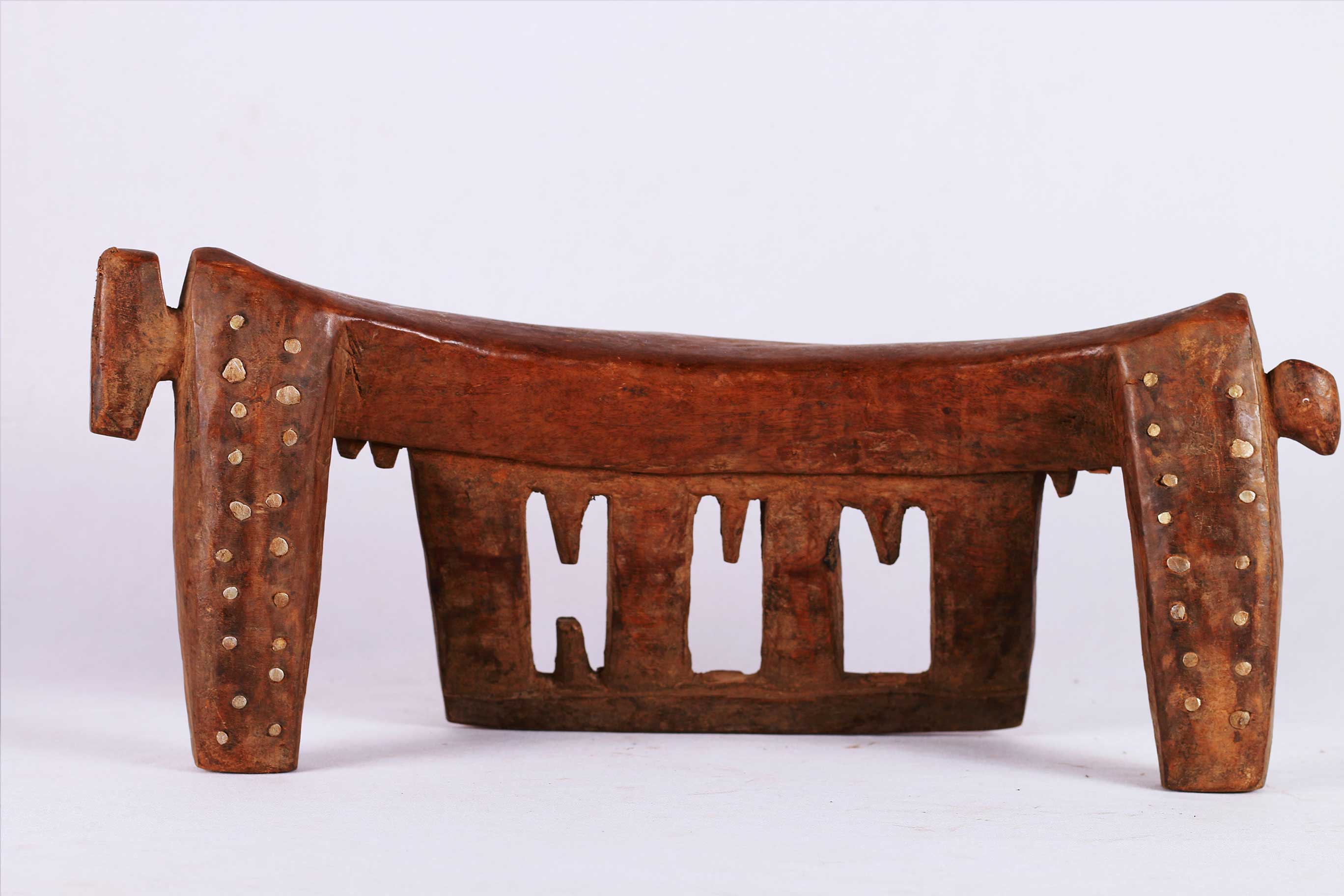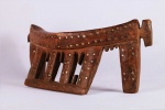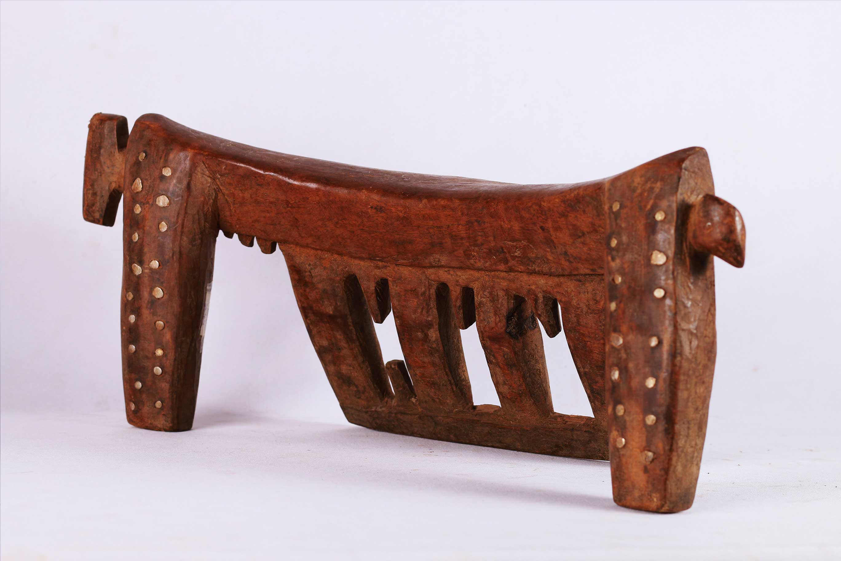 The simple forms produced by the Dinka and Nuer are often little more than the result of pruning of a found branch to produce a three- or four-legged headrest. Zoomorphic features, such as a tail and a head, are sometimes brought out. These were used as pillows to help someone to have good sleep. They also used as a comfort to help protect ceremonial coiffure. In some occasions, headrests are used as a stool. As a personal object, the headrest has become part of the individual. Usually, when the person died, he is buried with his headrest. Sometimes the headrest is passed on to his heir, who would treat it with respect because this wooden piece embodies the spirit of the deceased person. Dinka headrests are primarily used by older men. The following headrest is crafted from hardwood and looks visibly old.