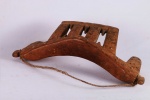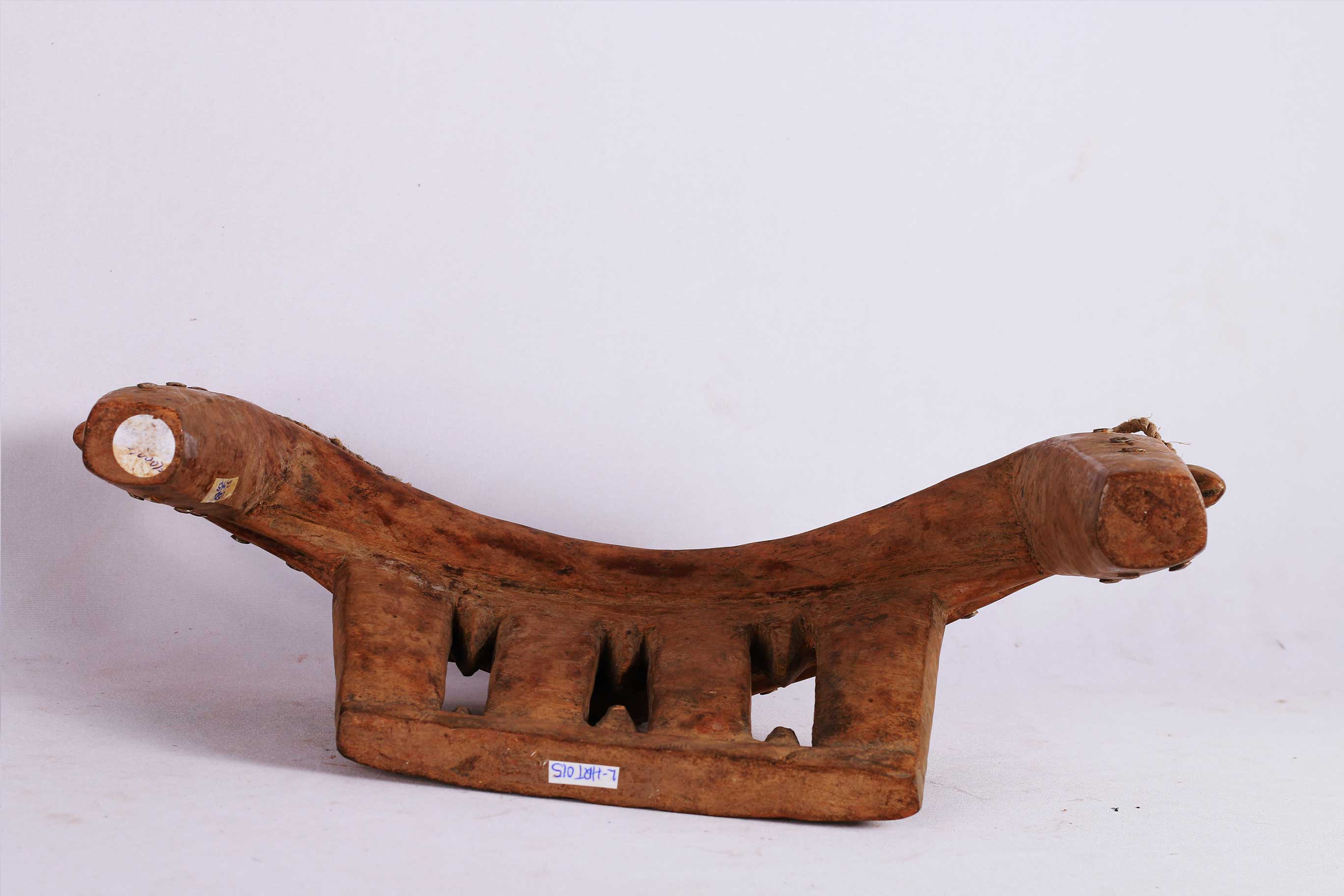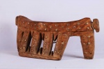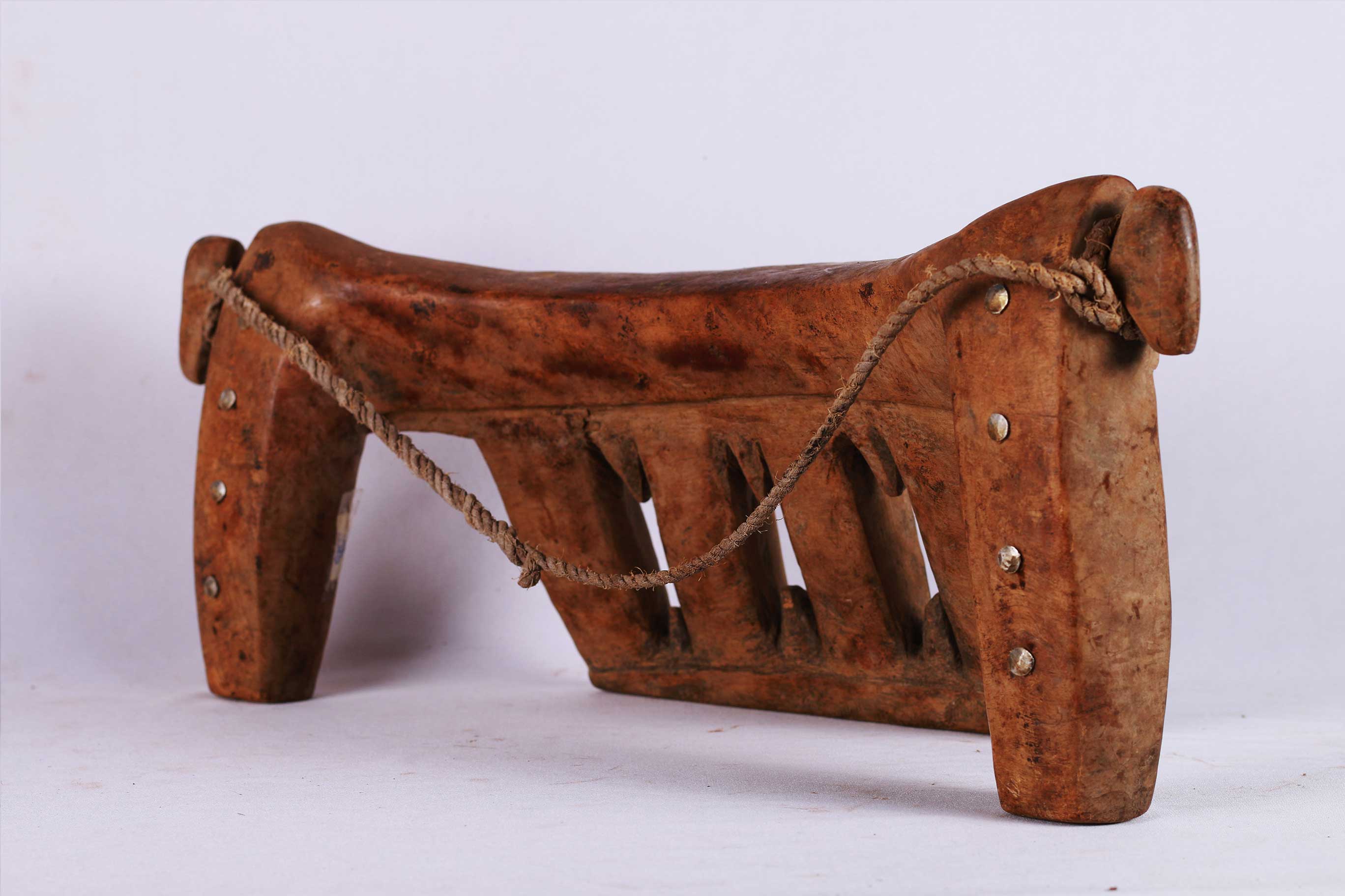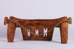 four-legged headrest. Zoomorphic features, such as a tail and a head, are sometimes brought out. These were used as pillows to help someone to have good sleep. They also used as a comfort to help protect ceremonial coiffure. In some occasions, headrests are used as a stool. As a personal object, the headrest has become part of the individual. Usually, when the person died, he is buried with his headrest. Sometimes the headrest is passed on to his heir, who would treat it with respect because this wooden piece embodies the spirit of the deceased person. Dinka headrests are primarily used by older men. The following headrest is crafted from hardwood and looks visibly old.