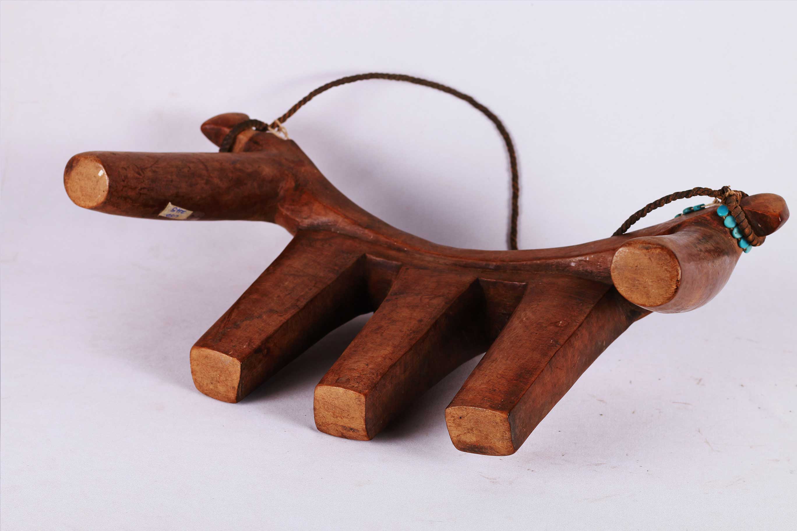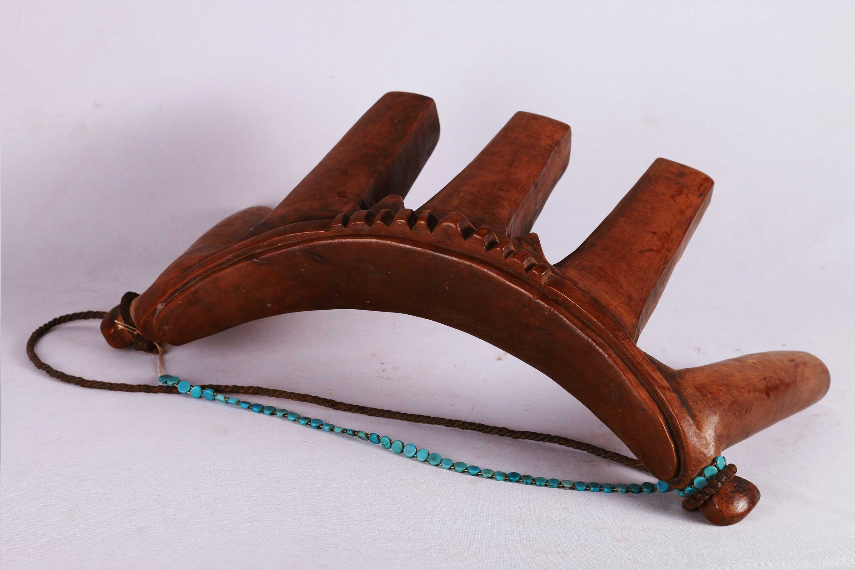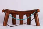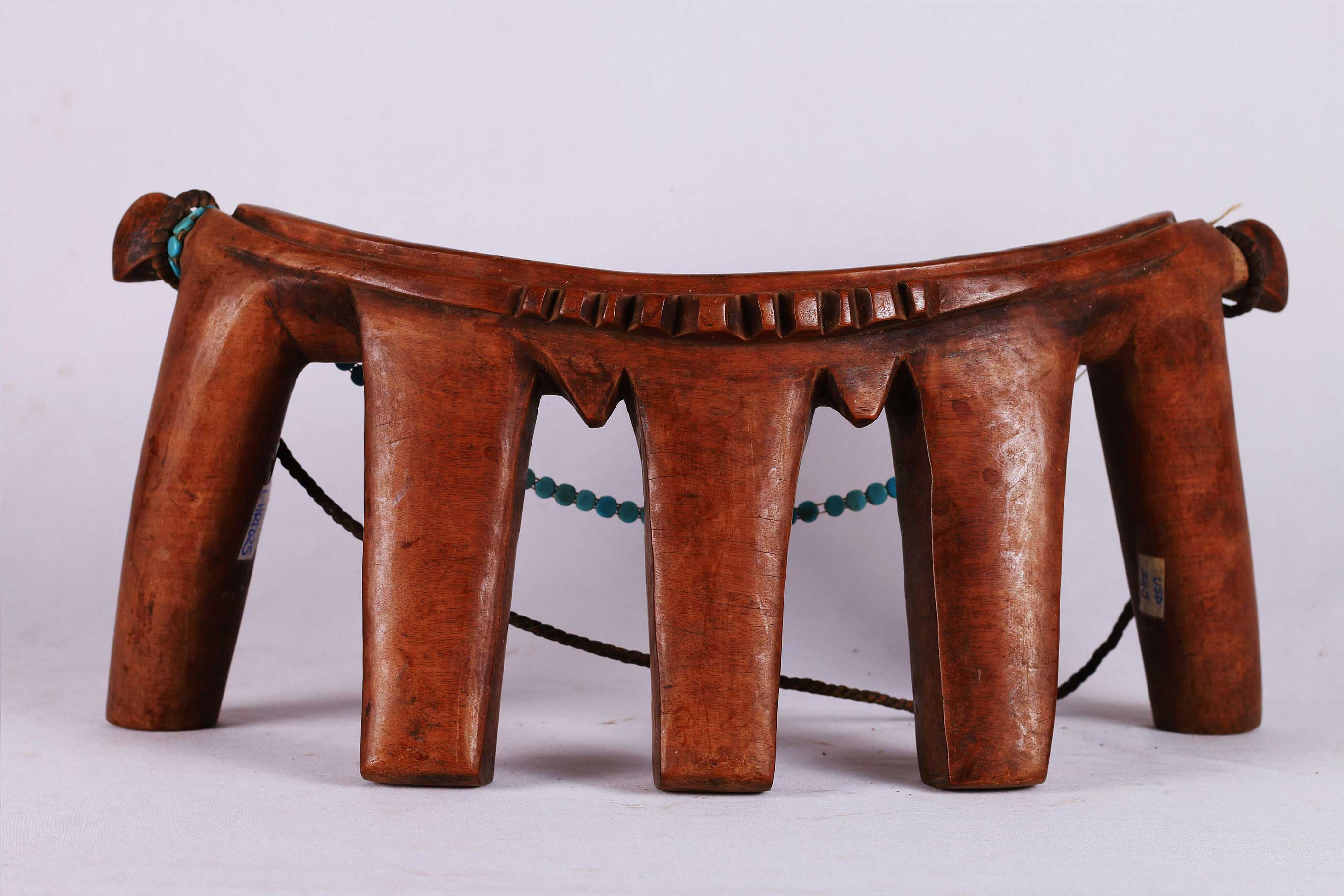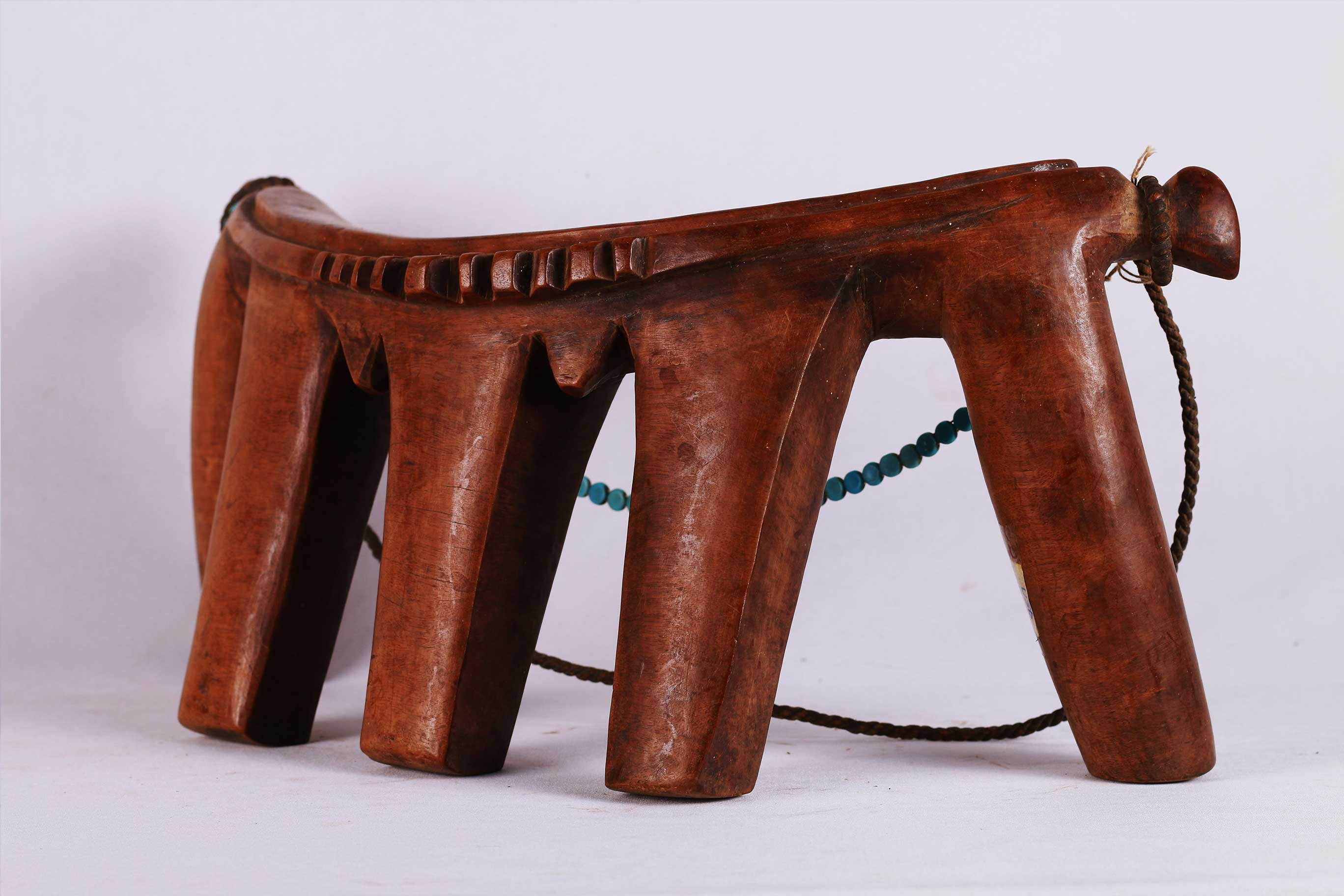 four-legged headrest. Zoomorphic features, such as a tail and a head, are sometimes brought out. These were used as pillows to help someone to have good sleep. They also used as a comfort to help protect ceremonial coiffure. In some occasions, headrests are used as a stool. As a personal object, the headrest has become part of the individual. Usually, when the person died, he is buried with his headrest. Sometimes the headrest is passed on to his heir, who would treat it with respect because this wooden piece embodies the spirit of the deceased person. Dinka headrests are primarily used by older men. The following headrest is crafted from hardwood and looks visibly old.
