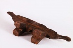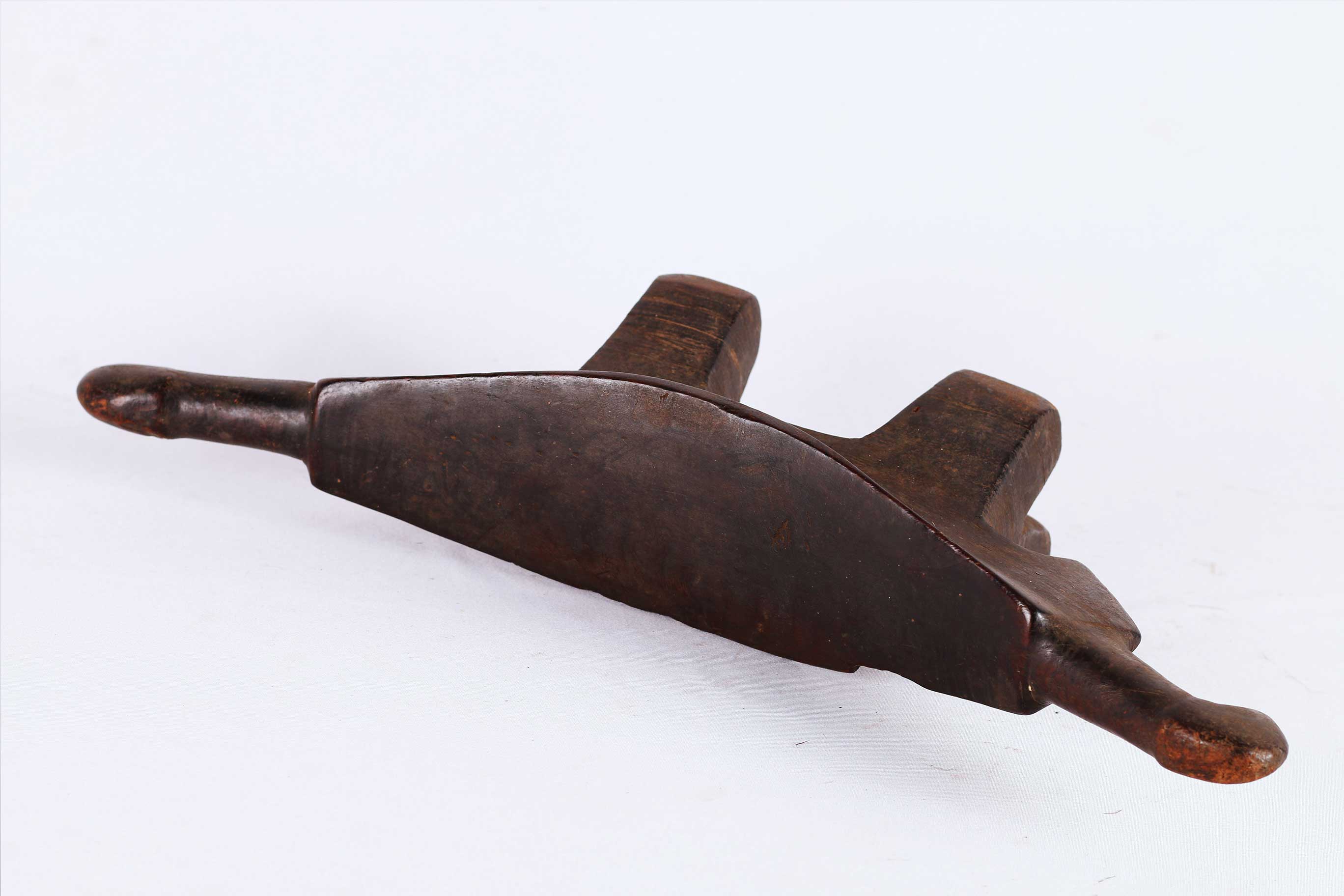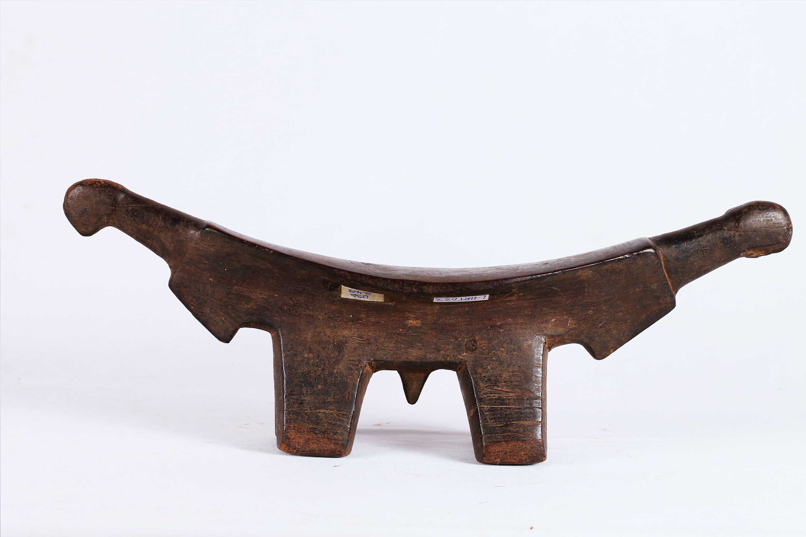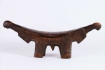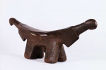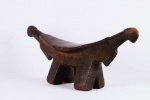 four-legged headrest. Zoomorphic features, such as a tail and a head, are sometimes brought out. These were used as pillows to help someone to have good sleep. They also used as a comfort to help protect ceremonial coiffure. In some occasions, headrests are used as a stool. As a personal object, the headrest has become part of the individual. Usually, when the person died, he is buried with his headrest. Sometimes the headrest is passed on to his heir, who would treat it with respect because this wooden piece embodies the spirit of the deceased person. Dinka headrests are primarily used by older men. The following headrest is crafted from hardwood and looks visibly old.