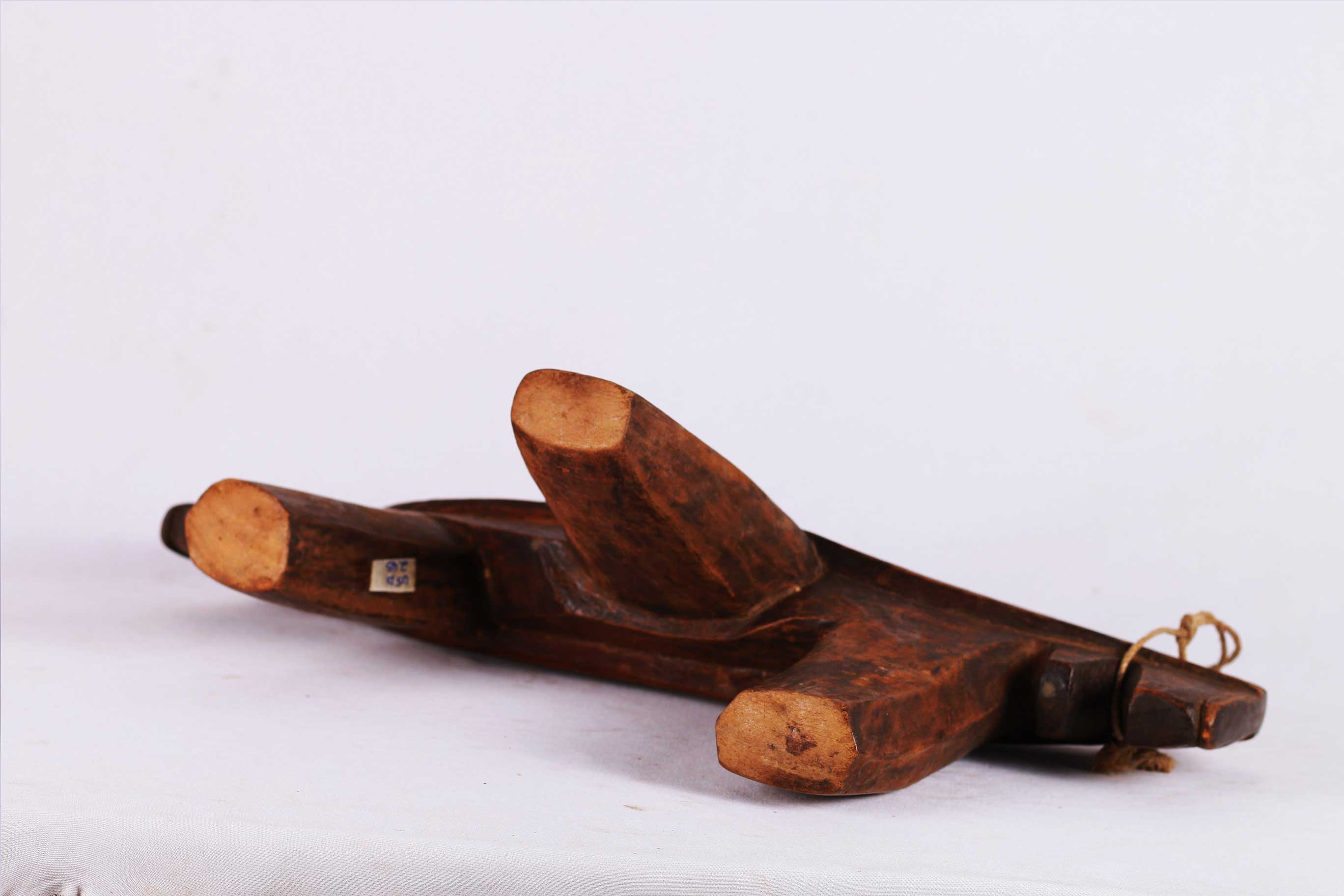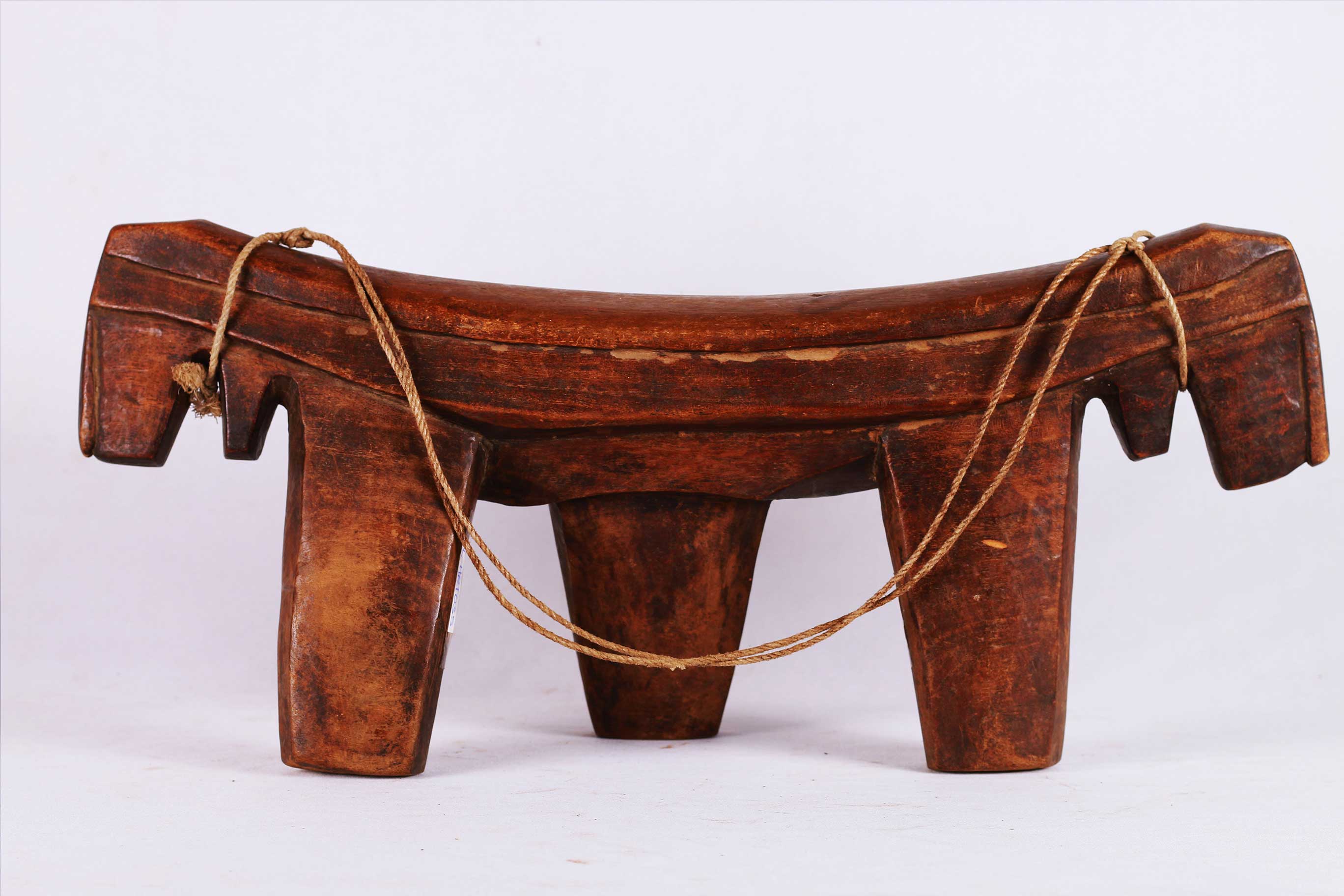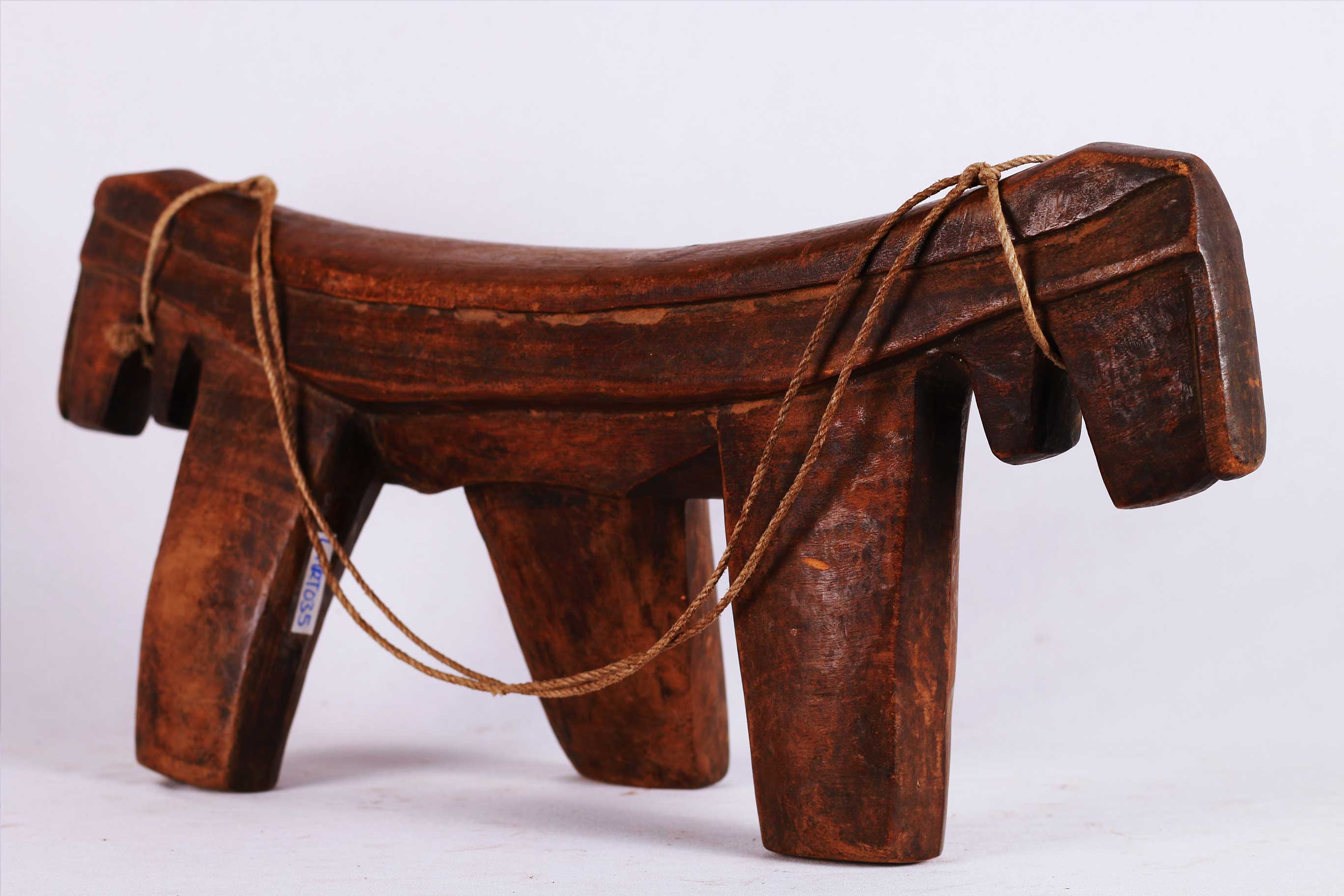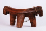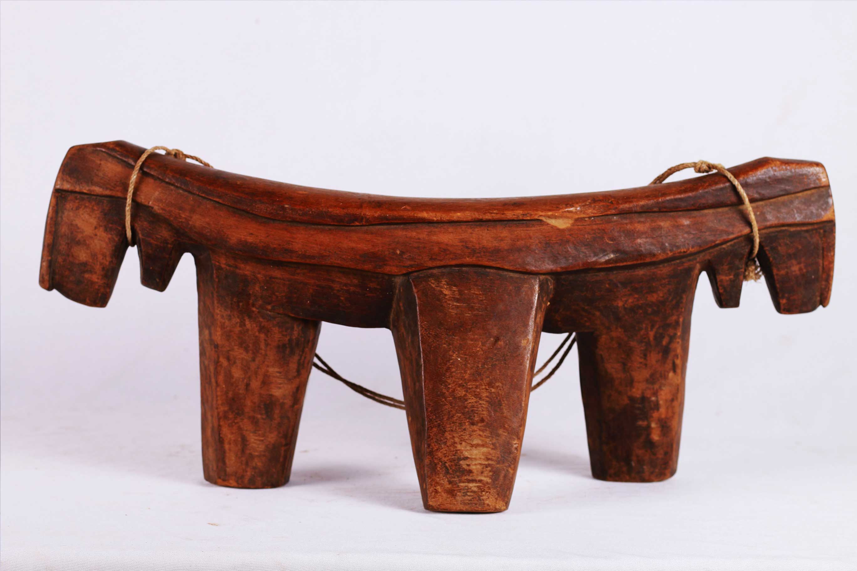 four-legged headrest. Zoomorphic features, such as a tail and a head, are sometimes brought out. These were used as pillows to help someone to have good sleep. They also used as a comfort to help protect ceremonial coiffure. In some occasions, headrests are used as a stool. As a personal object, the headrest has become part of the individual. Usually, when the person died, he is buried with his headrest. Sometimes the headrest is passed on to his heir, who would treat it with respect because this wooden piece embodies the spirit of the deceased person. Dinka headrests are primarily used by older men. The following headrest is crafted from hardwood and looks visibly old.