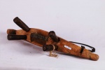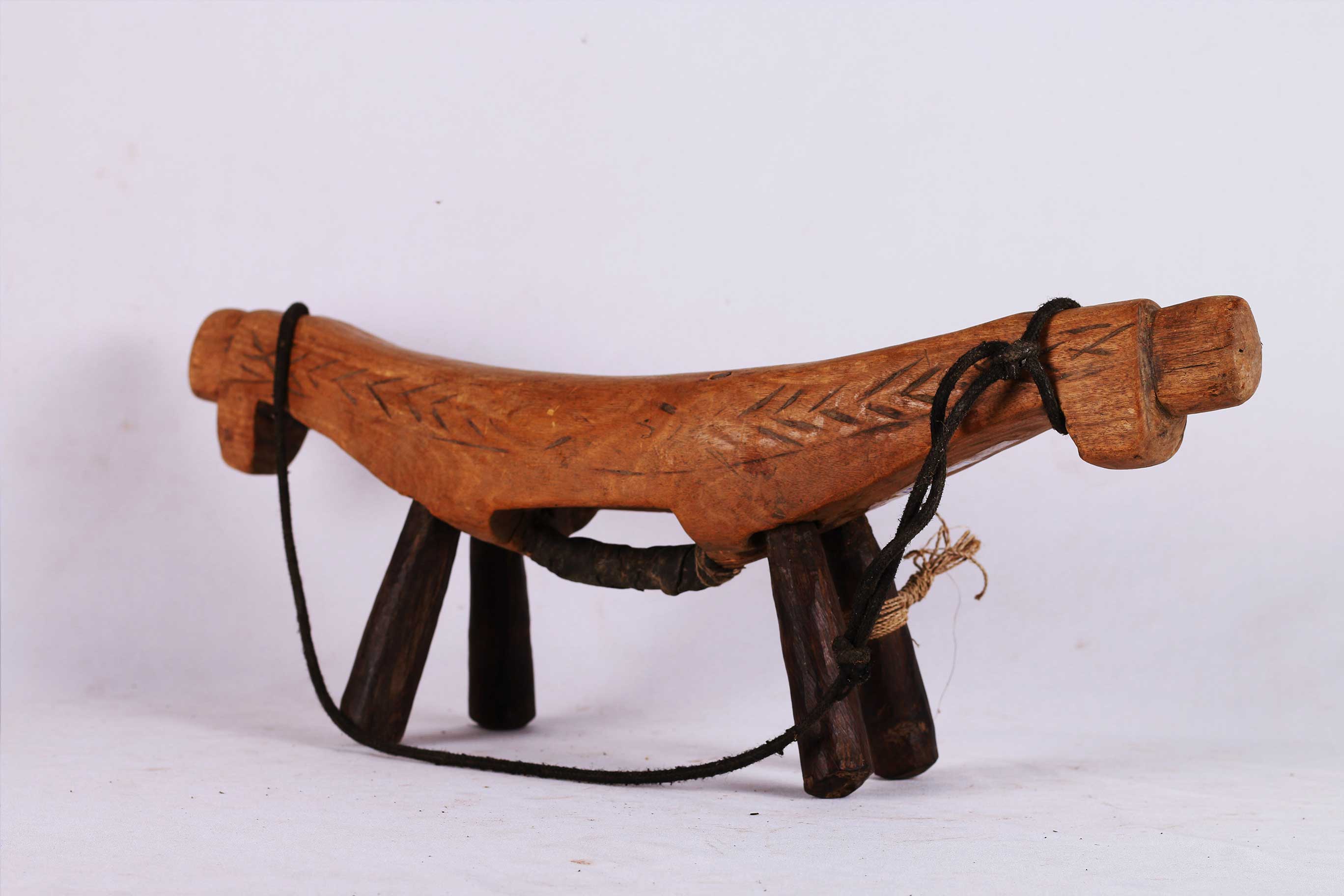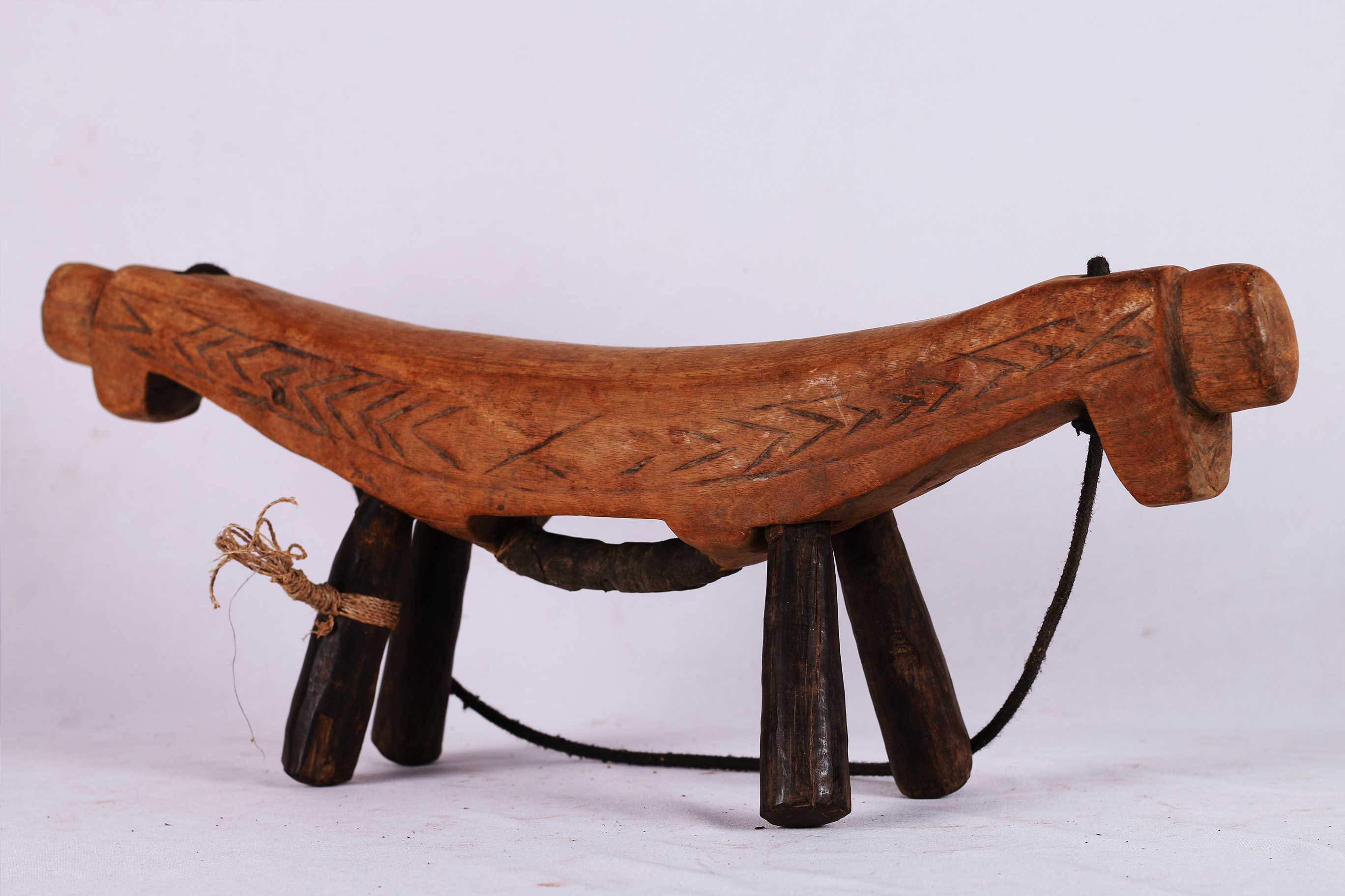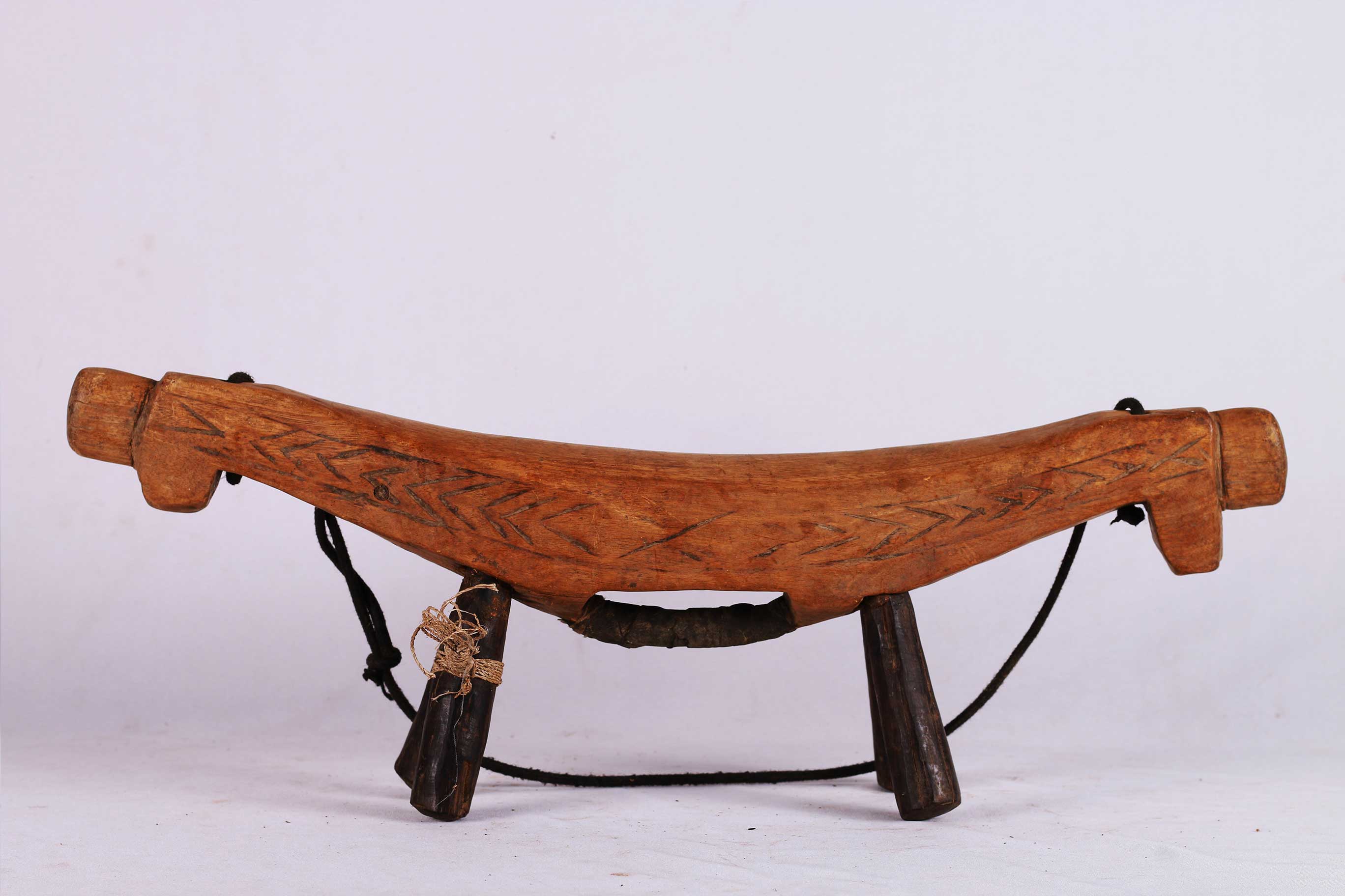 four-legged headrest. Zoomorphic features, such as a tail and a head, are sometimes brought out. These were used as pillows to help someone to have good sleep. They also used as a comfort to help protect ceremonial coiffure. In some occasions, headrests are used as a stool. As a personal object, the headrest has become part of the individual. Usually, when the person died, he is buried with his headrest. Sometimes the headrest is passed on to his heir, who would treat it with respect because this wooden piece embodies the spirit of the deceased person. Dinka headrests are primarily used by older men. The following headrest is crafted from hardwood and looks visibly old.