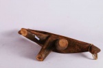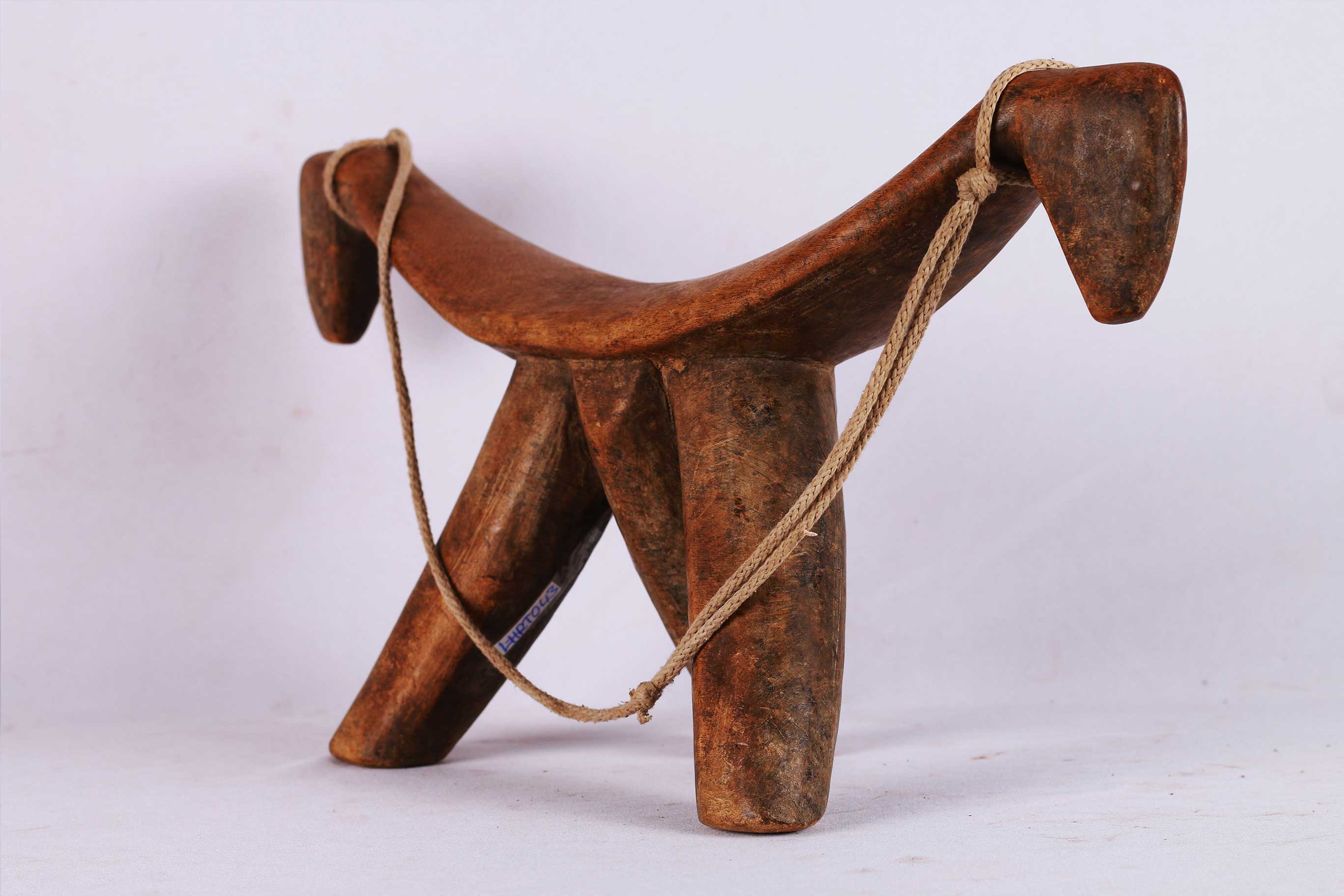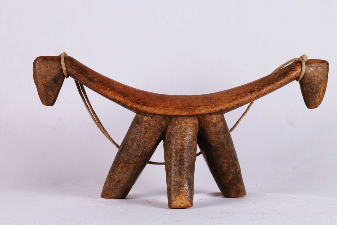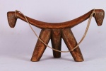four-legged headrest. Zoomorphic features, such as a tail and a head, are sometimes brought out. These were used as pillows to help someone to have good sleep. They also used as a comfort to help protect ceremonial coiffure. In some occasions, headrests are used as a stool. As a personal object, the headrest has become part of the individual. Usually, when the person died, he is buried with his headrest. Sometimes the headrest is passed on to his heir, who would treat it with respect because this wooden piece embodies the spirit of the deceased person. Dinka headrests are primarily used by older men. The following headrest is crafted from hardwood and looks visibly old.