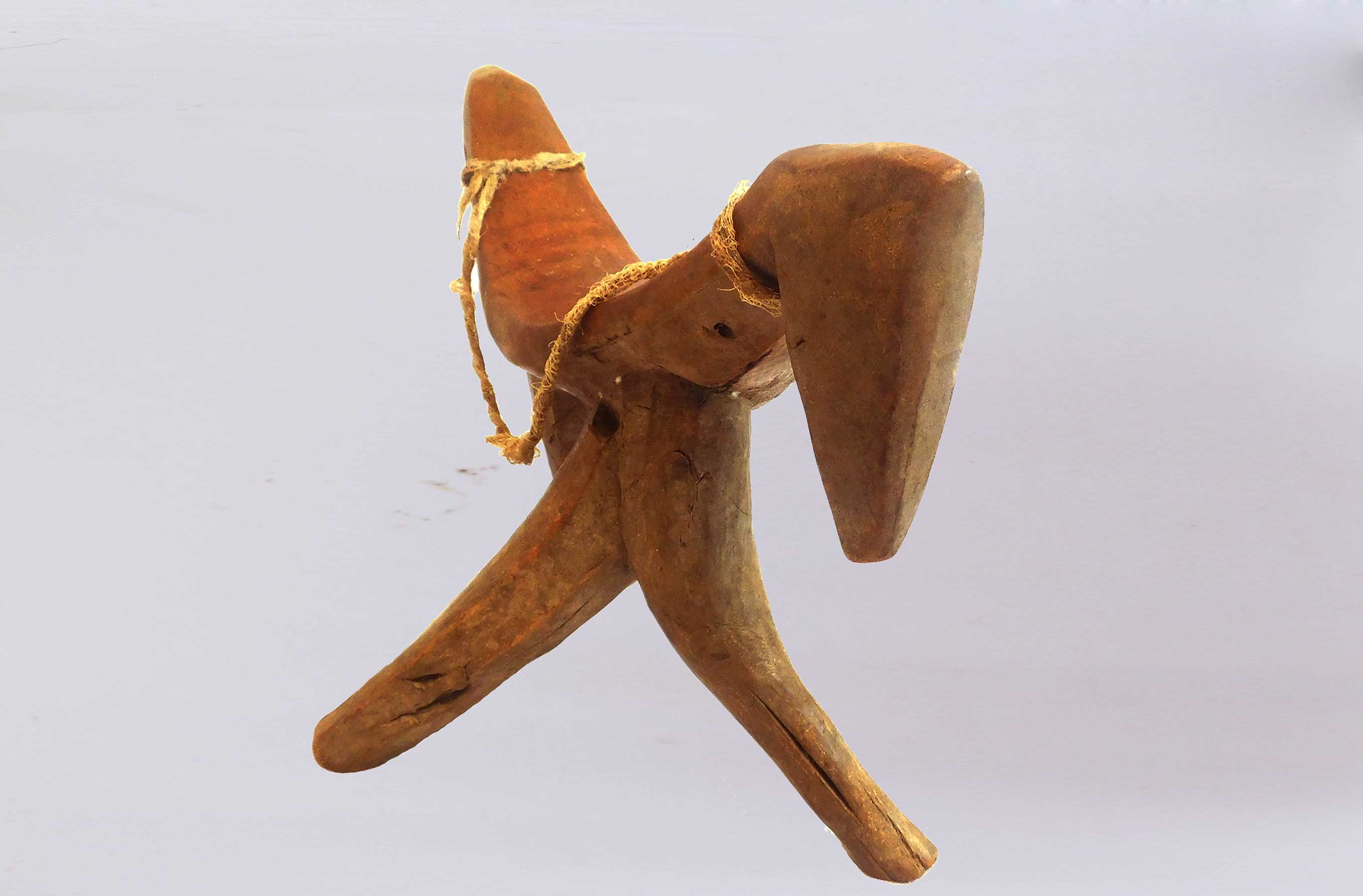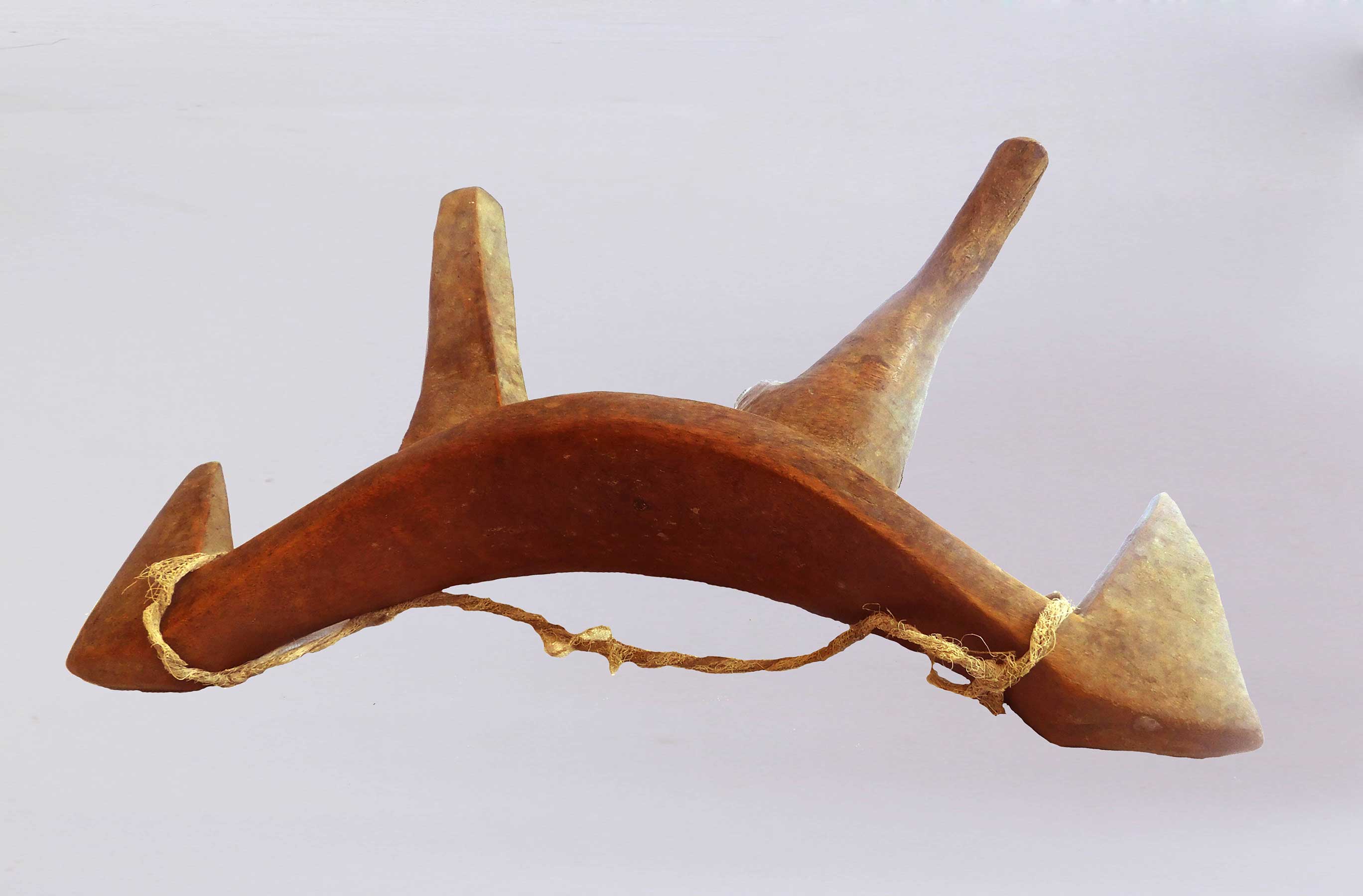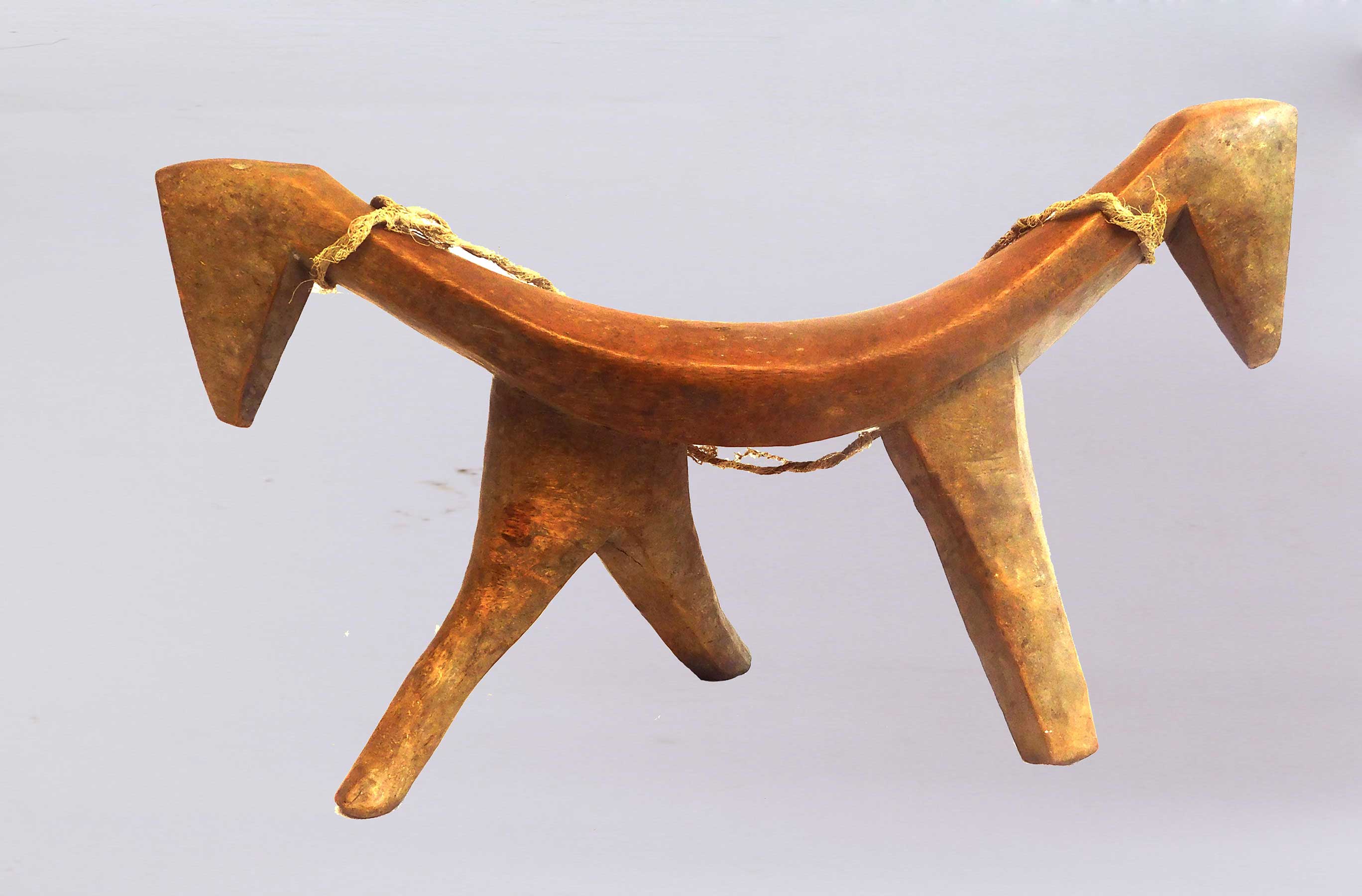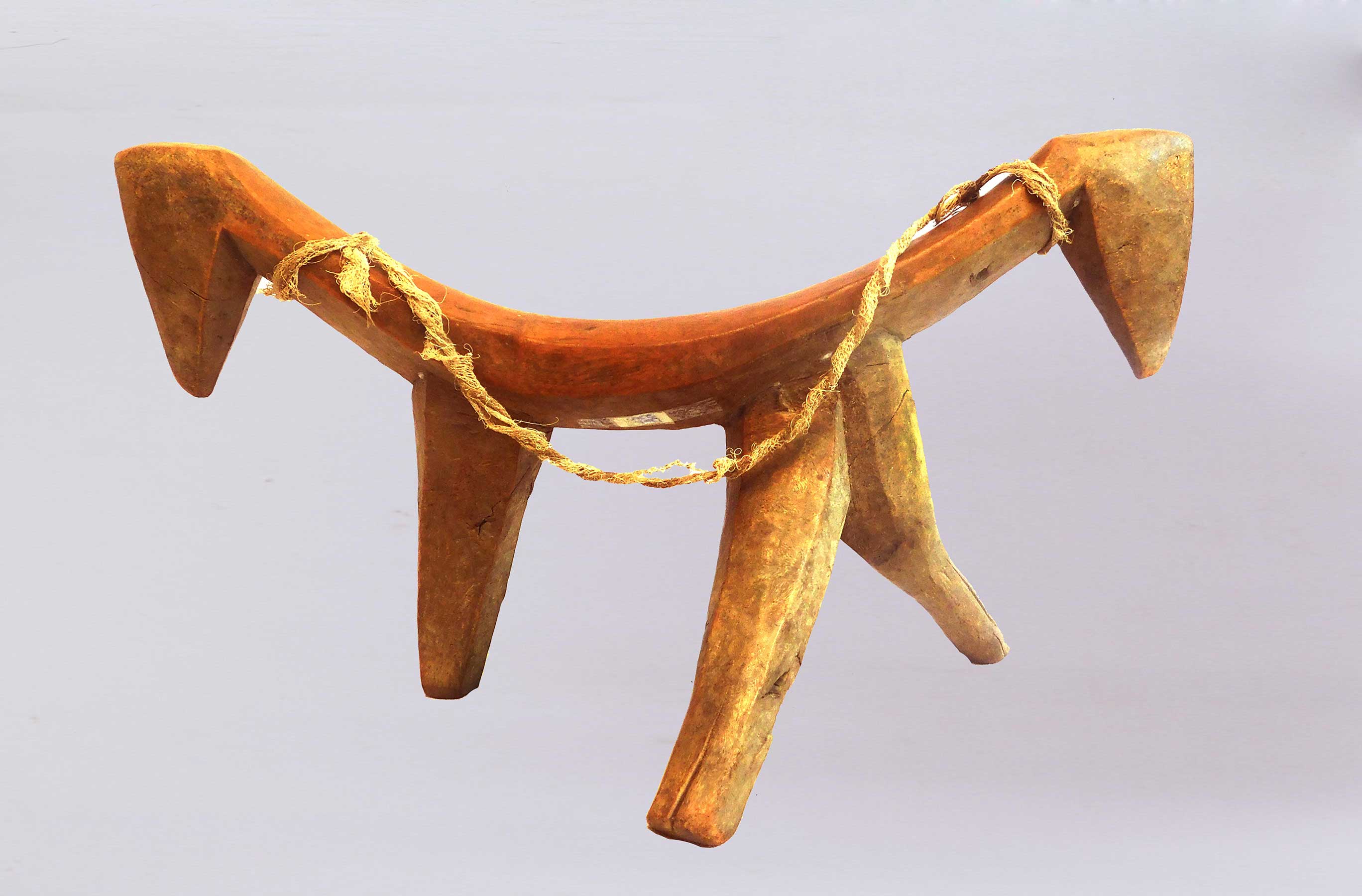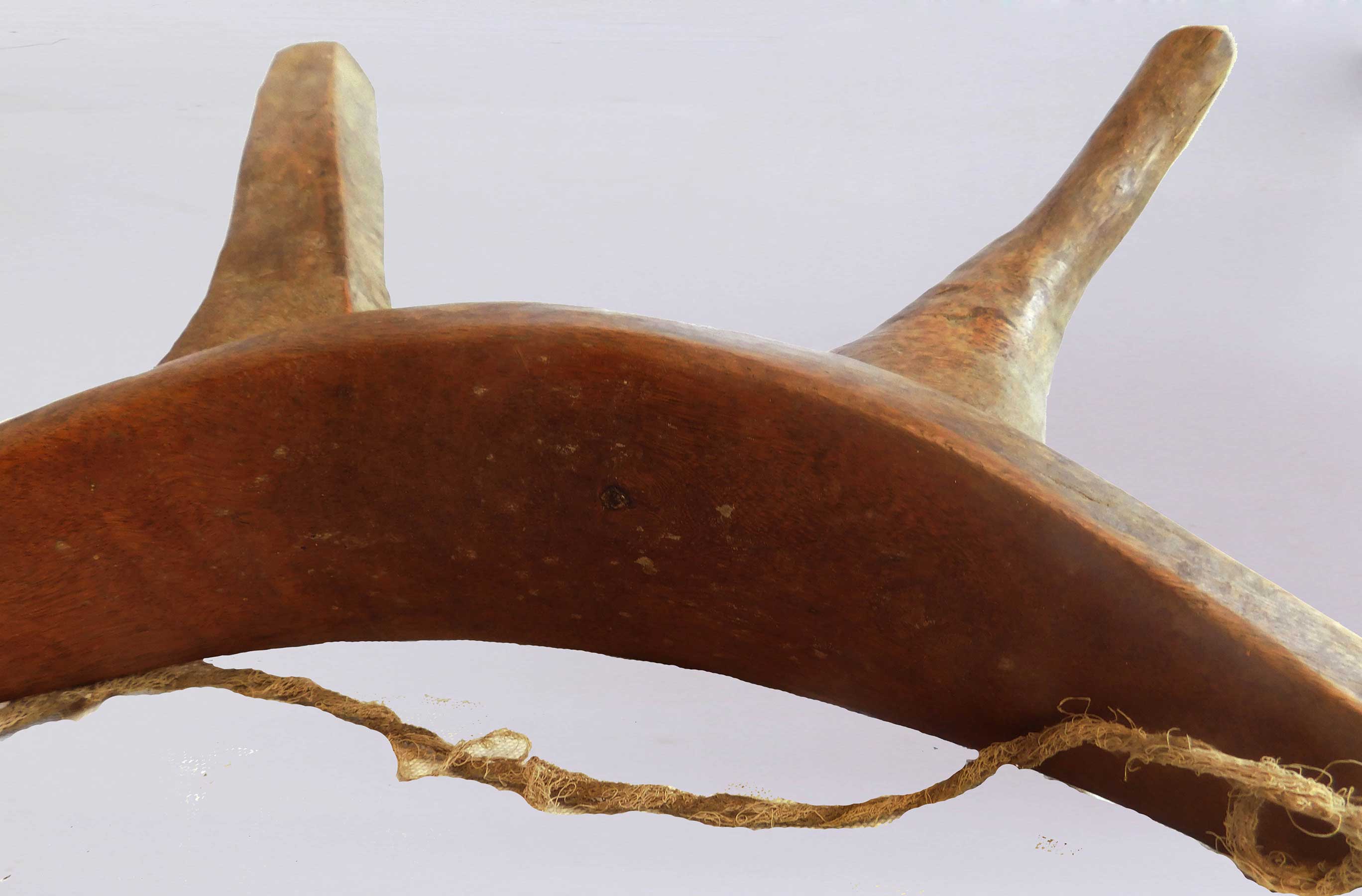 Such headrests were inspired by the aesthetics of cattle. The shape of this headrest is suggestive of the elegant horns of a cow with legs taking the form of tubular columns. The owner of this headrest was a powerful man. It was also used as a seat, with the convex platform resting on three vertical columns. This piece has a wonderful patina and shows signs of usage and old age. The strip of fiber cloth looks to be attached recently.