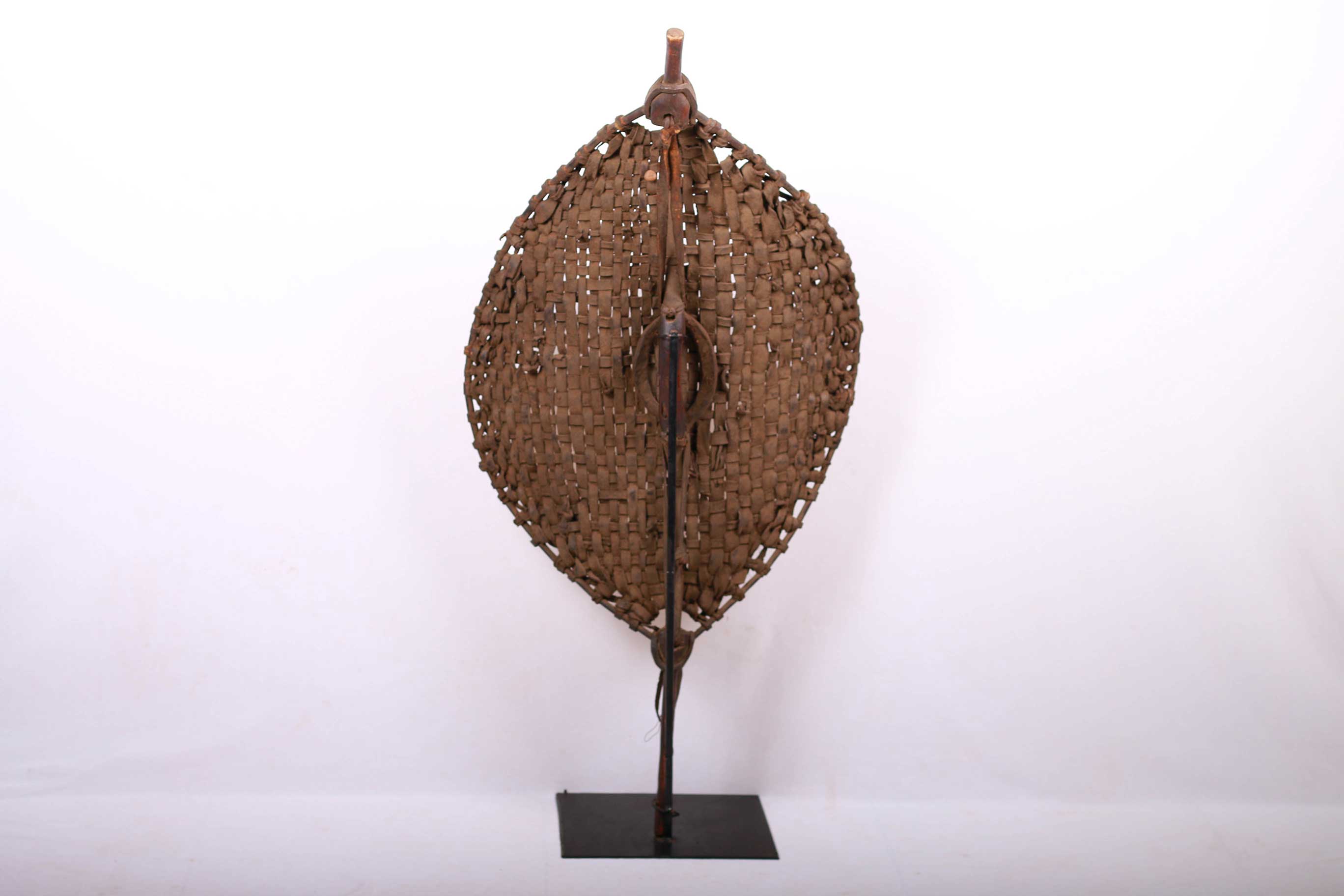 Wicker shields display the high artistic quality of their workmanship and their elegance. Shields among African cultures were used in different ways. Used during initiation of young boys, ritual ceremonies and of course in wars. Since they were always in armed conflicts with each other. This is an old shield with visible traces of usage around the handle.