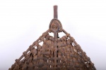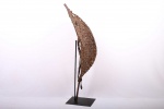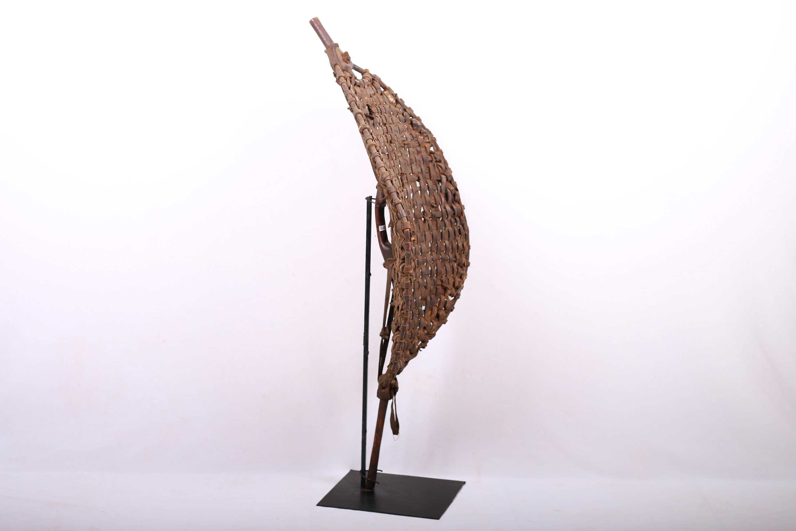 This wicker-curved shield is made of lightweight wood stitched together with twine from a climbing plant. It has both vertical and horizontal lines running across the shield.