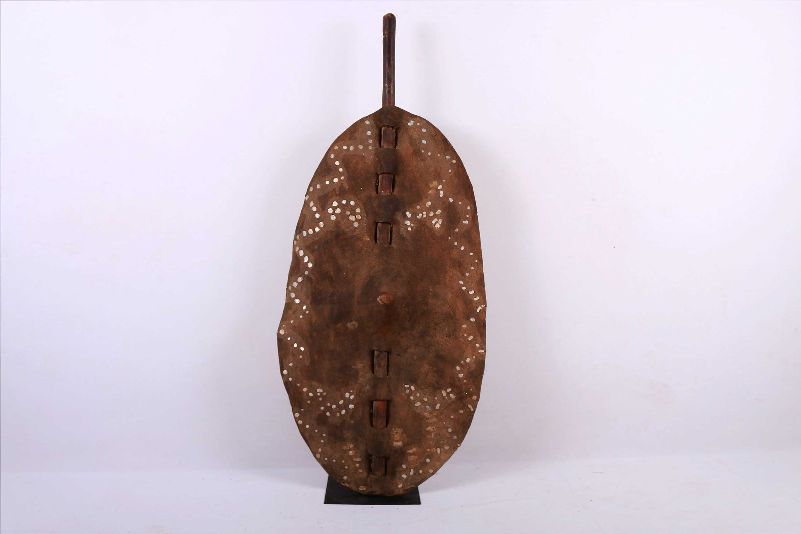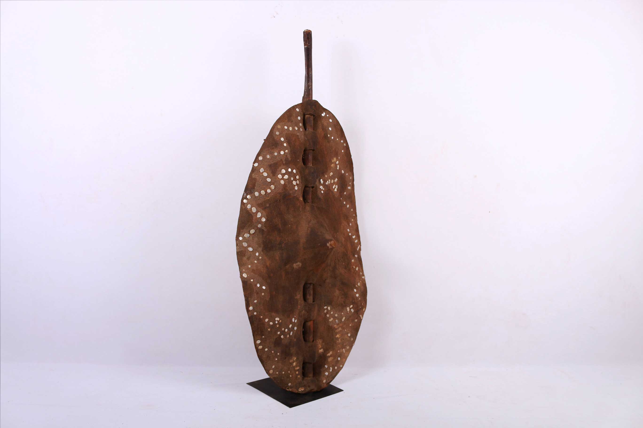 This shield supposedly belongs to the Nuer, a sub-group of the Dinka tribe in southern Sudan, they use shield made from different materials like animal hides, wood and metal. Shields among African cultures were used in different ways; during initiation of young boys, ritual ceremonies and of course in wars, since they were always in armed conflicts with each other. The following metallic shield shows visible signs of age and usage.