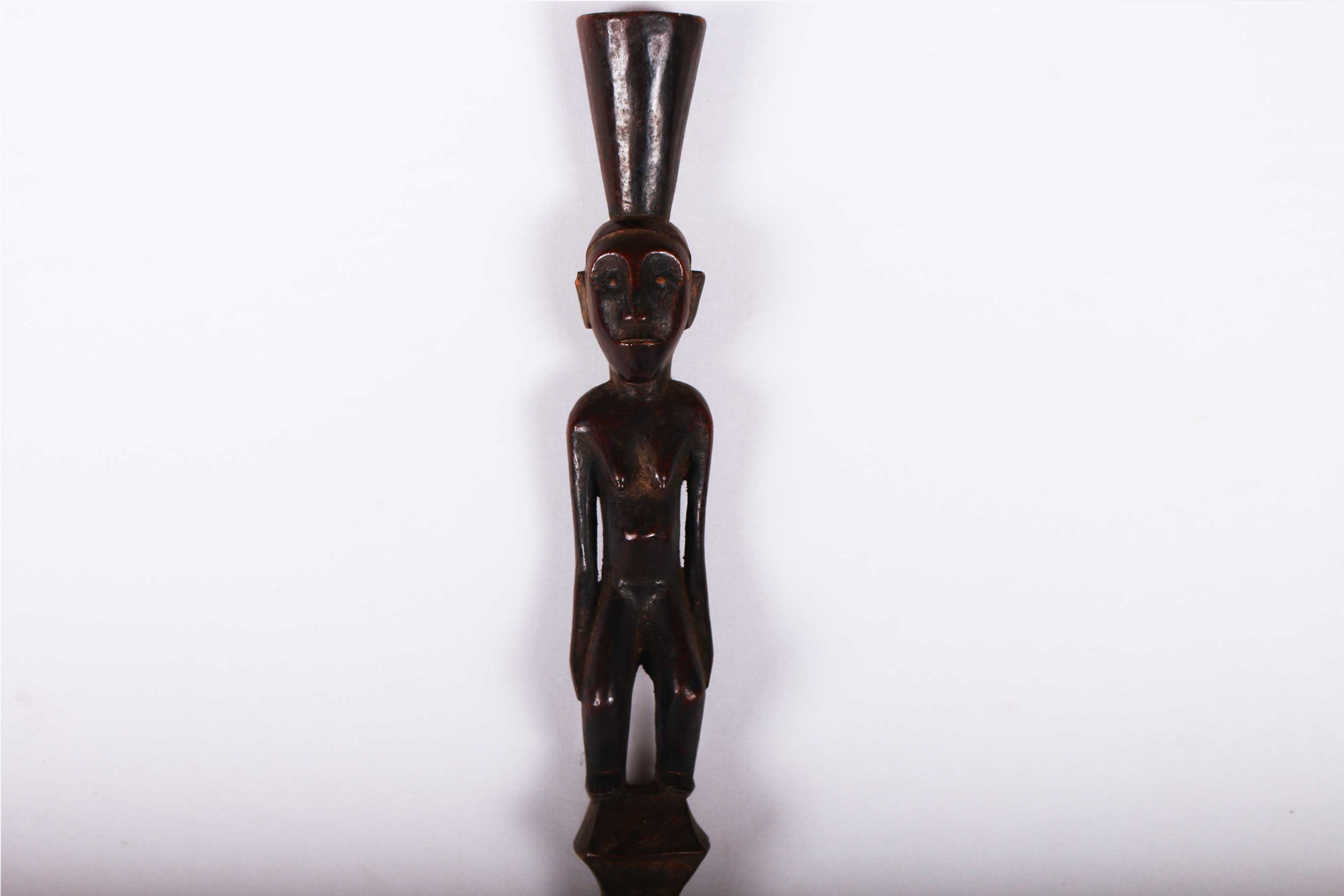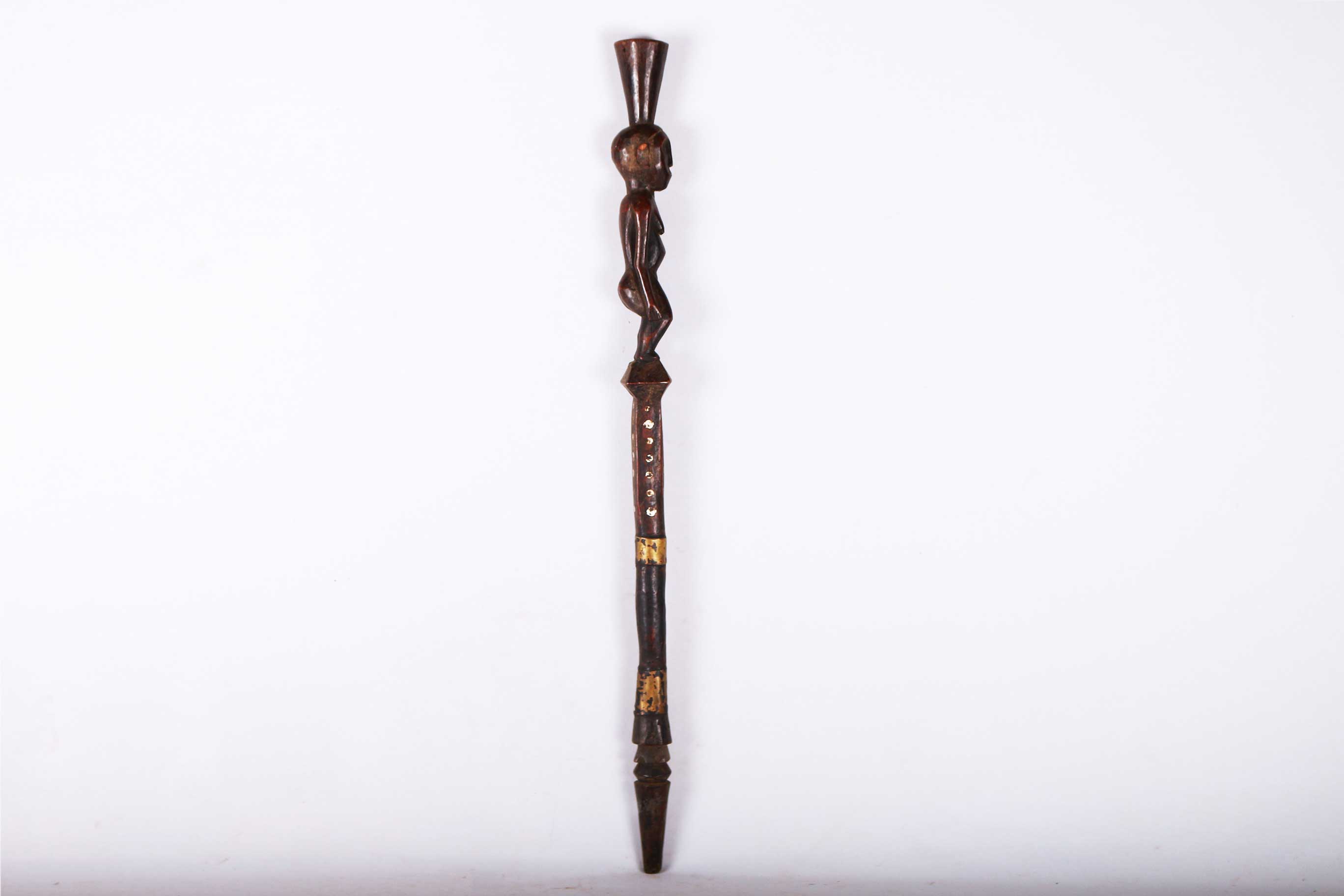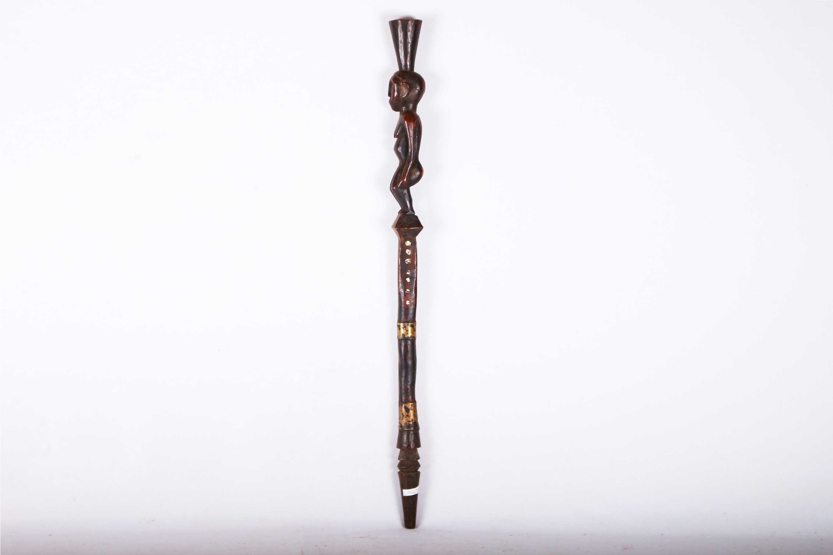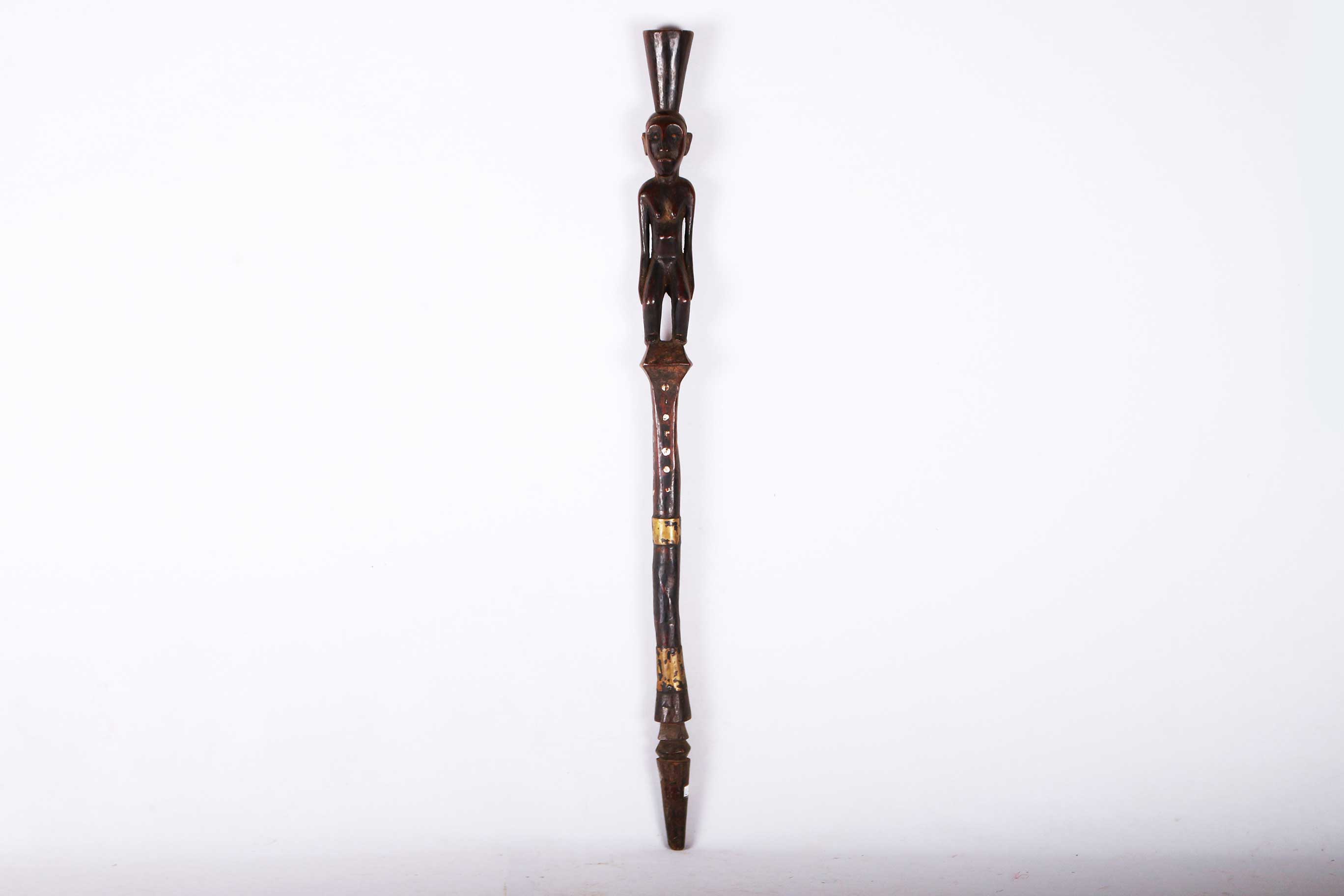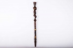 The Dinka people are a Nilotic ethnic group living in South Sudan. They mostly live along river Nile, from Mangala to Renk, in regions of Bahr el Ghazal, Upper Nile and Abyei Area of the Ngok Dinka in South Sudan. The Dinka are famous for making staffs, walking sticks and headrests. Often the staffs represented the hierarchy among the chiefs of the tribe, who might carry a staff to show their rank as distinguished elders. This is a well-sculpted Dinka staff with a decoration of a female sculpture, has a shiny black patina and shows signs of age and good usage.