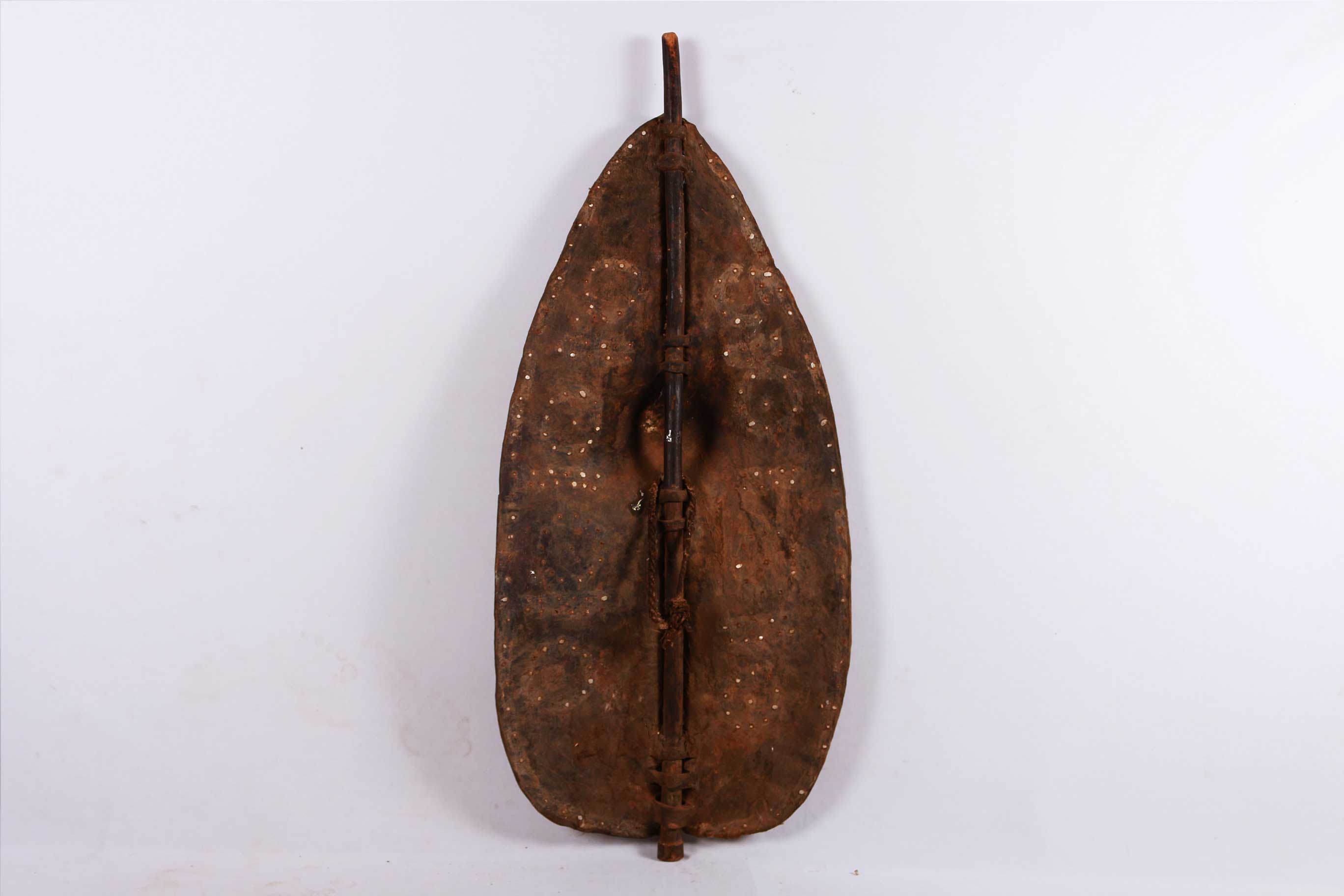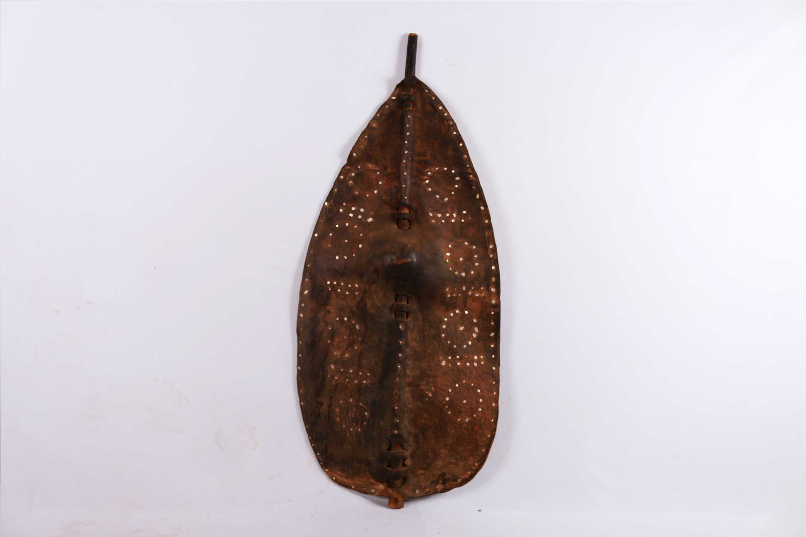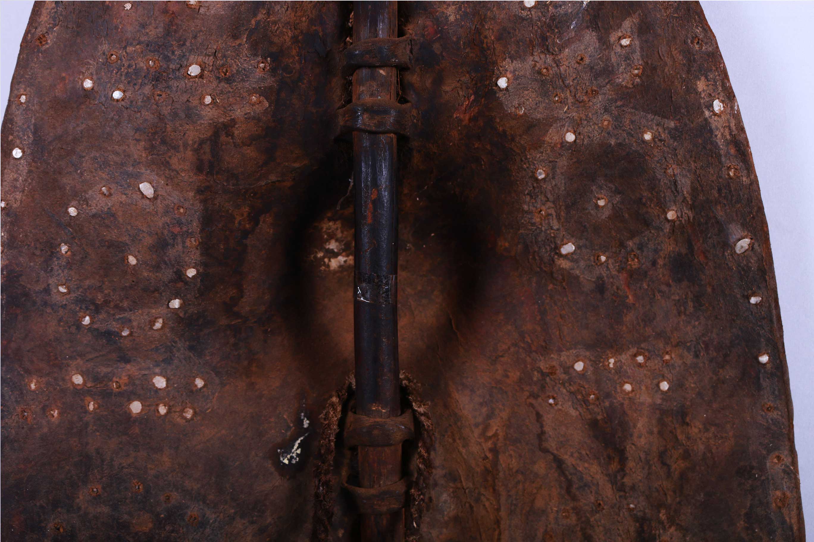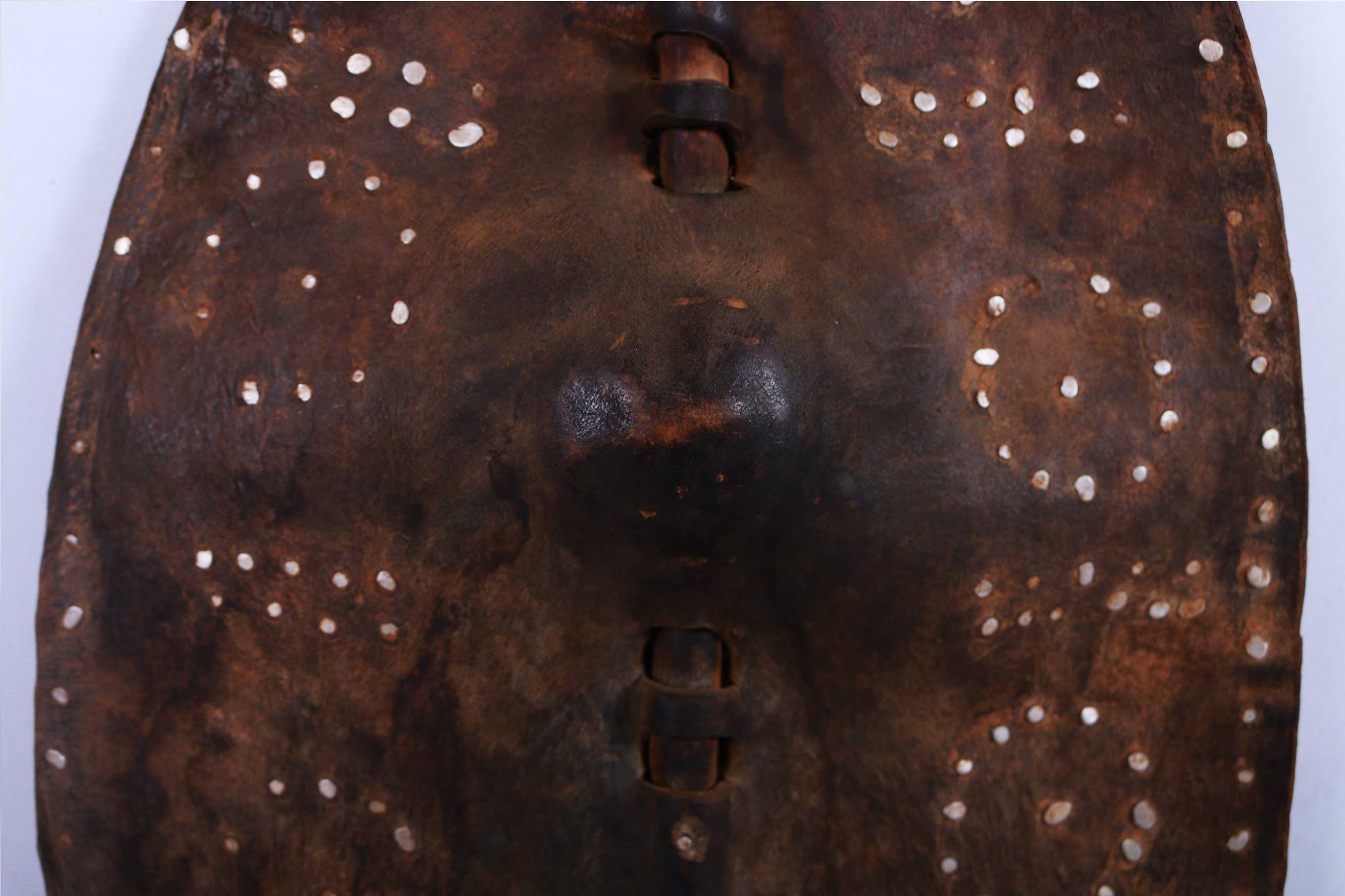 The Dinka live in the region of the upper white Nile and are together with the Shilluk and Nuer, the most important tribes in Southern Sudan. The Dinka shields are often made out of antelope, buffalo and hippopotamus hide and have a partially carved pole for carrying it, and tied with leather straps in a depression formed during the drying process of the still fresh skin. Shields among African cultures were used in different ways; during initiation of young boys, ritual ceremonies and of course in wars, since they were always in armed conflicts with each other.