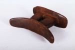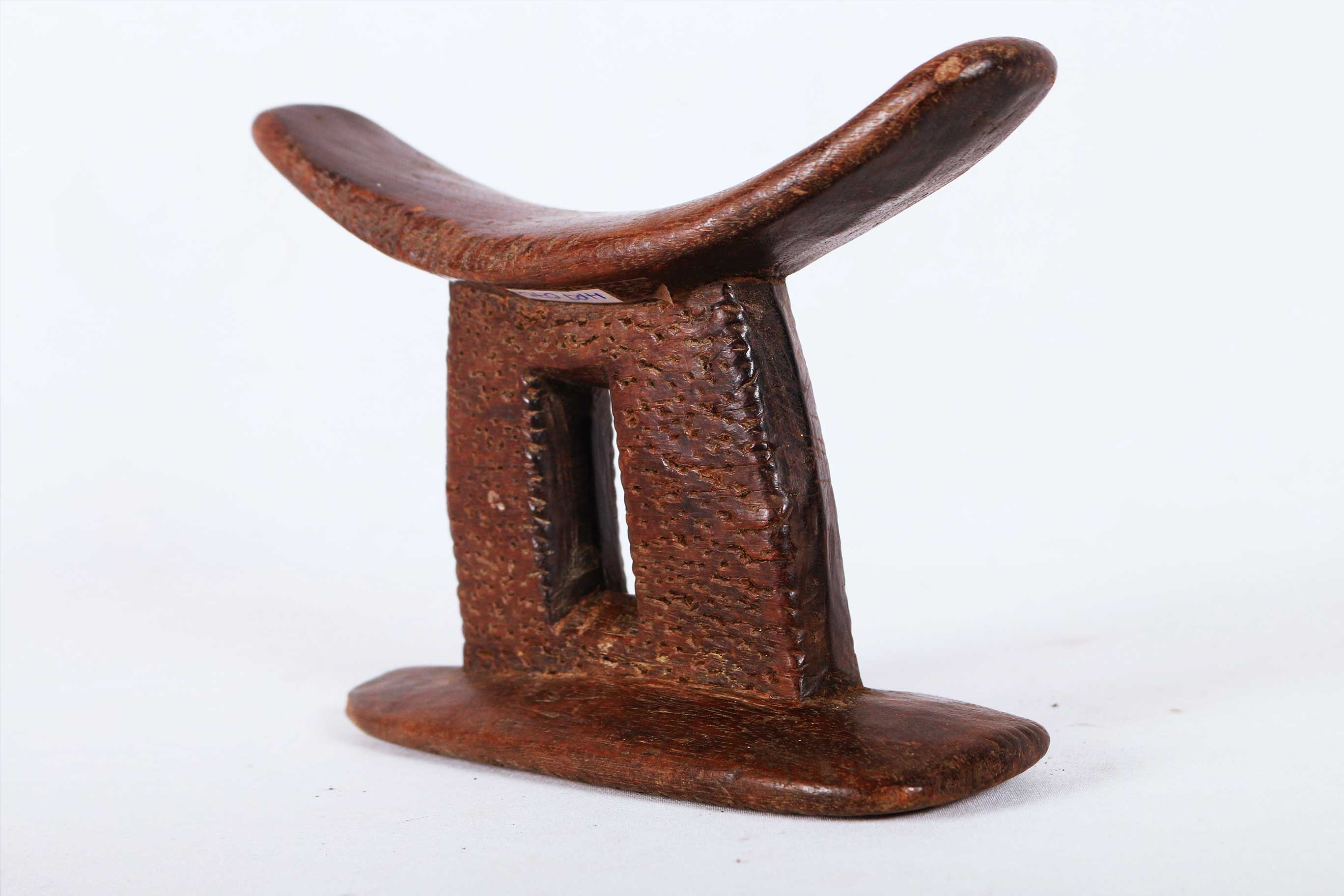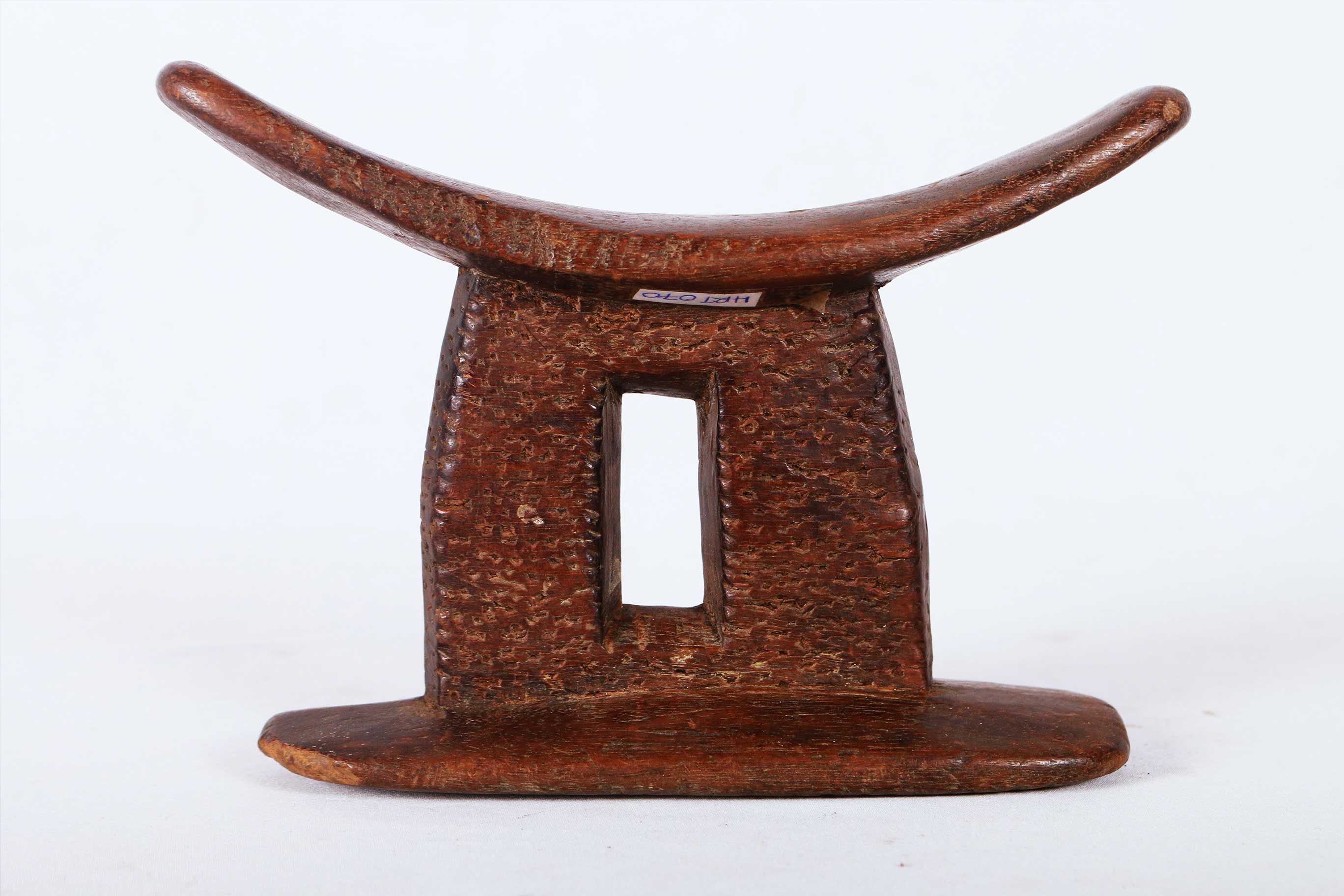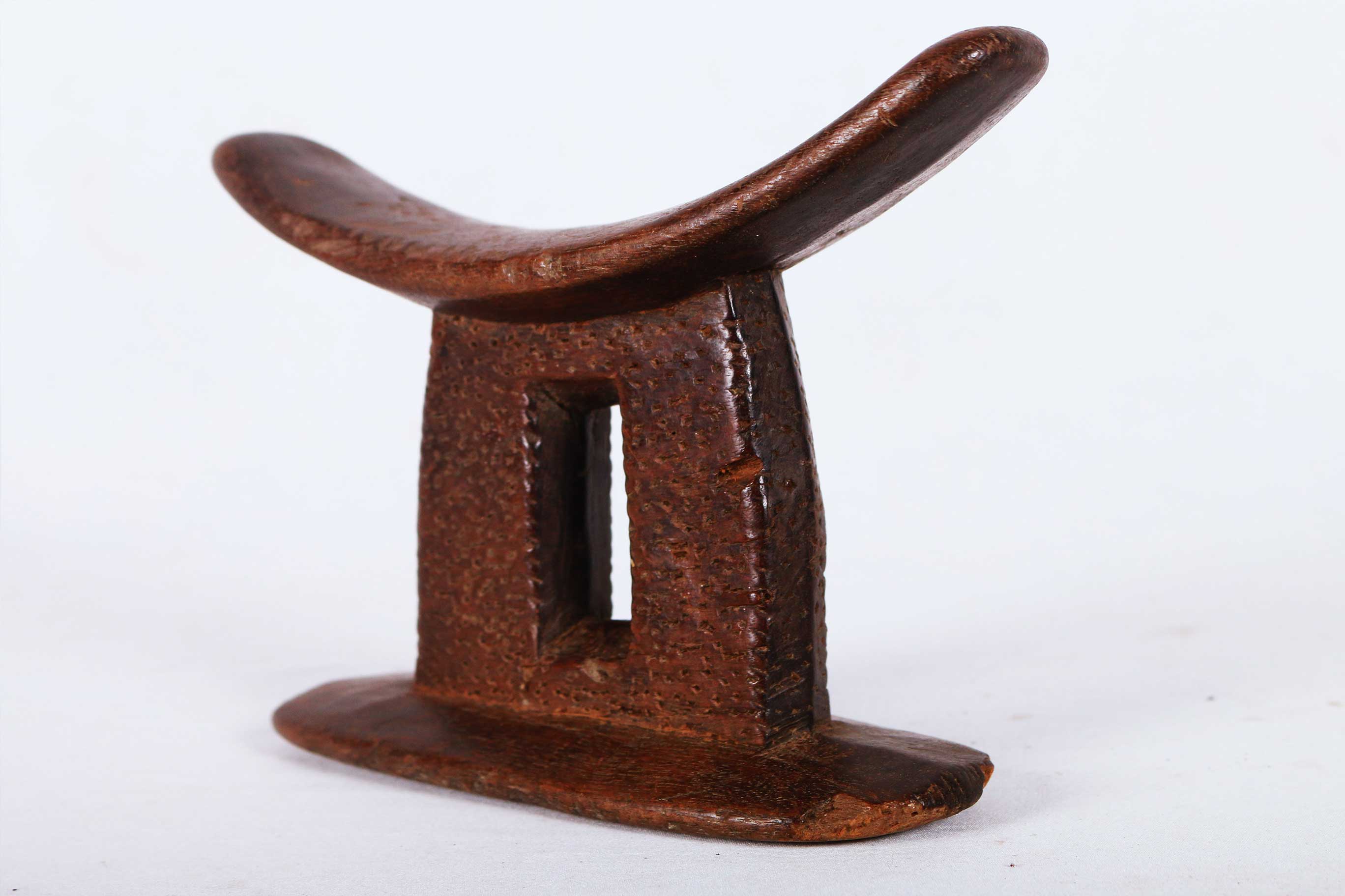 This is a fine block headrest from Ethiopia. Ethiopian headrests epitomize the devotion, culture, spirituality and physical needs of those that produced them. They are grouped into different visual and structural styles, the columned piece with a curved platform and circular base are the most popular, the other is the pillow in the form of a block. The variations in these headrests are plentiful as their uses. The significant representations of these headrests are yet to be researched. Although they are mostly believed to revolve around identity, status and age/gender differentiation.