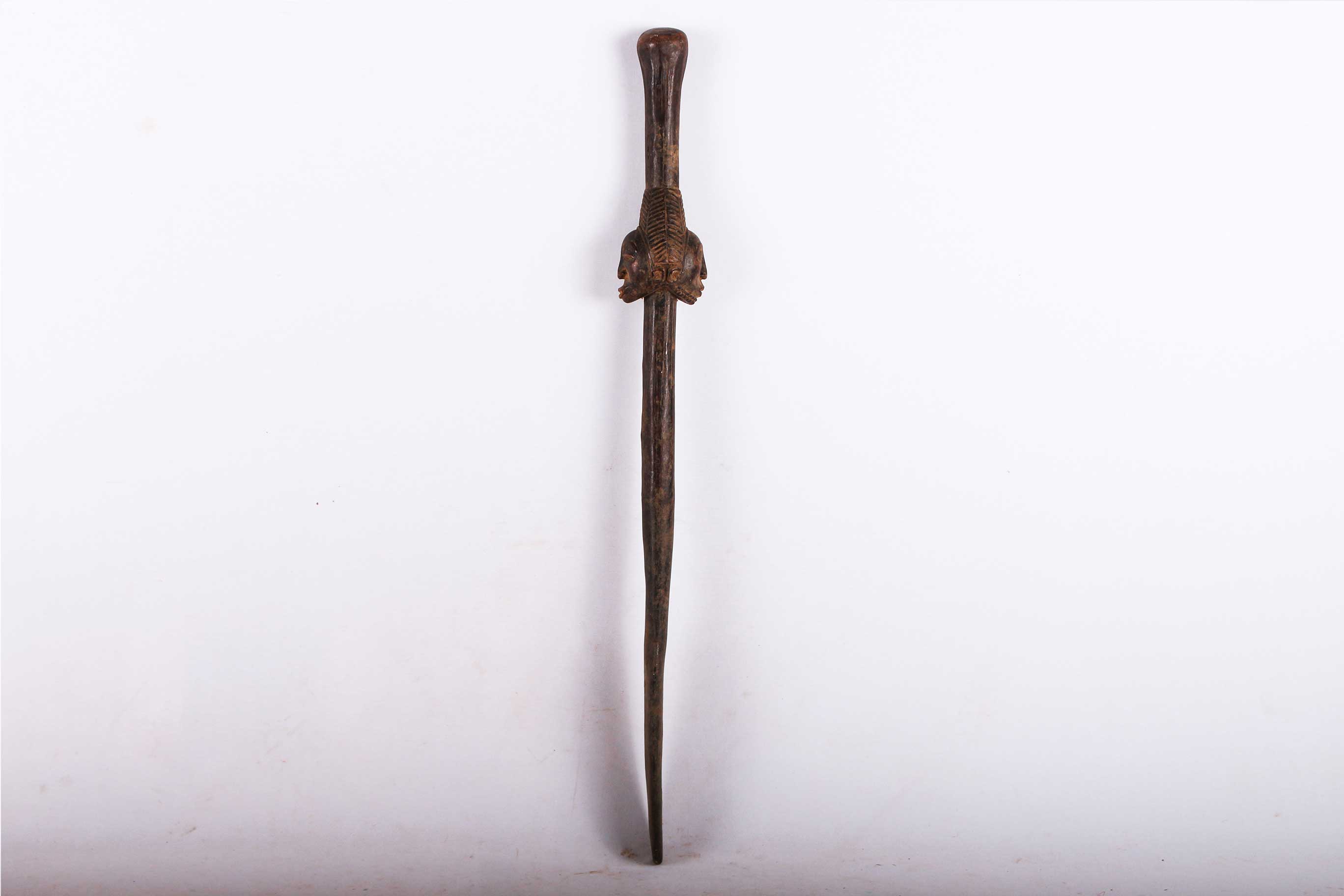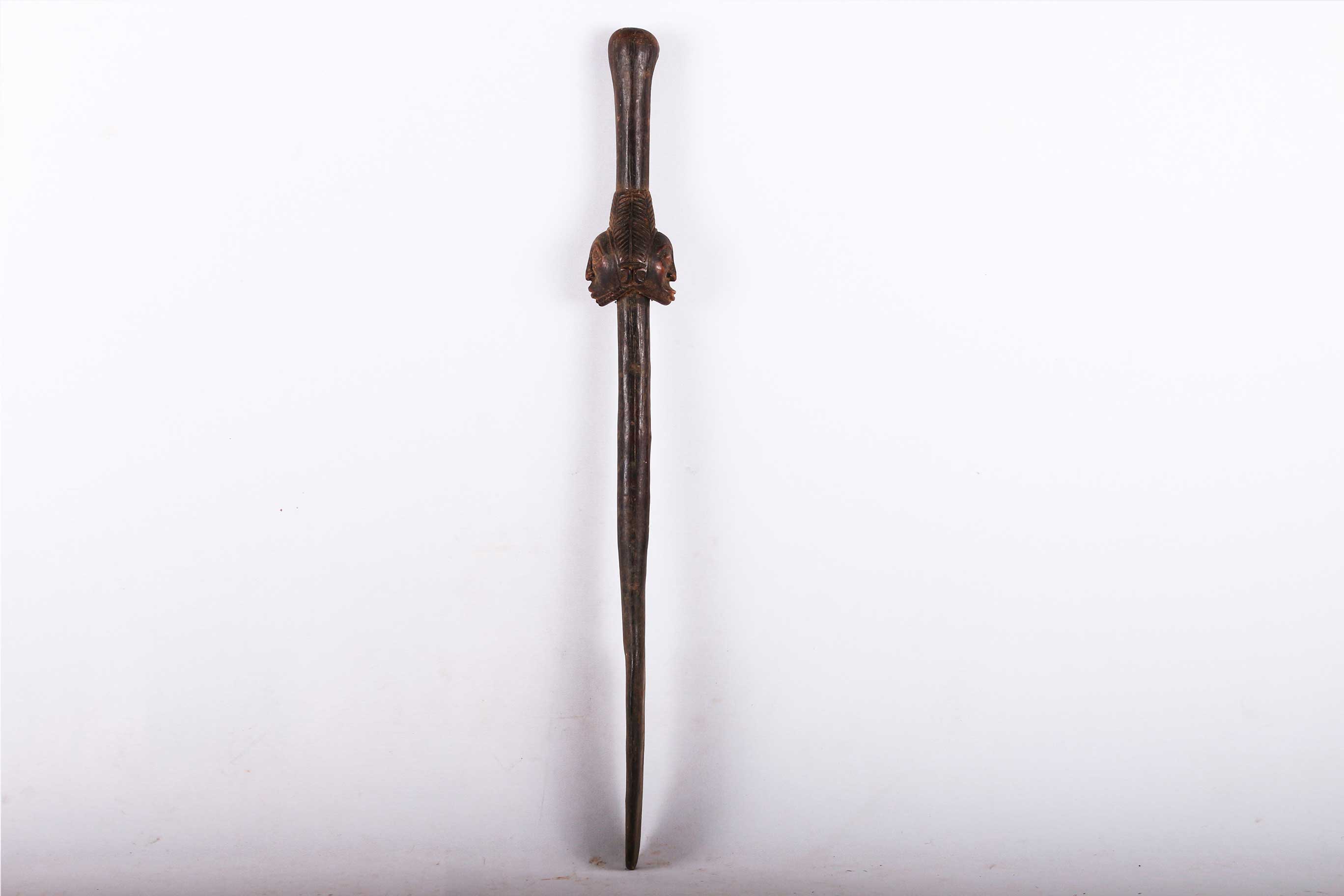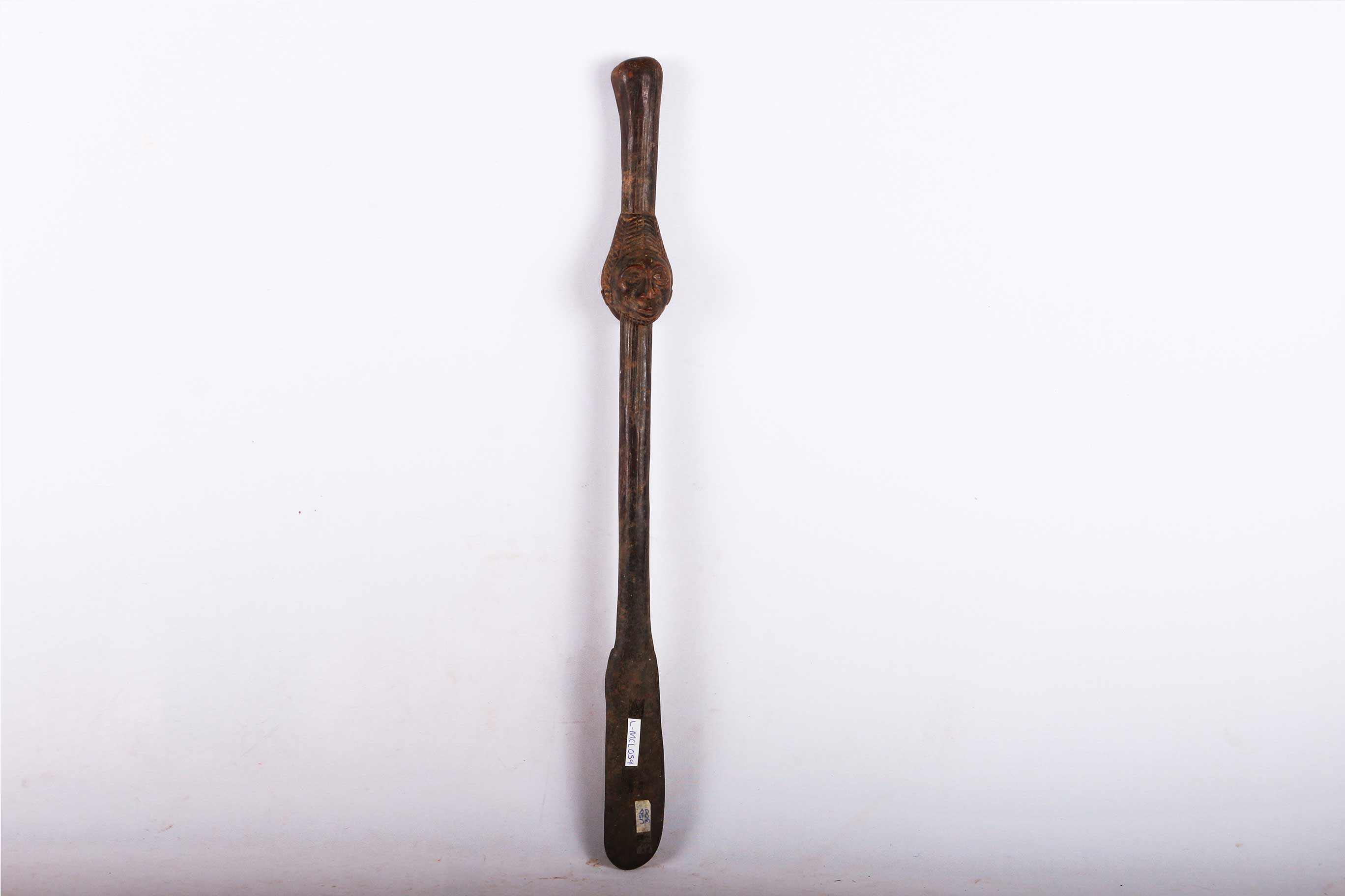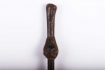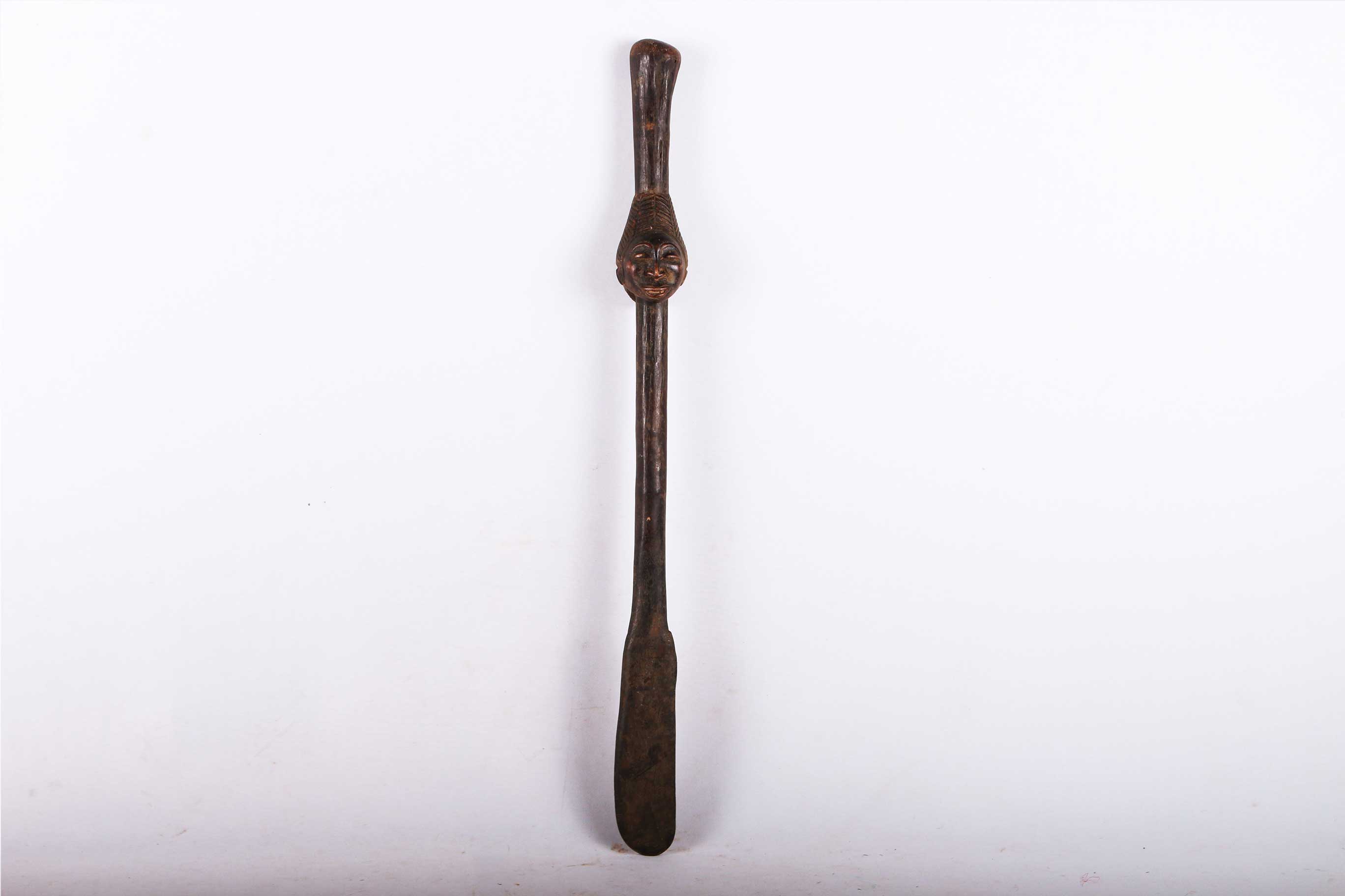 The Hemba are located along the Congo River. in the Democratic Republic of Congo. The Hemba art foams are closely linked to Luba art. This beautifully carved spoon has a wonderful patina and the head of a Hemba woman. The face appears to be that of a female ancestor. It is a tradition that one elder woman of the tribe holds such a spoon which denotes her as an excellent hostess, cook, role model and one who excels at all of her duties as a woman. In her later years, she picks her successor and passes the spoon on to the young woman who is most deserving. This is truly an amazing piece, showing the importance of this position through the beauty of the spoon.