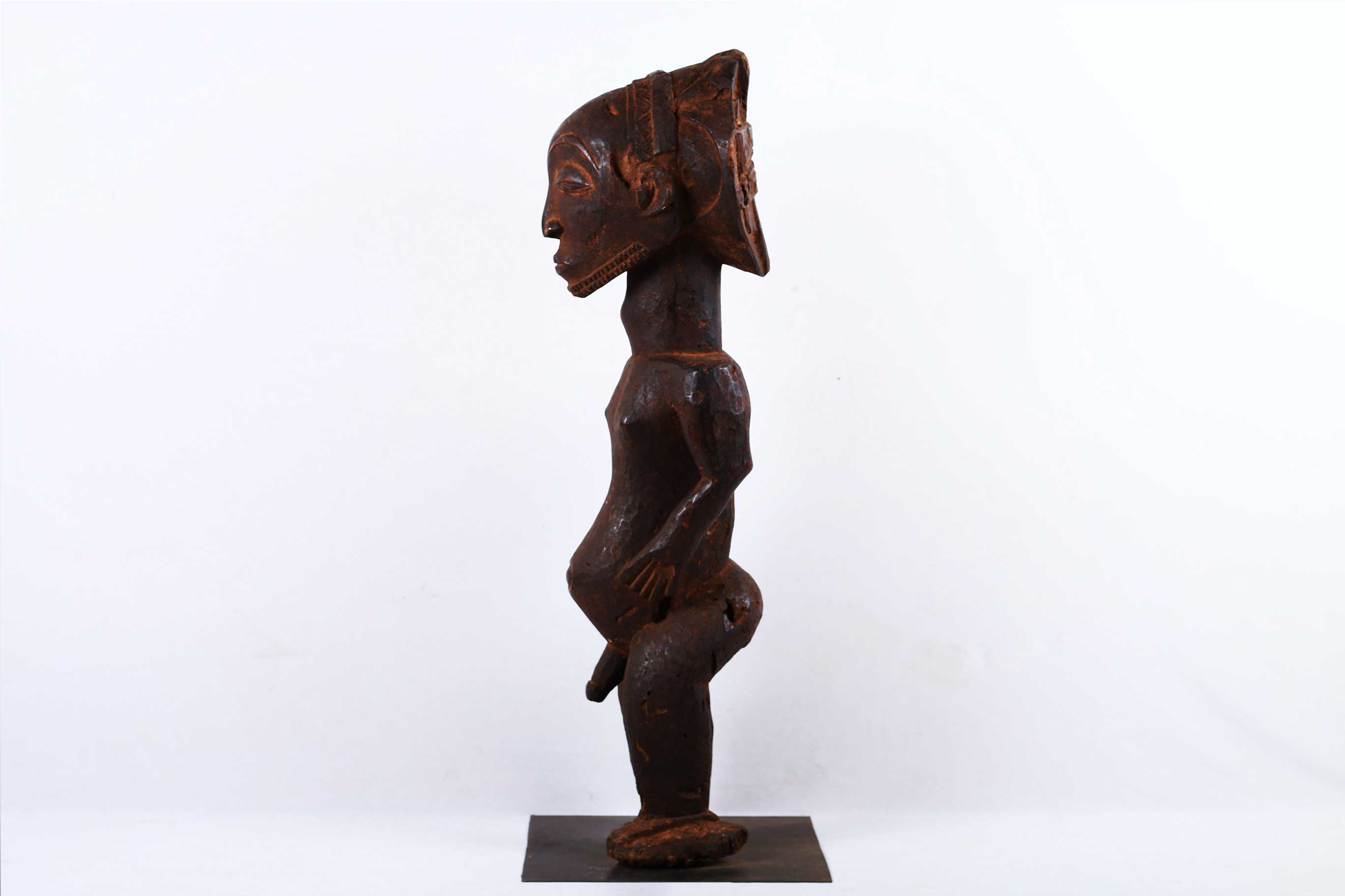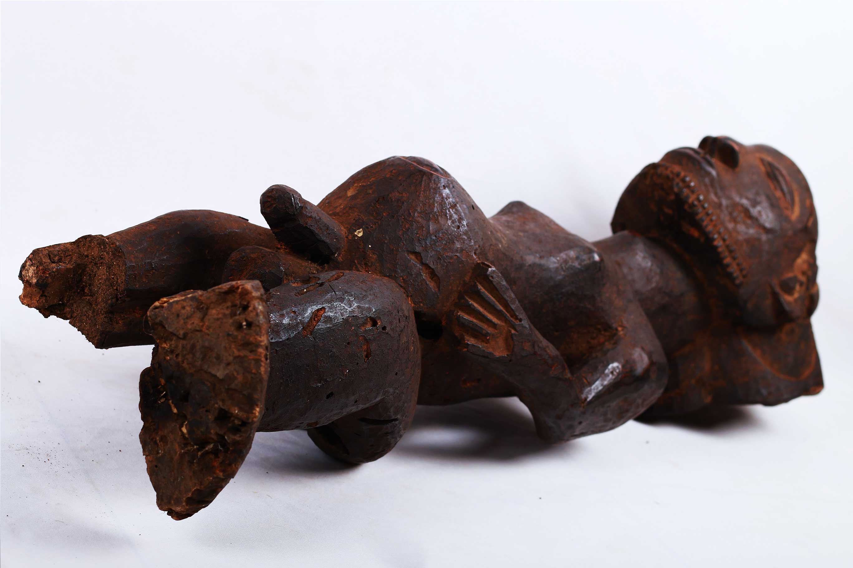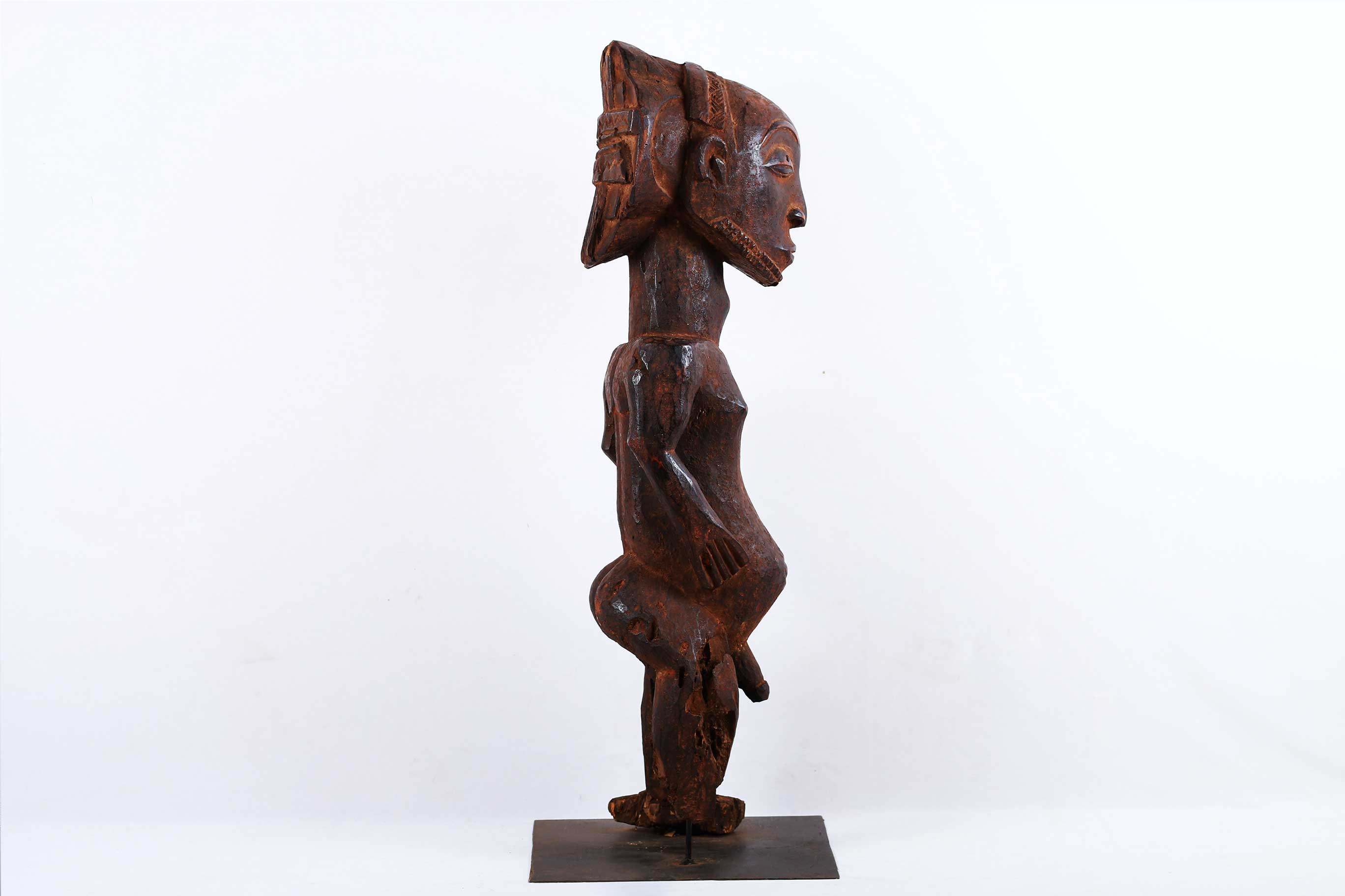 The Hemba are located along the Congo River. The Hemba art foams are closely linked to Luba art. Hemba sculptures are representations of ancestors. Female sculptures are rare and are associated with fertility as well as used for divination purposes. The following sculpture has a black patina and has lost part of its foot but looks visibly old.