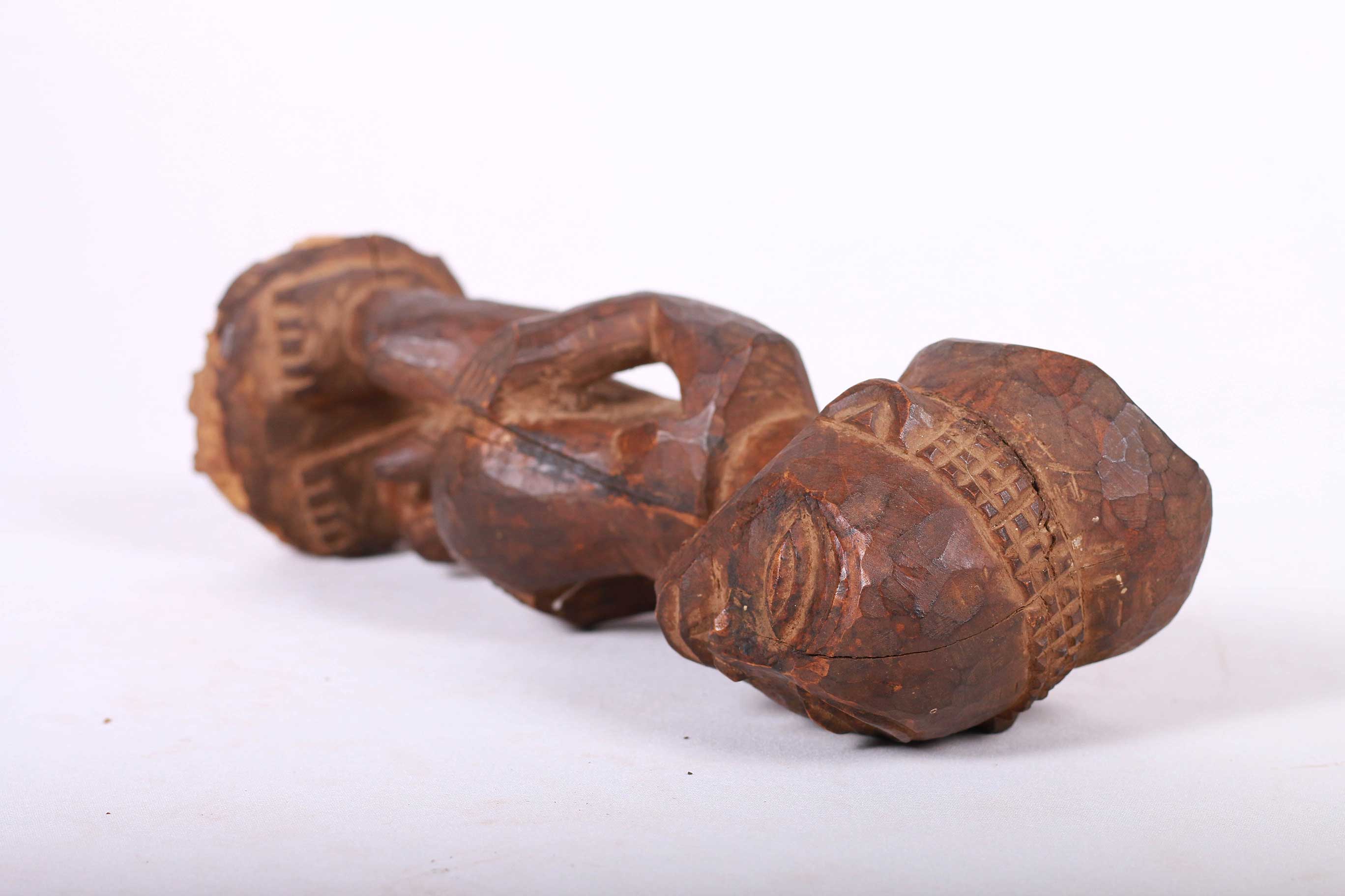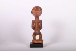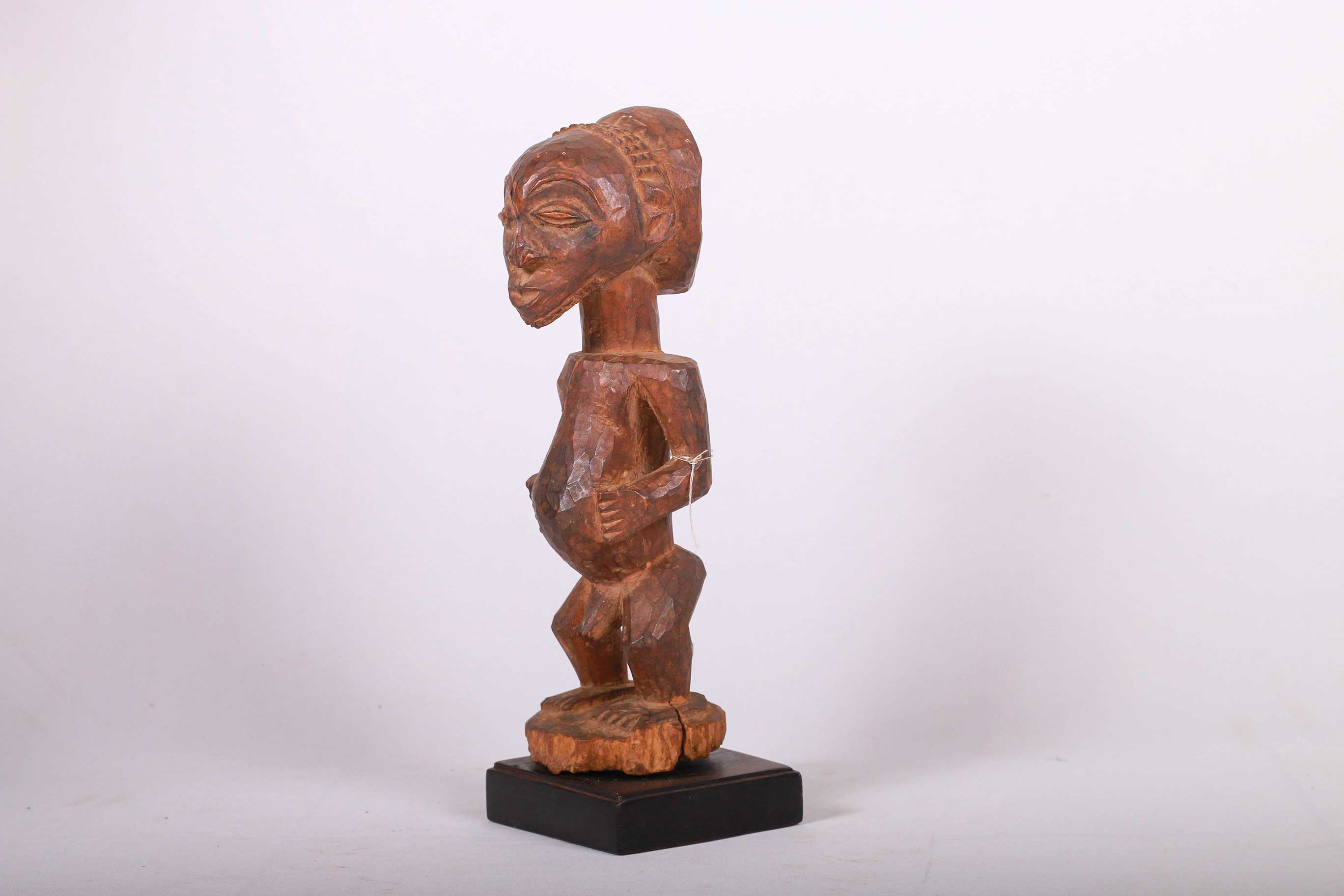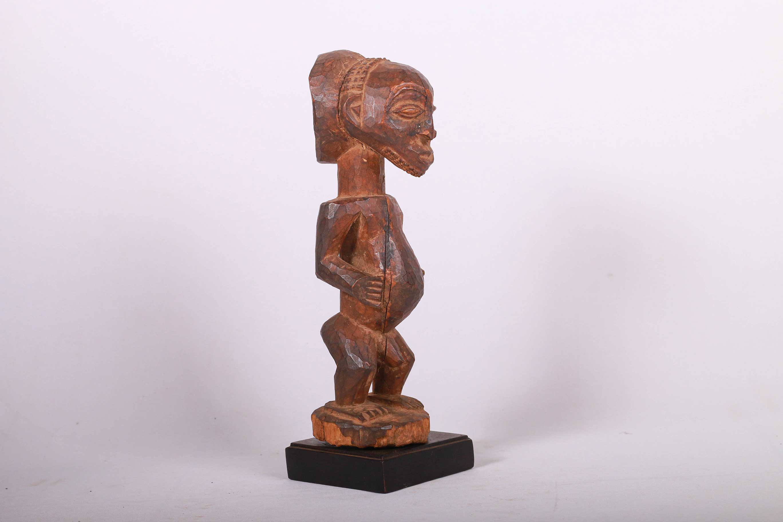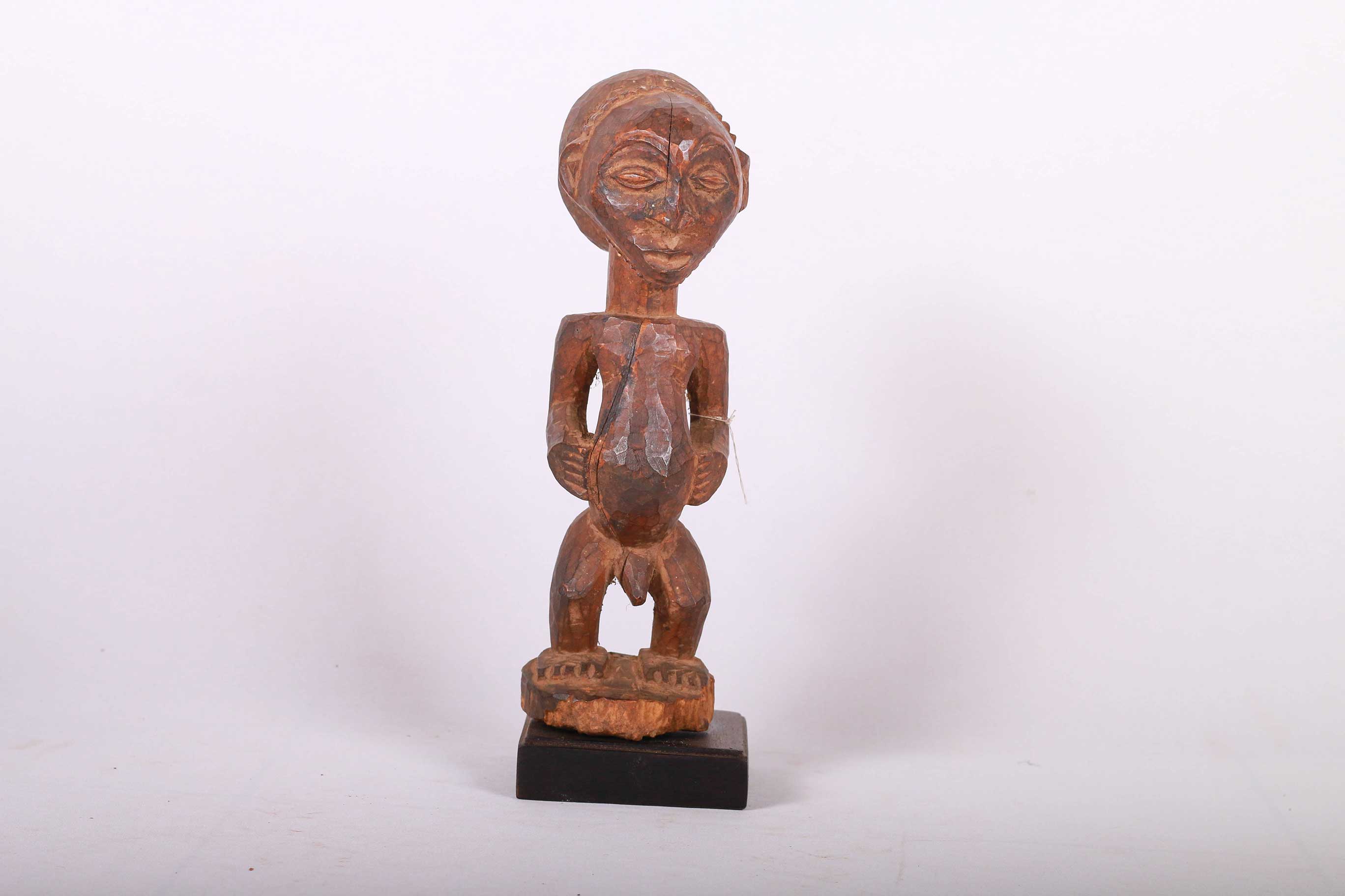 The Hemba are located along the Congo River in the Democratic Republic of Congo. The Hemba art forms are closely linked to Luba art. Hemba sculptures were often used as portraits of specific ancestors, they were beautified according to the moral qualities of the ancestors. This sculpture is a beautiful traditionally carved piece with hands placed on either side of the belly, it indicates that the ancestor is watching over the clan. It has a brown patina and has visible signs of age.