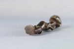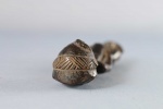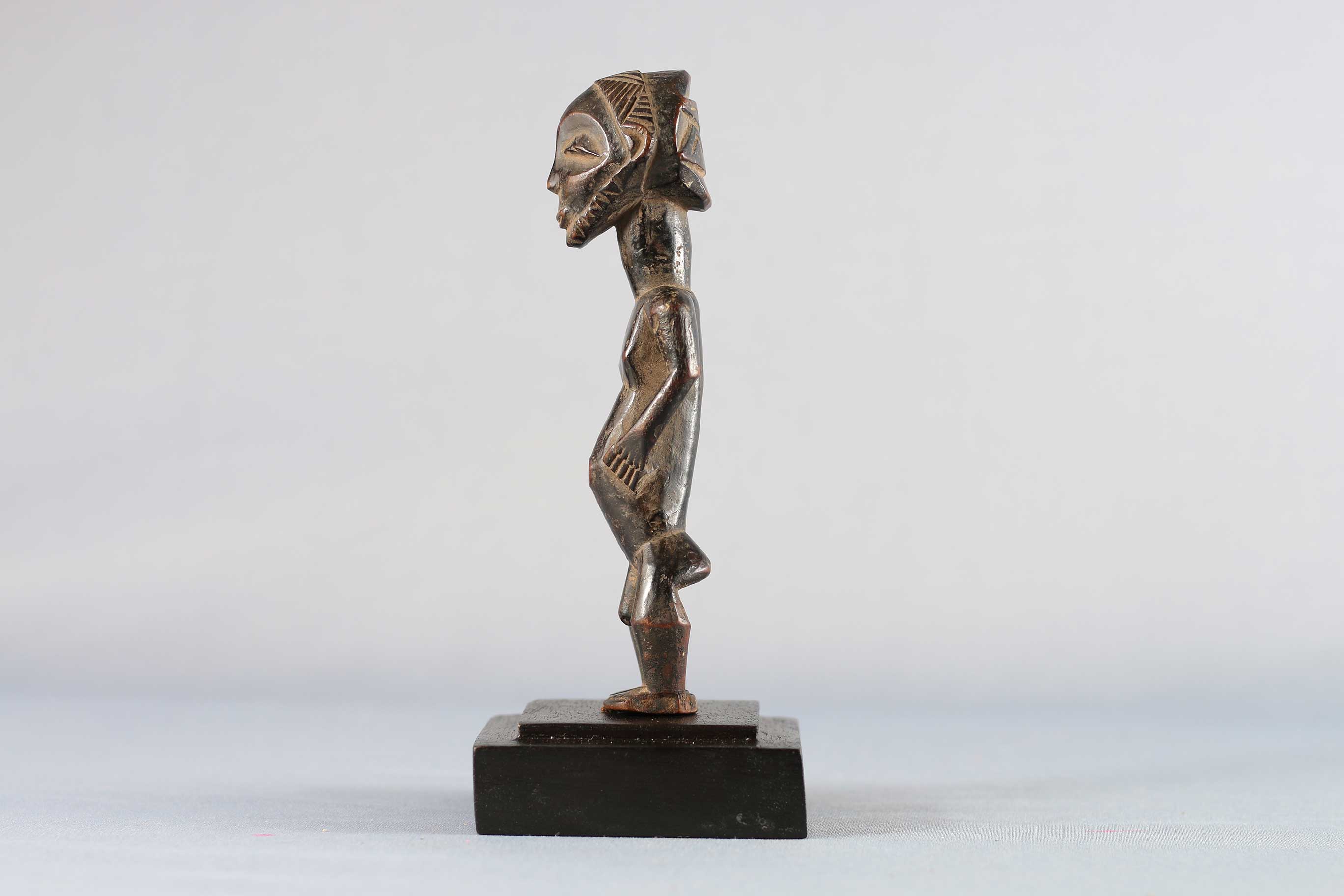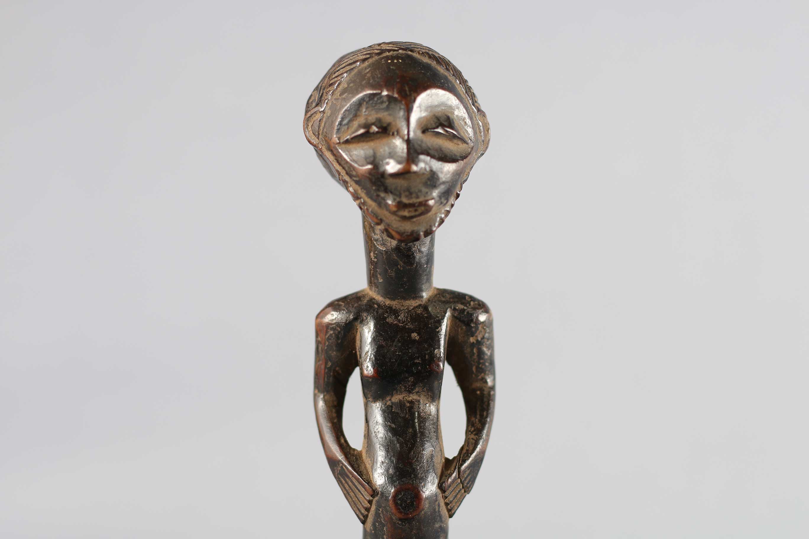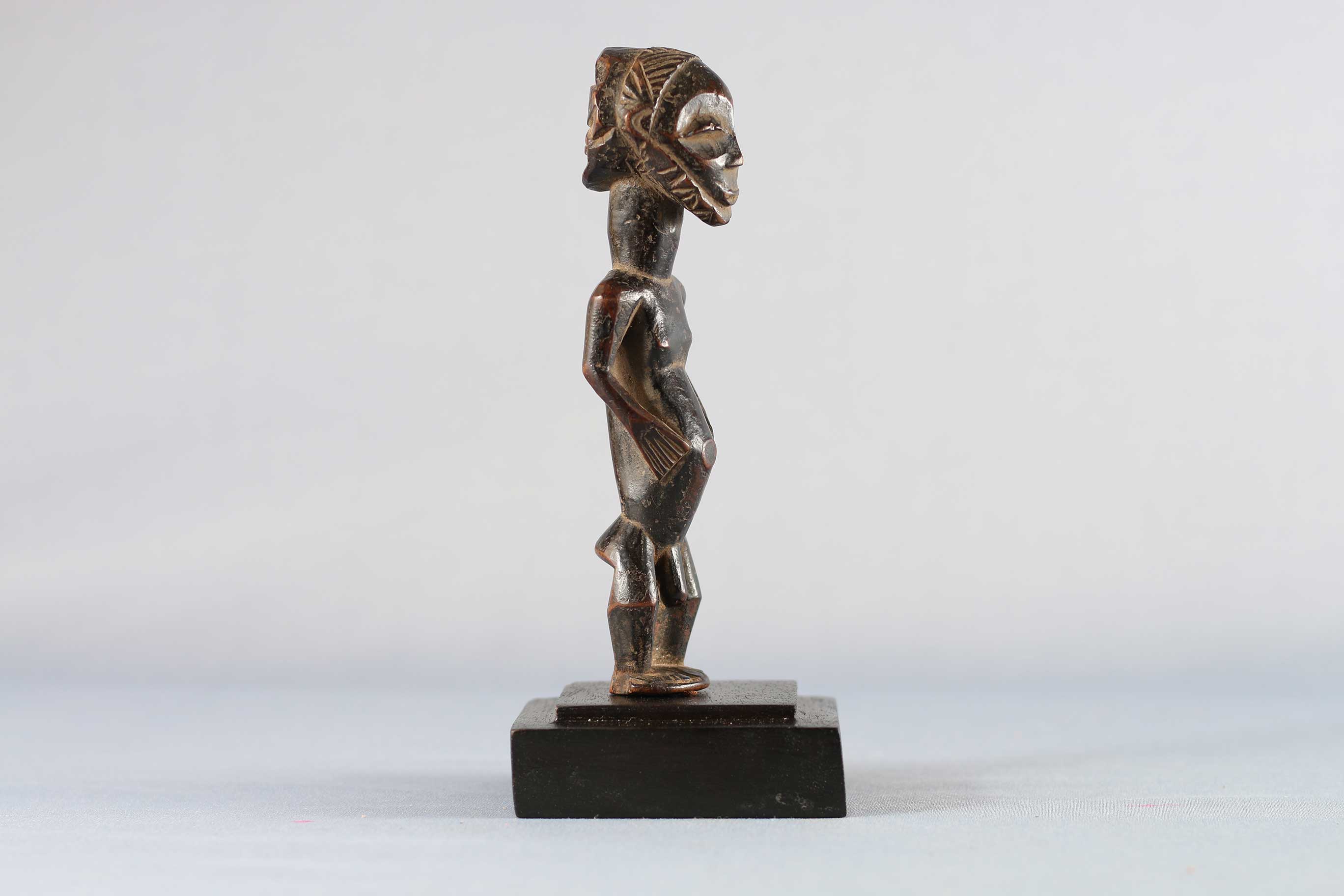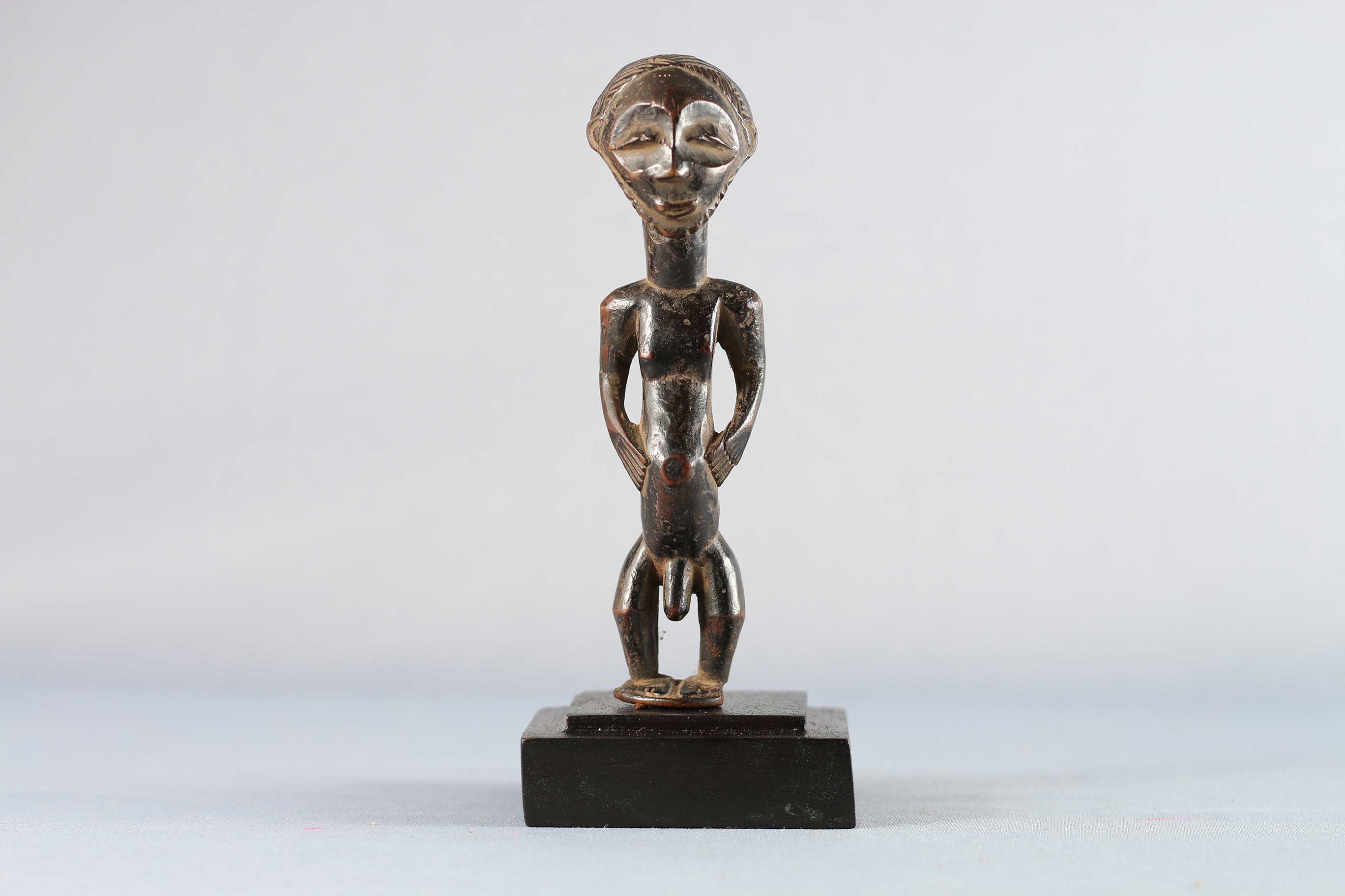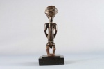 The Hemba are located along the Congo River in the Democratic Republic of Congo. The Hemba art forms are closely linked to Luba art. Hemba sculptures were often used as portraits of specific ancestors, they were beautified according to the moral qualities of the ancestors. This a beautiful traditionally carved Hemba sculpture of a stylized head with an elaborate hairstyle, with hands placed on either side of the belly, it indicates that the ancestor is watching over the clan. It has a dark patina and has visible signs of age.