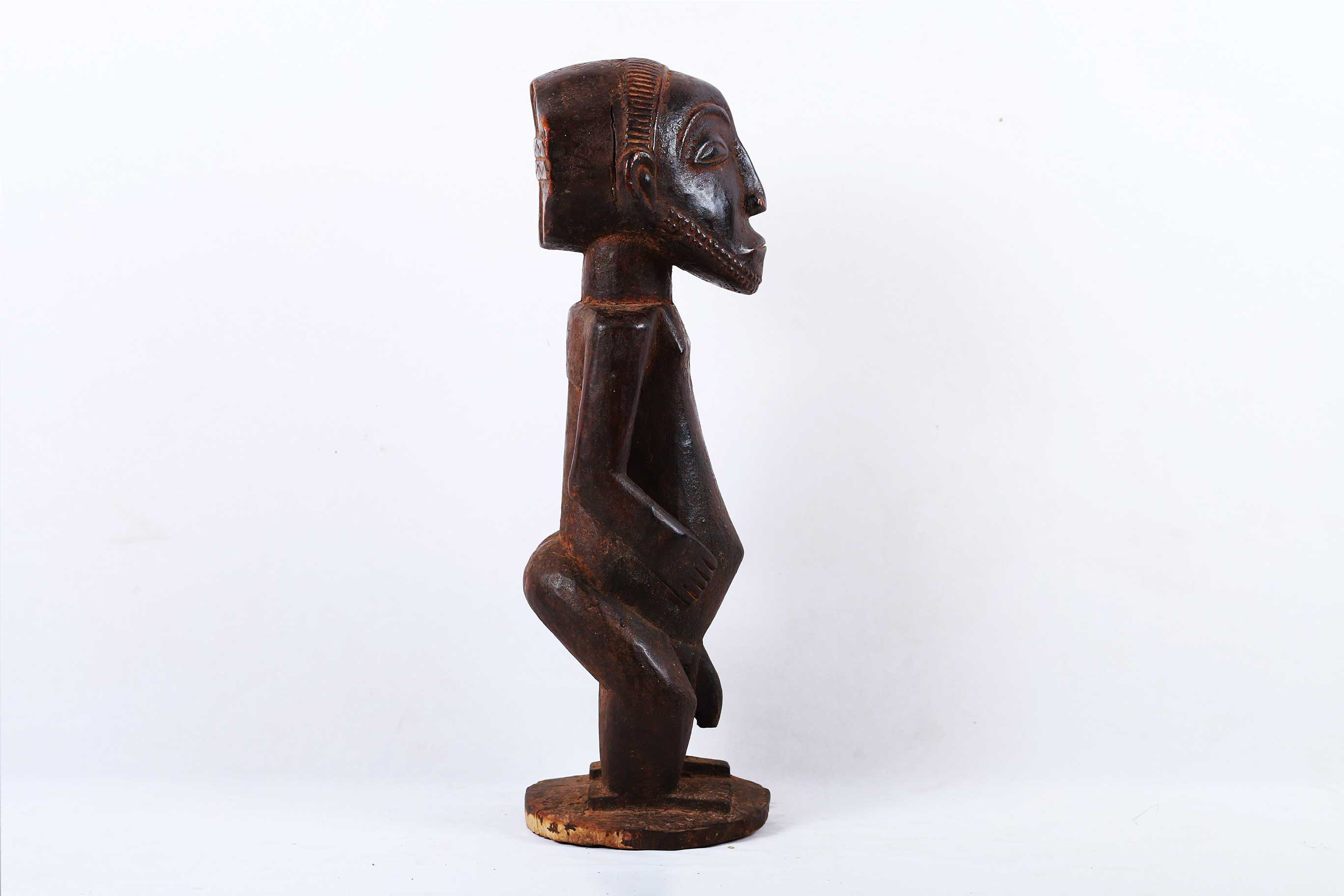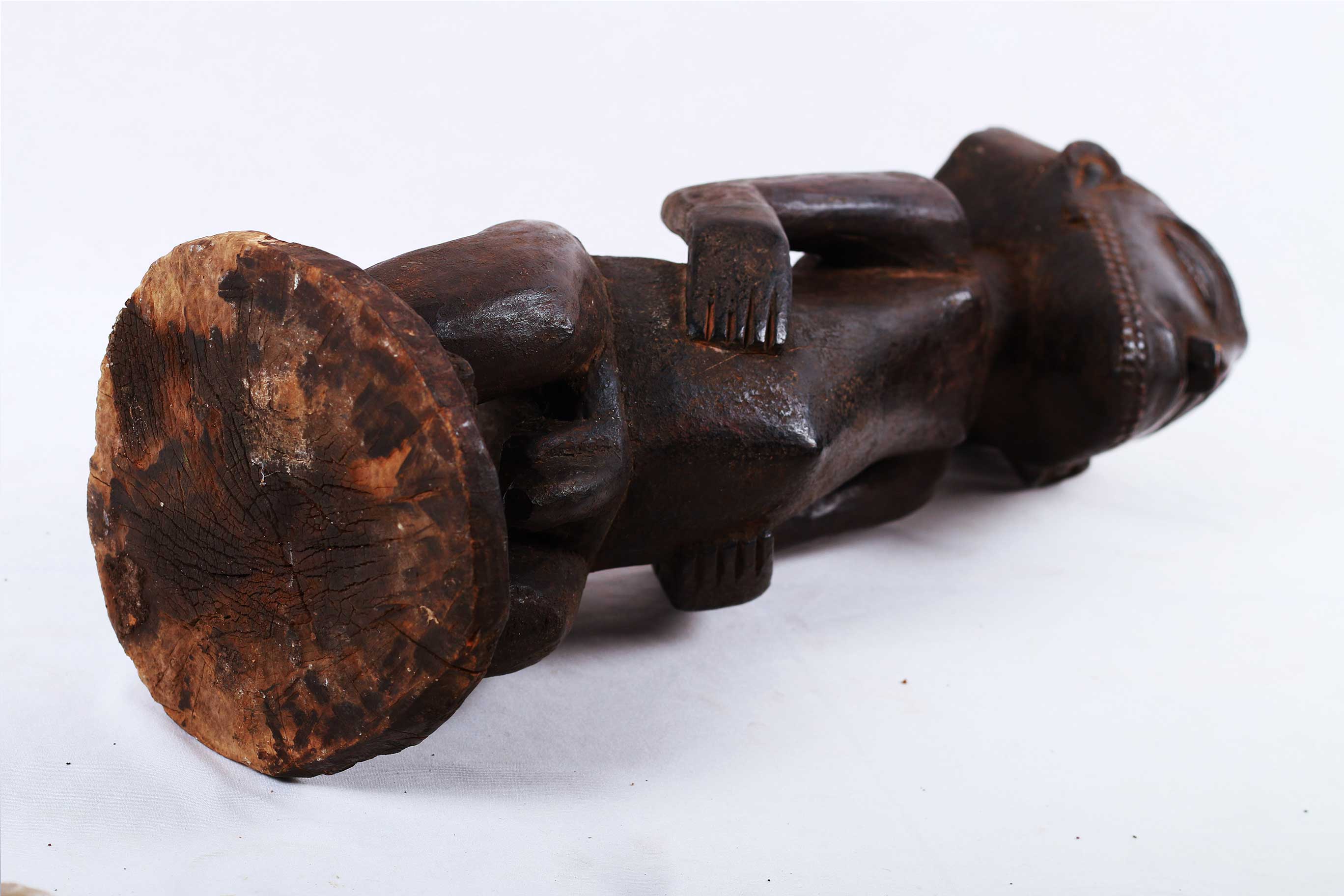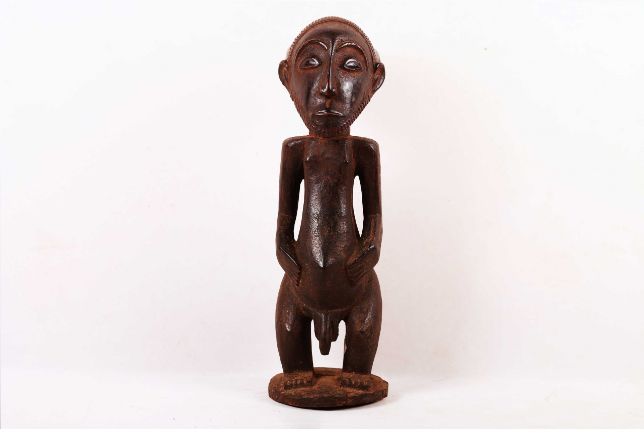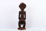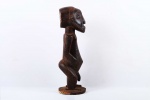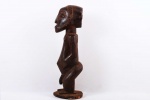 The Hemba are located along the Congo River. The Hemba art foams are closely linked t0 the Luba art. Hemba sculptures are representations of ancestors. Female sculptures are rare and are associated with fertility as well as used for divination purposes. The following sculpture has a black patina and has visible signs of age.