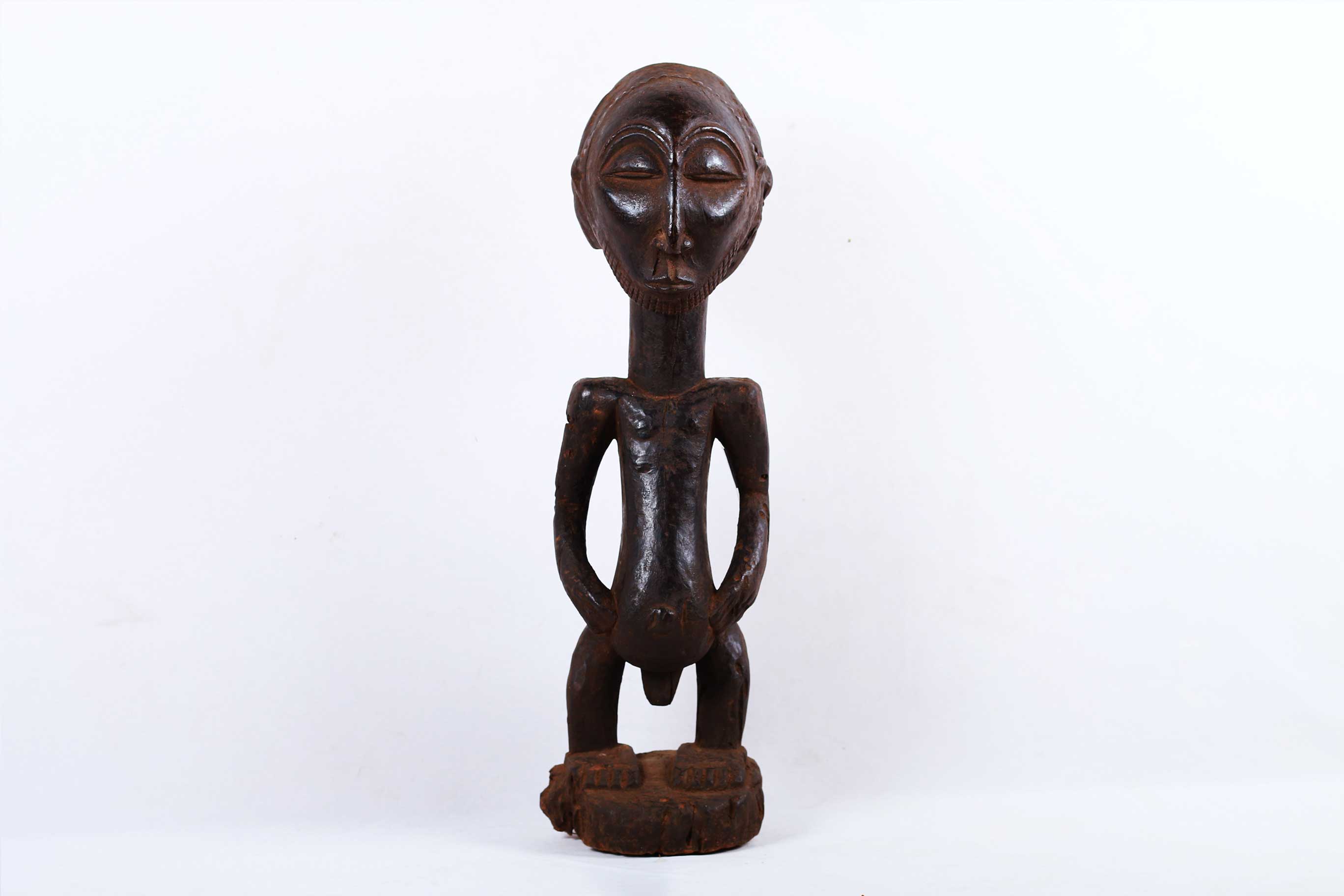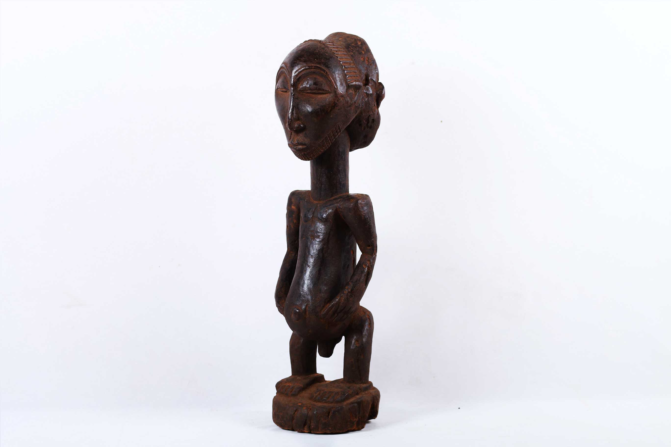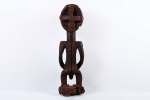 The Hemba are located along the Congo River. The Hemba art foams are closely linked to Luba art. Hemba sculptures are representations of ancestors. Female sculptures are rare and are associated with fertility as well as used for divination purposes. The following sculpture has a black patina and looks visibly old.