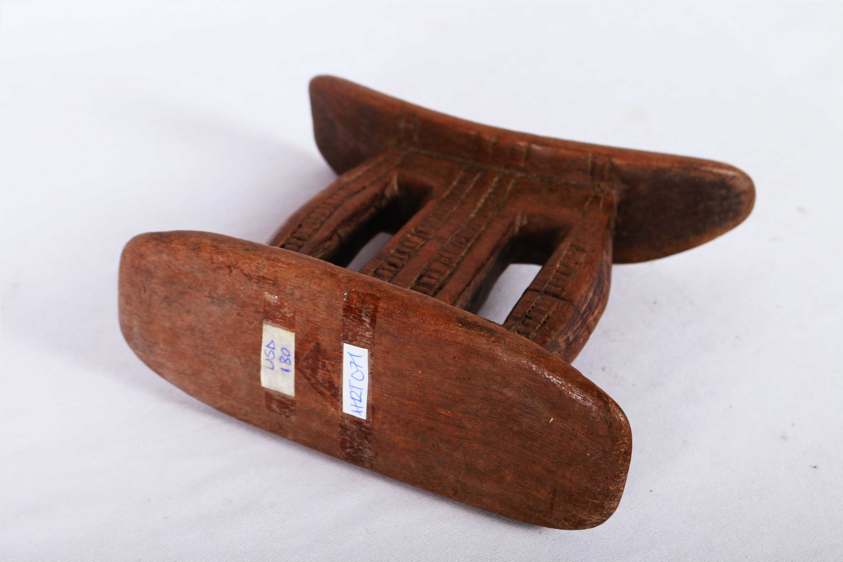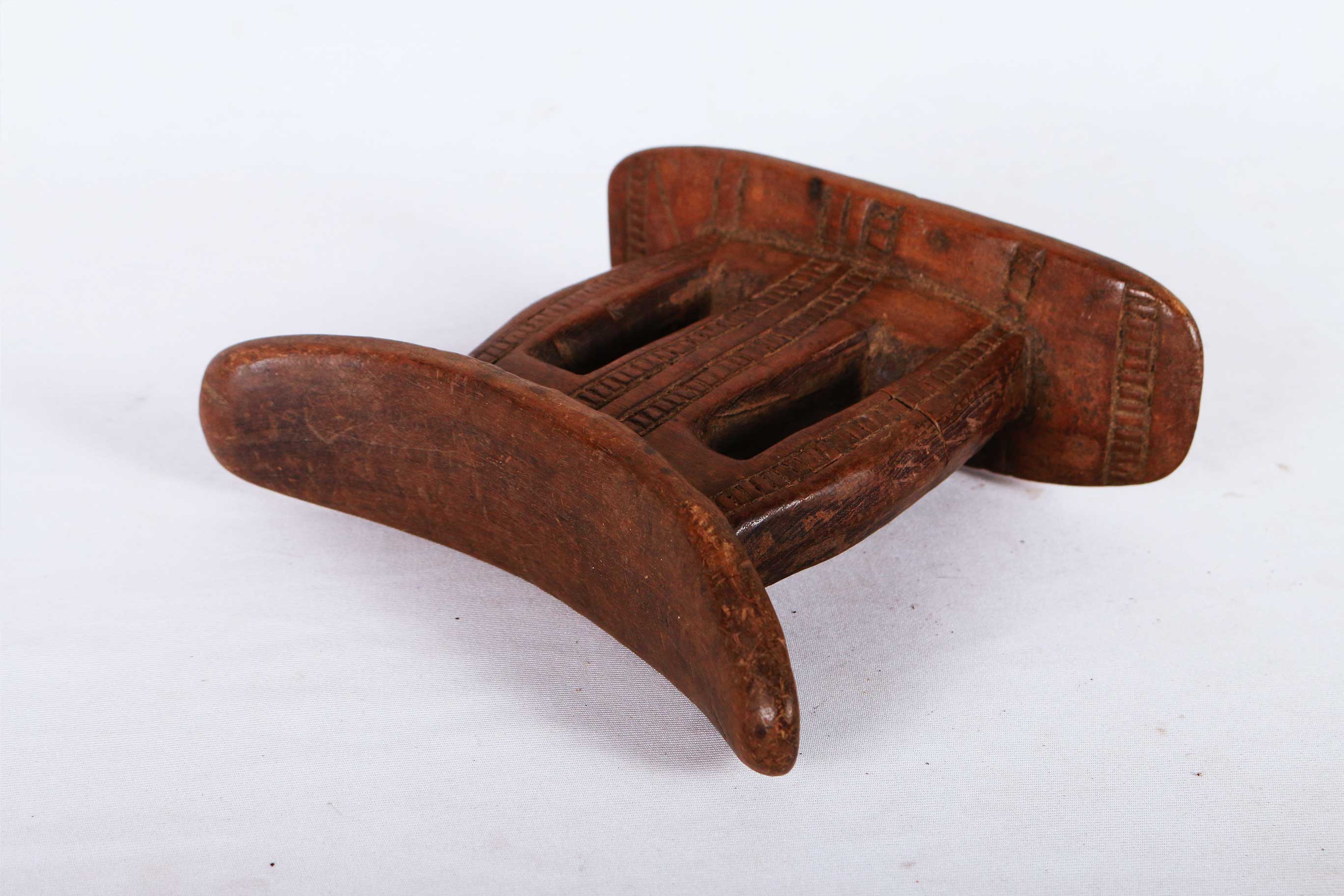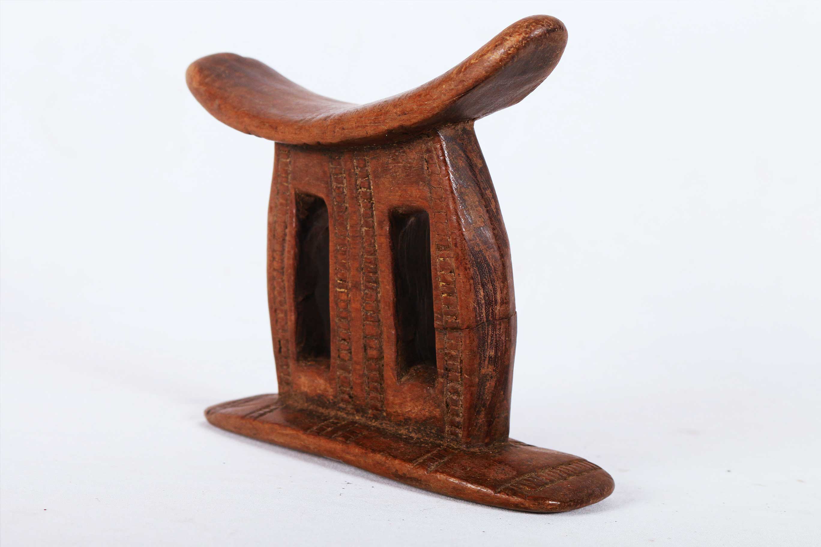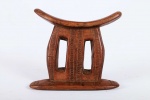 This is a fine block headrest from Ethiopia. Ethiopian headrests epitomize the devotion, culture, spirituality and physical needs of those that produced them. They are grouped into different visual and structural styles, the columned piece with a curved platform and circular base are the most popular, the other is the pillow in the form of a block. The variations in these headrests are plentiful as their uses. The significant representations of these headrests are yet to be researched. Although they are mostly believed to revolve around identity, status and age/gender differentiation.