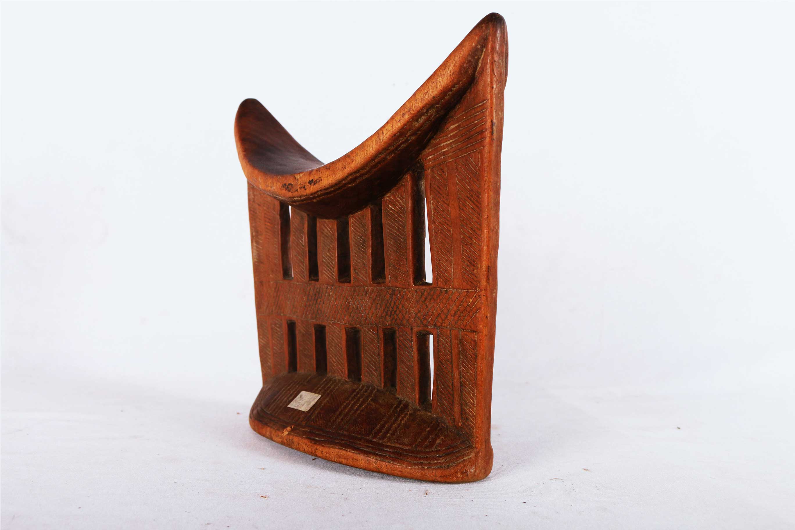 This is a fine block headrest from Ethiopia. Ethiopian headrests epitomize the devotion, culture, spirituality and physical needs of those that produced them. They are grouped into different visual and structural styles, the columned piece with a curved platform and circular base are the most popular, the other is the pillow in the form of a block. The variations in these headrests are plentiful as their uses. The significant representations of these headrests are yet to be researched but they are believed to mostly revolve around identity, status and age/gender differentiation.