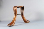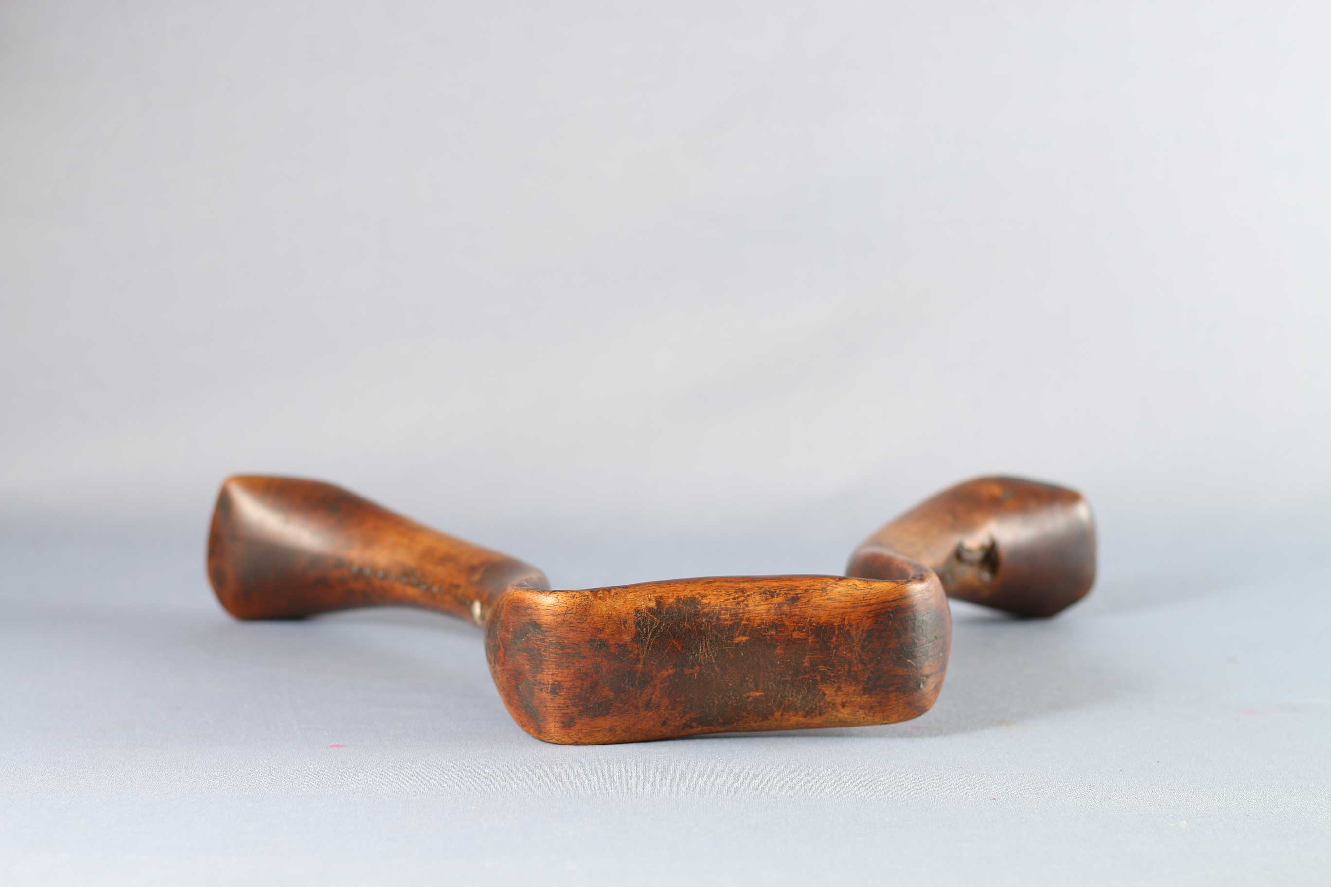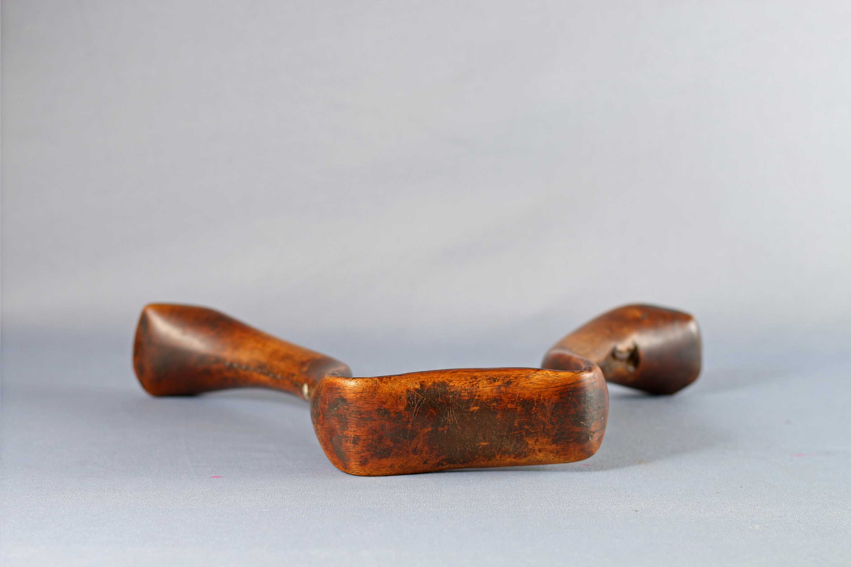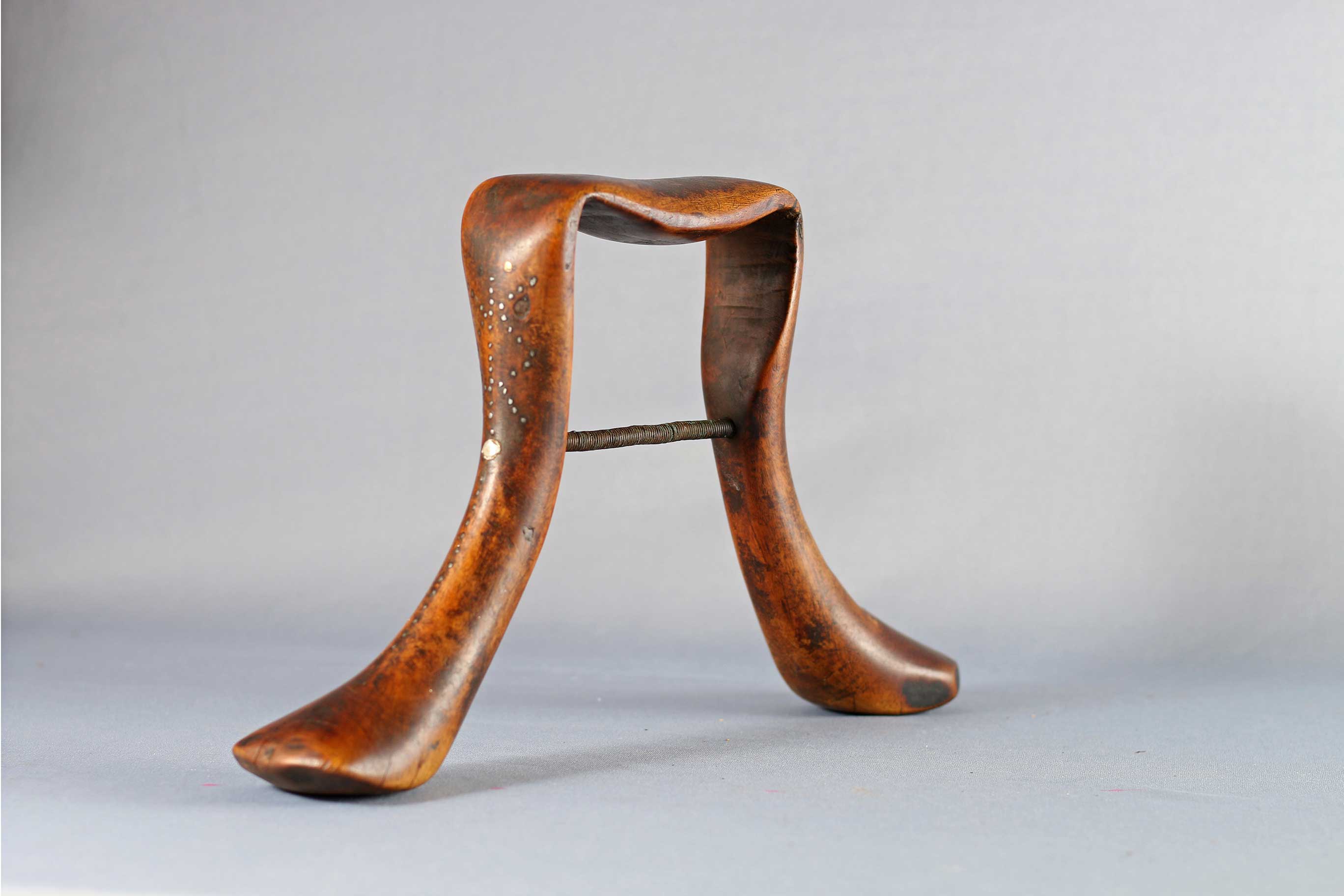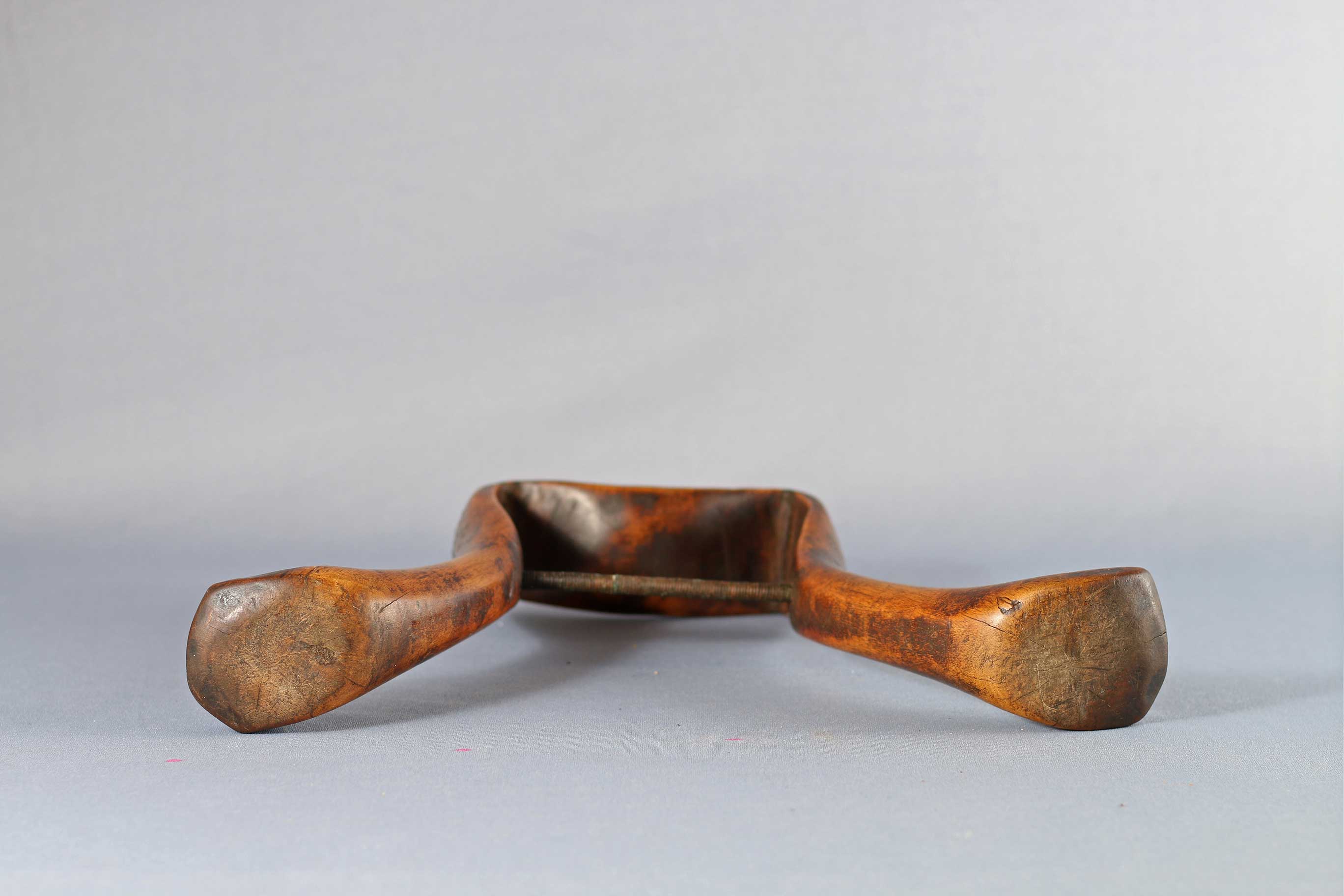This fine headrest is a result of hard work and skill with its superb vertical A-shape. It is also known as a tied headrest because it is gradually tightened with a piece of metal to prevent the legs from splitting until the desired shape is obtained. It was carved in a single piece of wood and could only be owned by an elder aged over 50 years. Such pieces were also paid as dowry by a groom to his bride’s family as a demonstration of respect. This piece could also be inherited by only a man, possibly a brother or elder son of the deceased. Its design is similar to those of Pokot as a result of intermingling. It has a brown wonderful patina, clear signs of usage and old age.