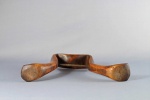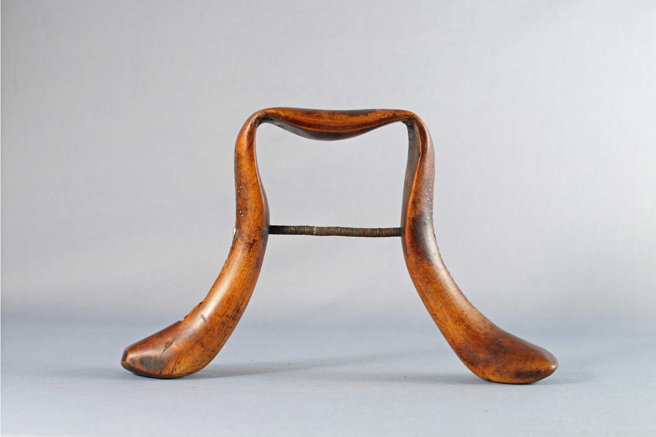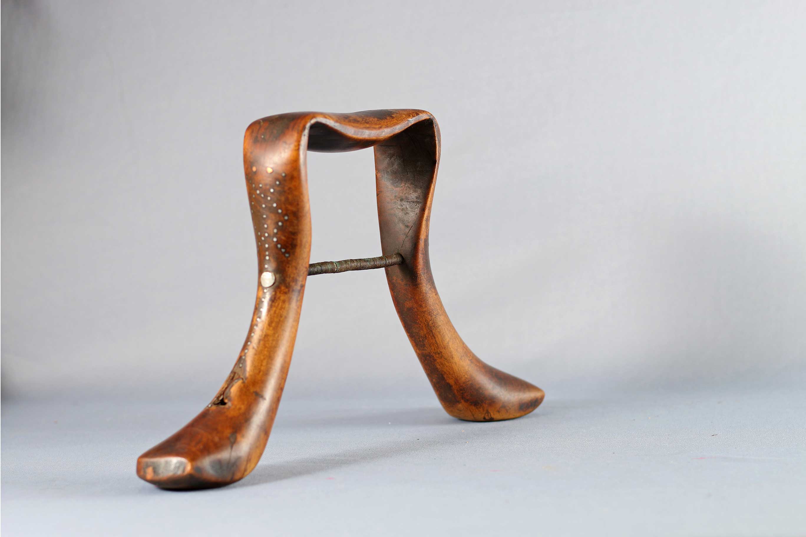 This is an A-shaped headrest from the Karamajong, an ethnic group of agro-pastoral herders living mainly in north-eastern Uganda. Headrests appear like simple pieces of craftmanship but they are of aesthetic value. They possess significance value and they have artistic status, they mean more than just mere objects. These pillow-like objects are some of the most distinctive East African artifacts. Headrests symbolized high social status or magical power such as the gift of foretelling. Headrests are also traditionally believed to protect elaborated headdresses, headrests are no longer a feature of modern life in this region.